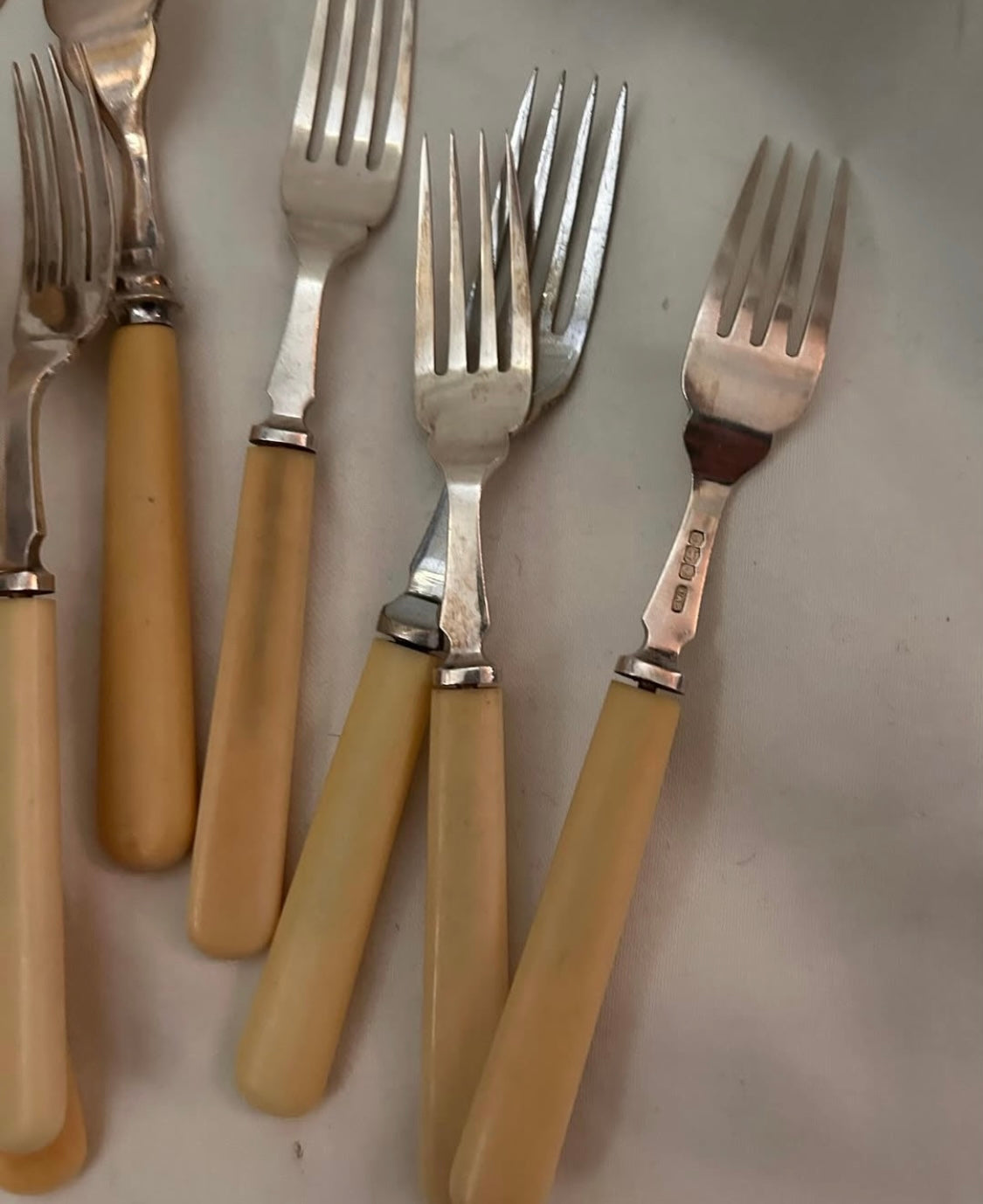 10 forks and 7 knives all fully hallmarked silver with bone handles.