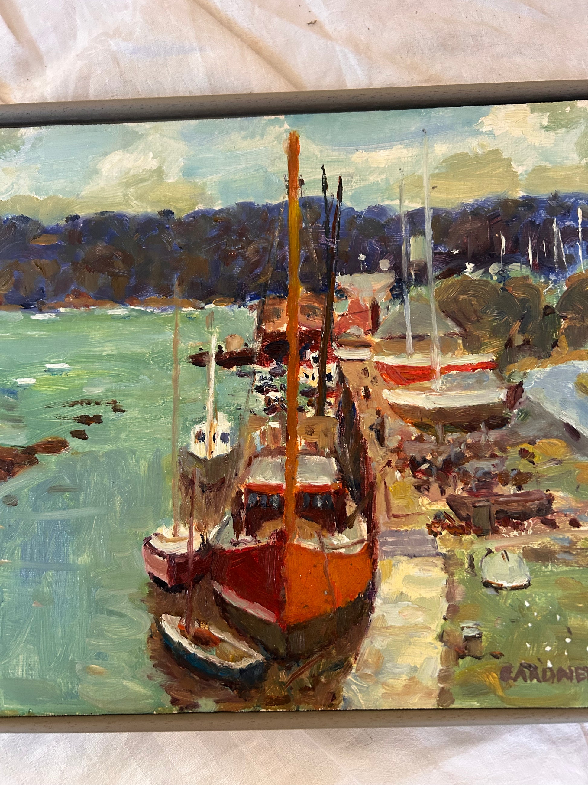 Boxed framed and original oil painting of some beautiful boats in a harbour measuring 31 x 24 cm