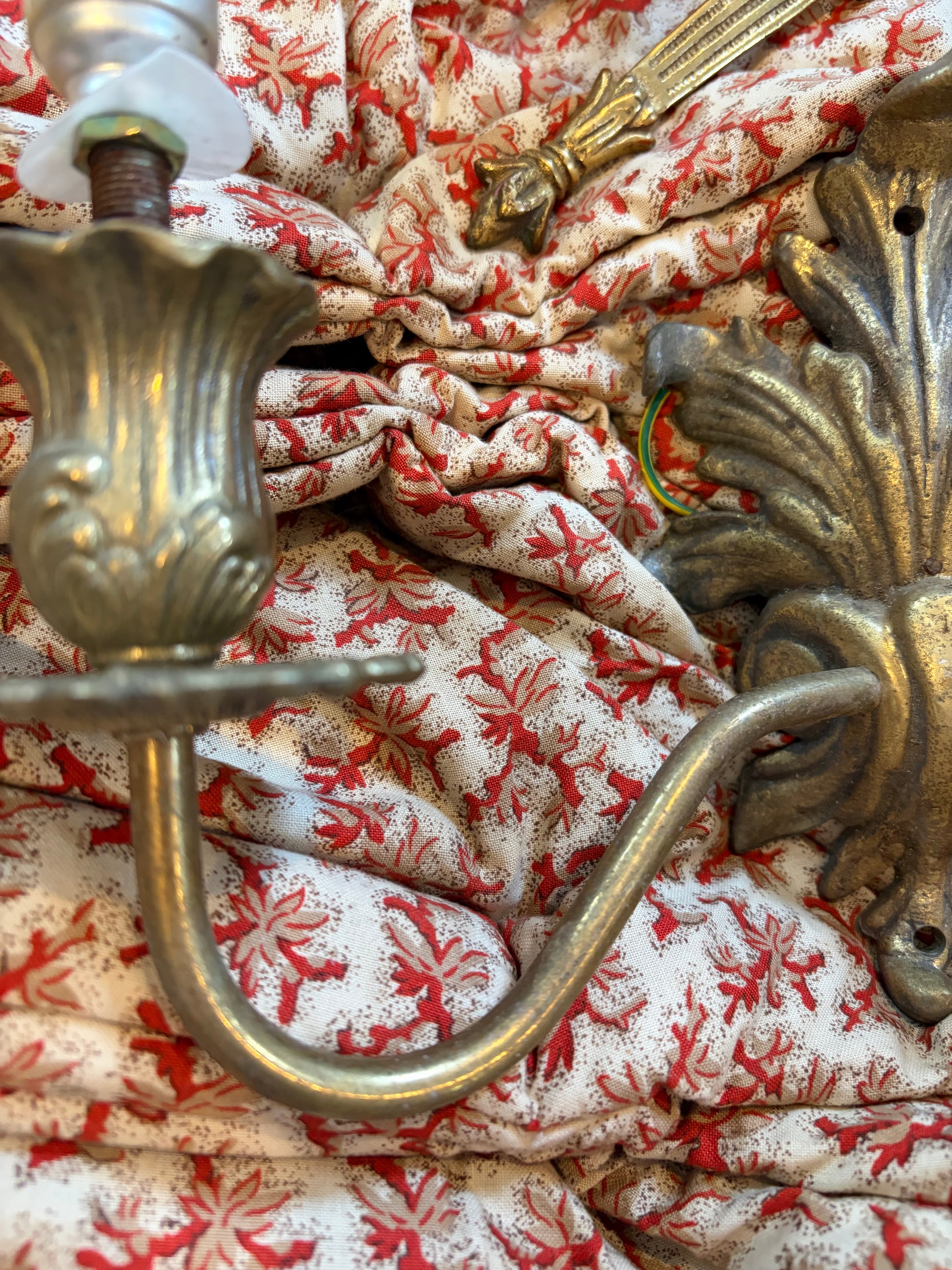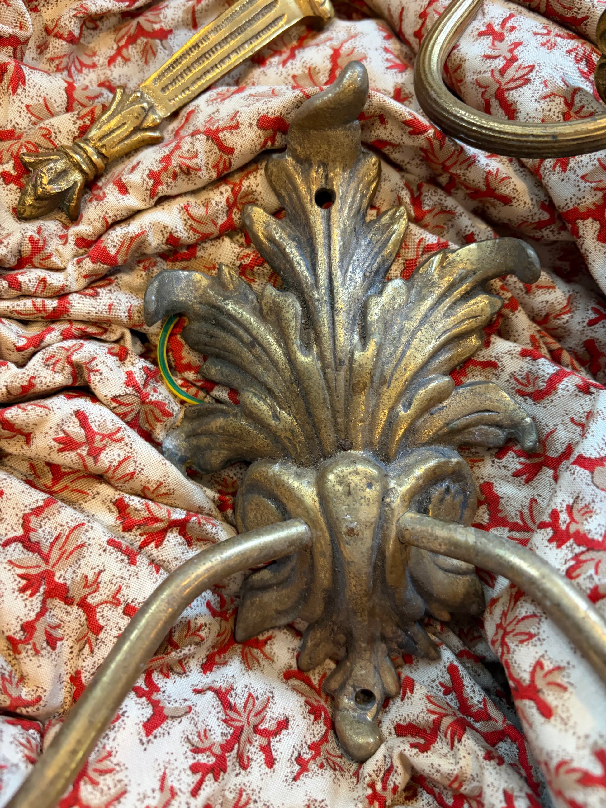 A pair of brass wall light approximately 25 cm across height 30 cm projection from the wall 15 cm. Not a pair, but both good quality heavy brass £10