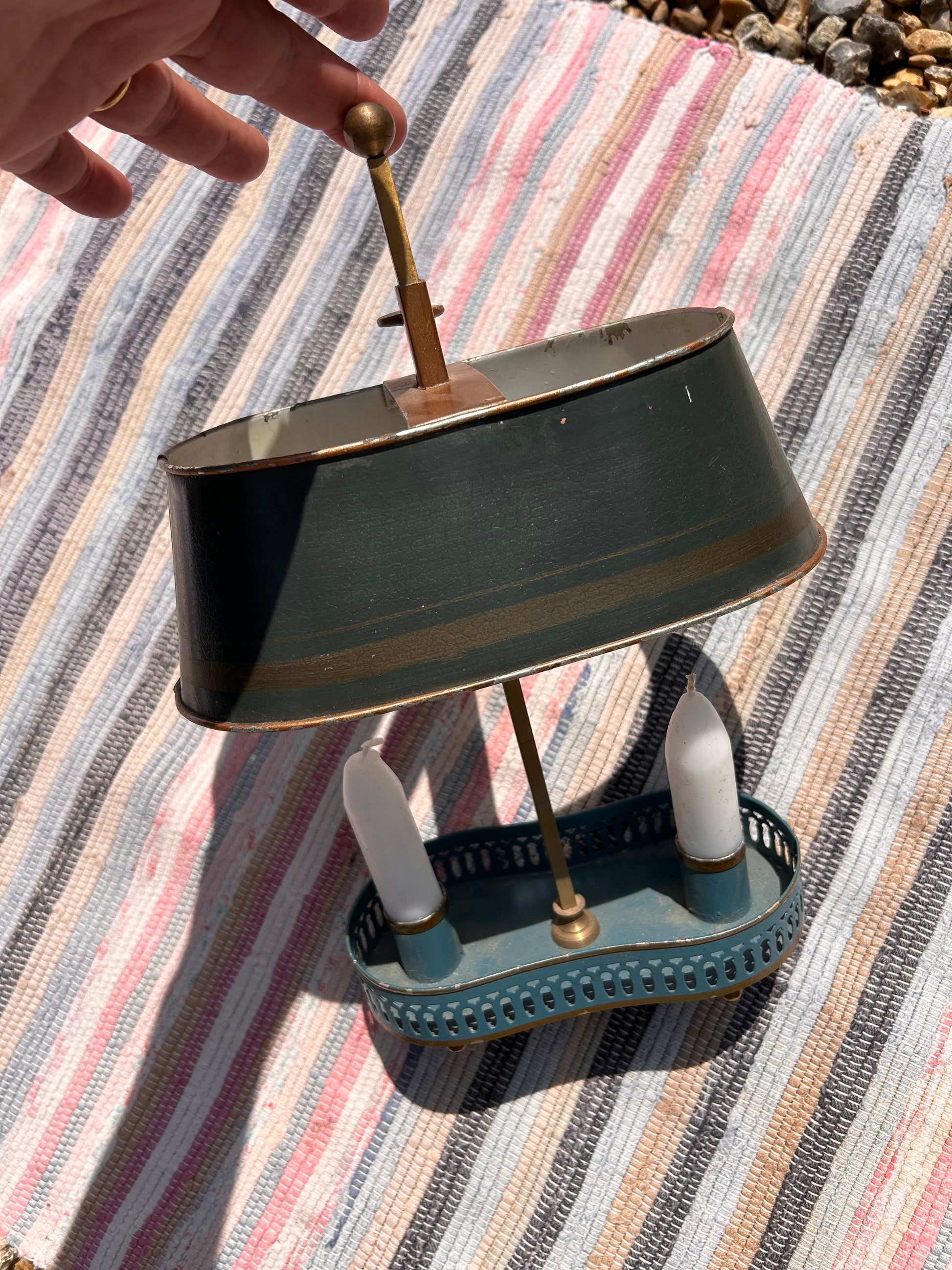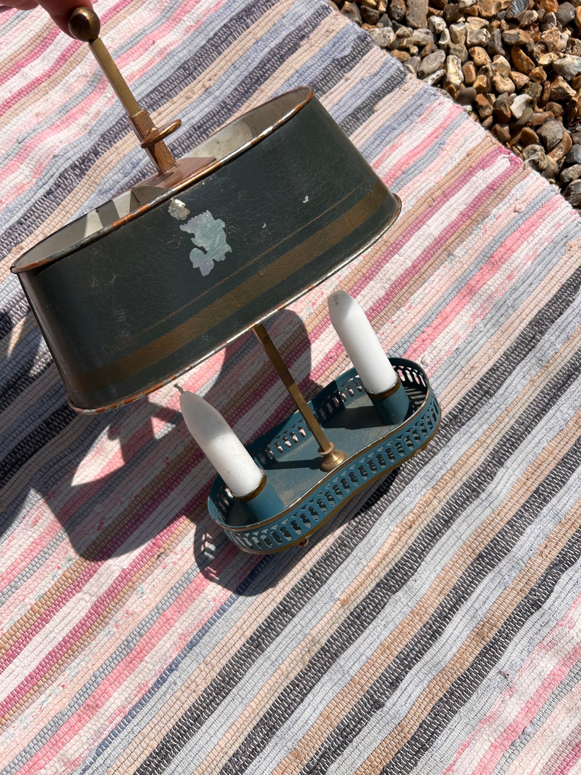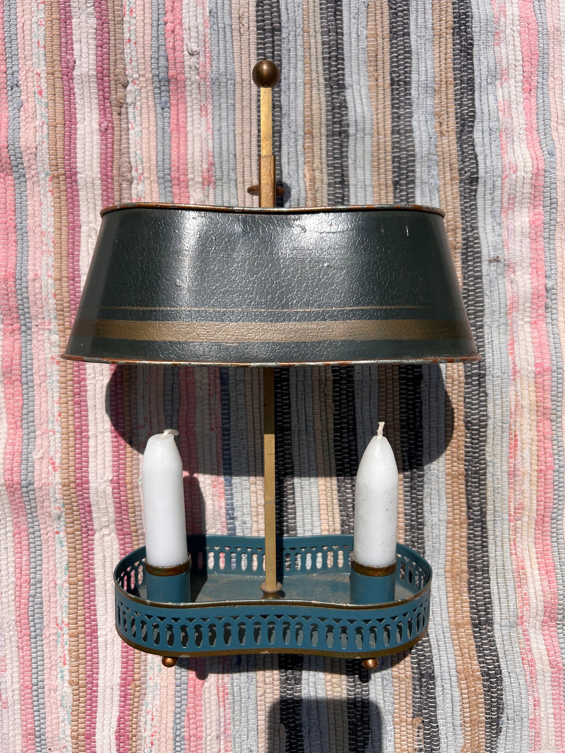 Early 20th Century Toleware Double Candle Holder Lamp. Handy item as the shade moves up and down to cover the candle tops whatever the height.