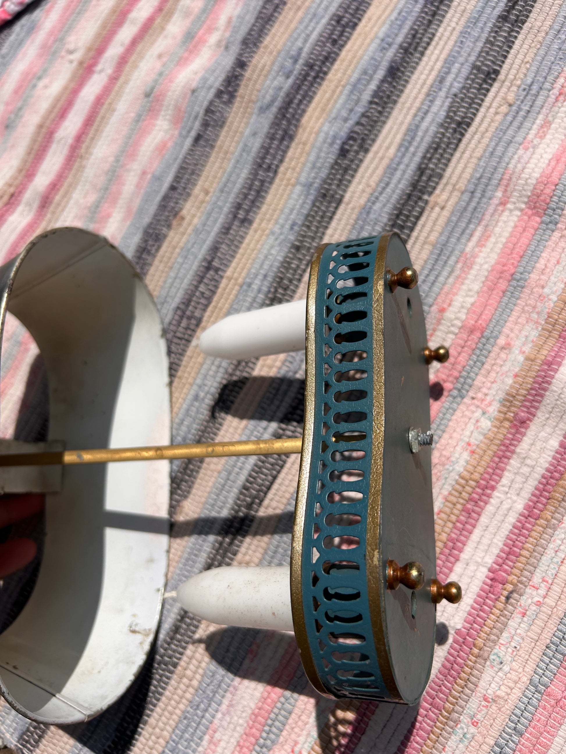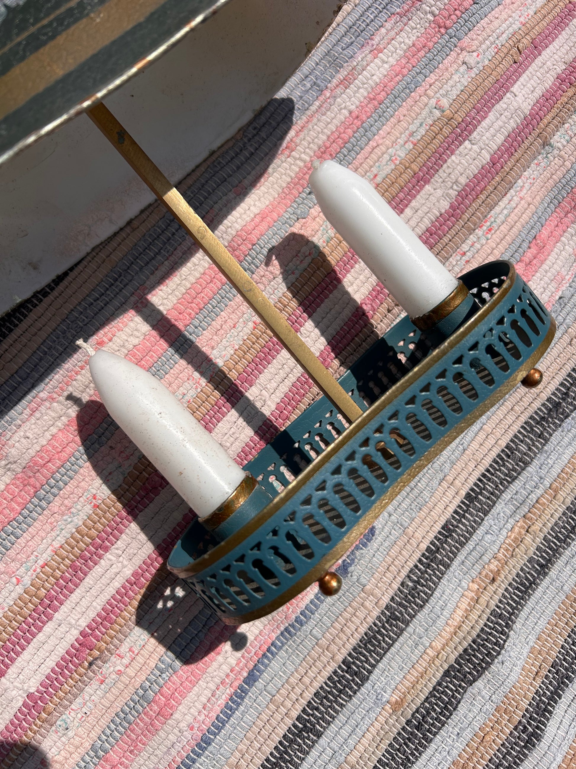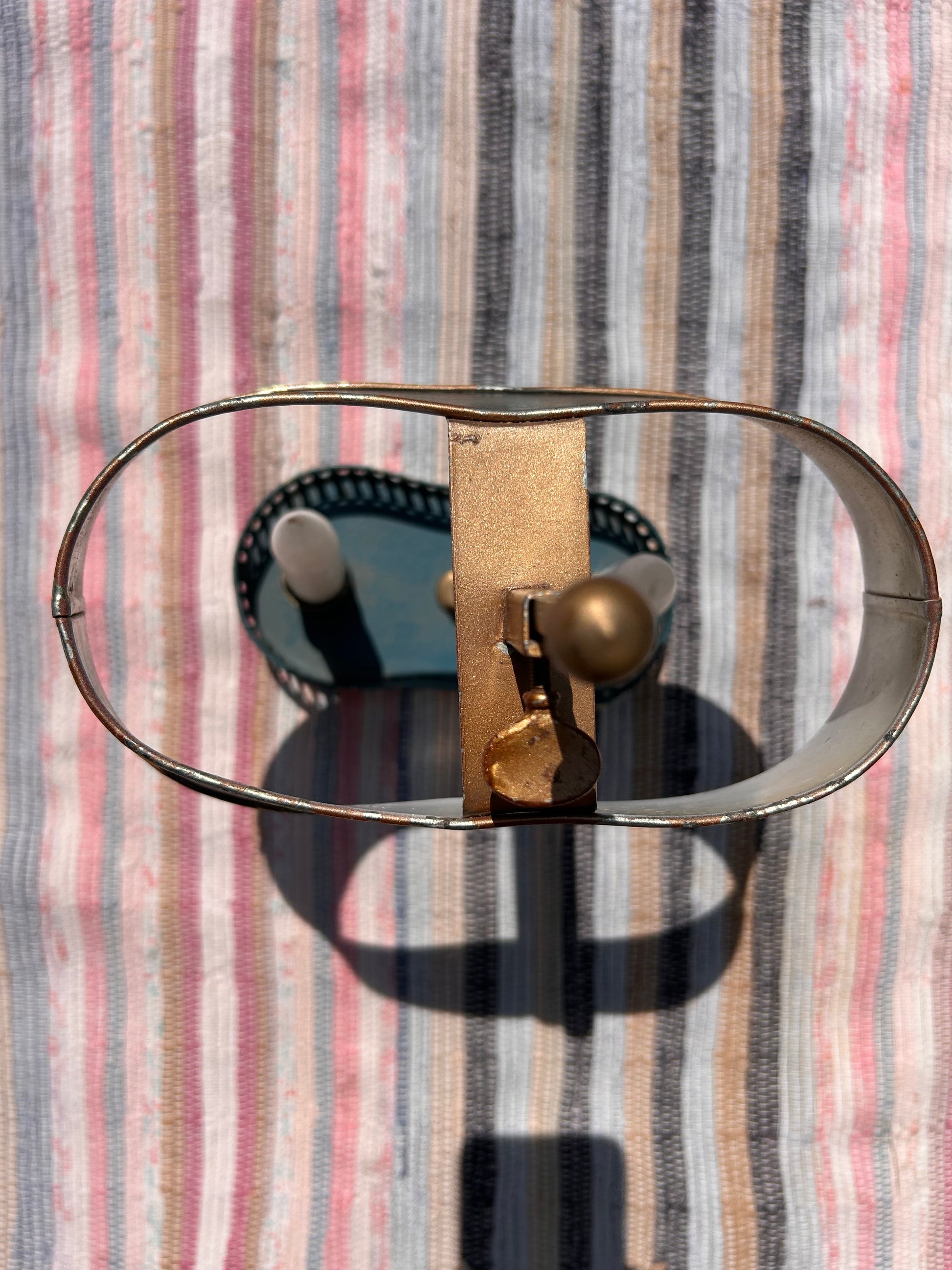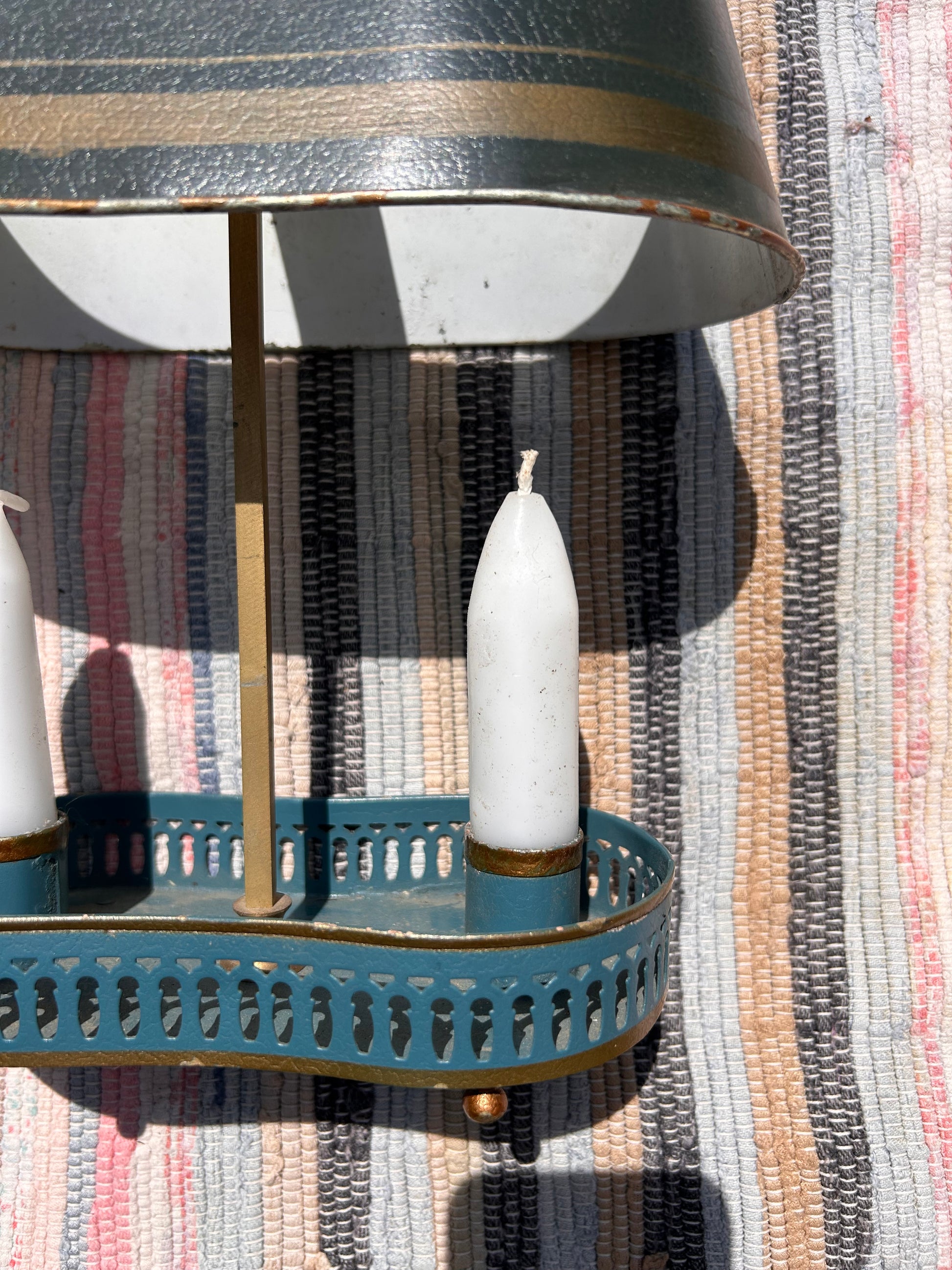 Early 20th Century Toleware Double Candle Holder Lamp. Handy item as the shade moves up and down to cover the candle tops whatever the height.