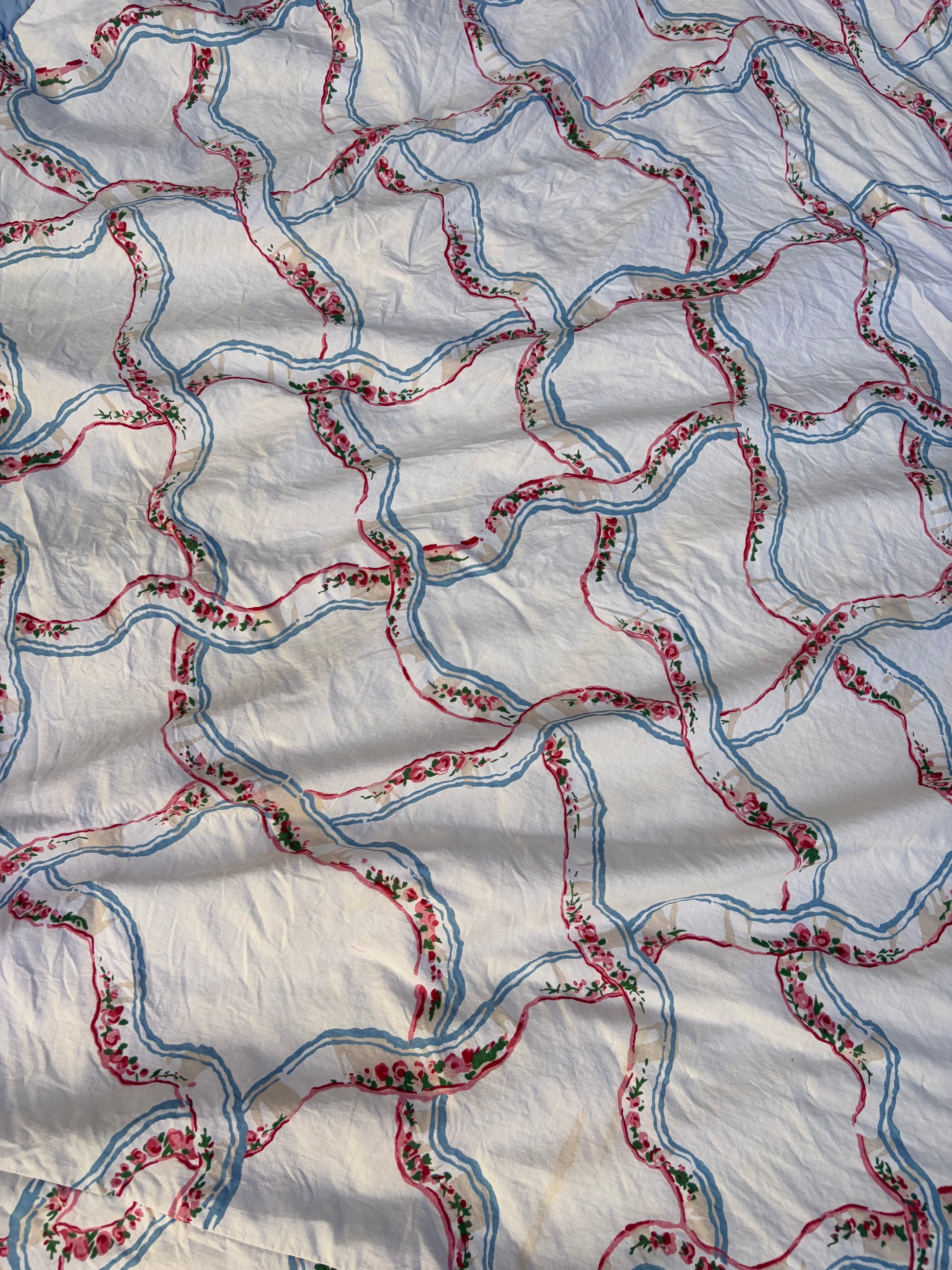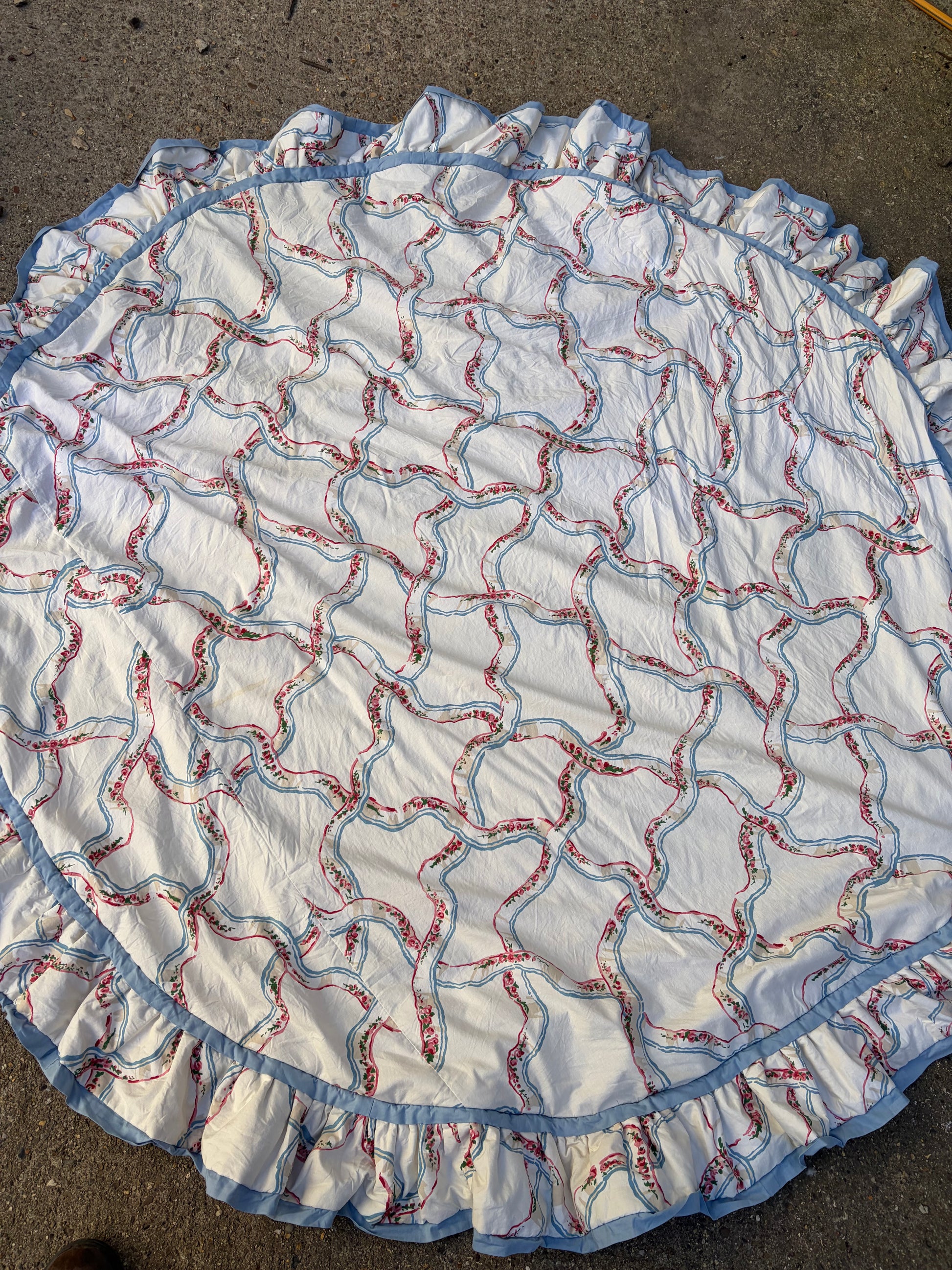 175 cm diameter a double frill at the edge this is a thick lined and interlined circular tablecloth