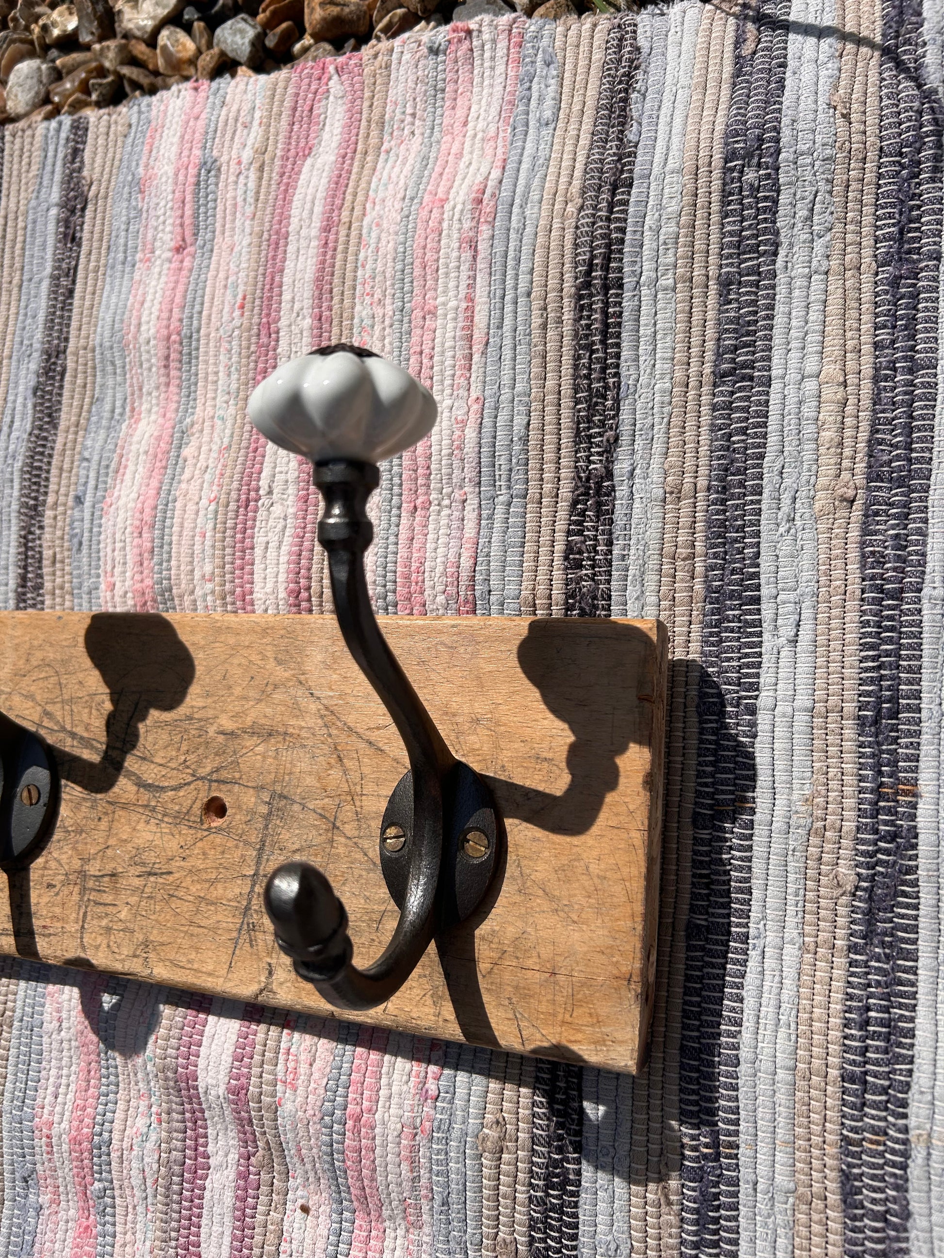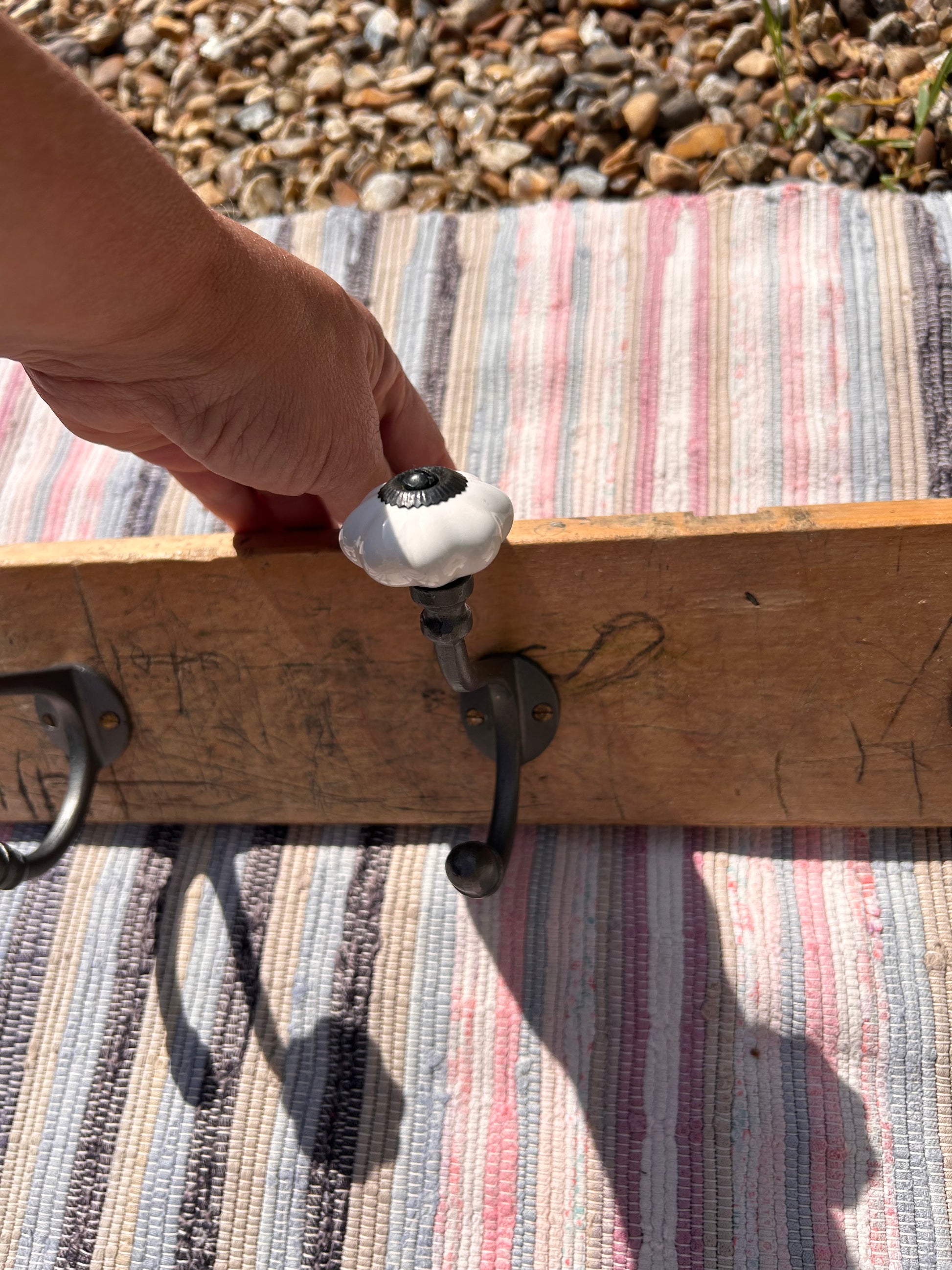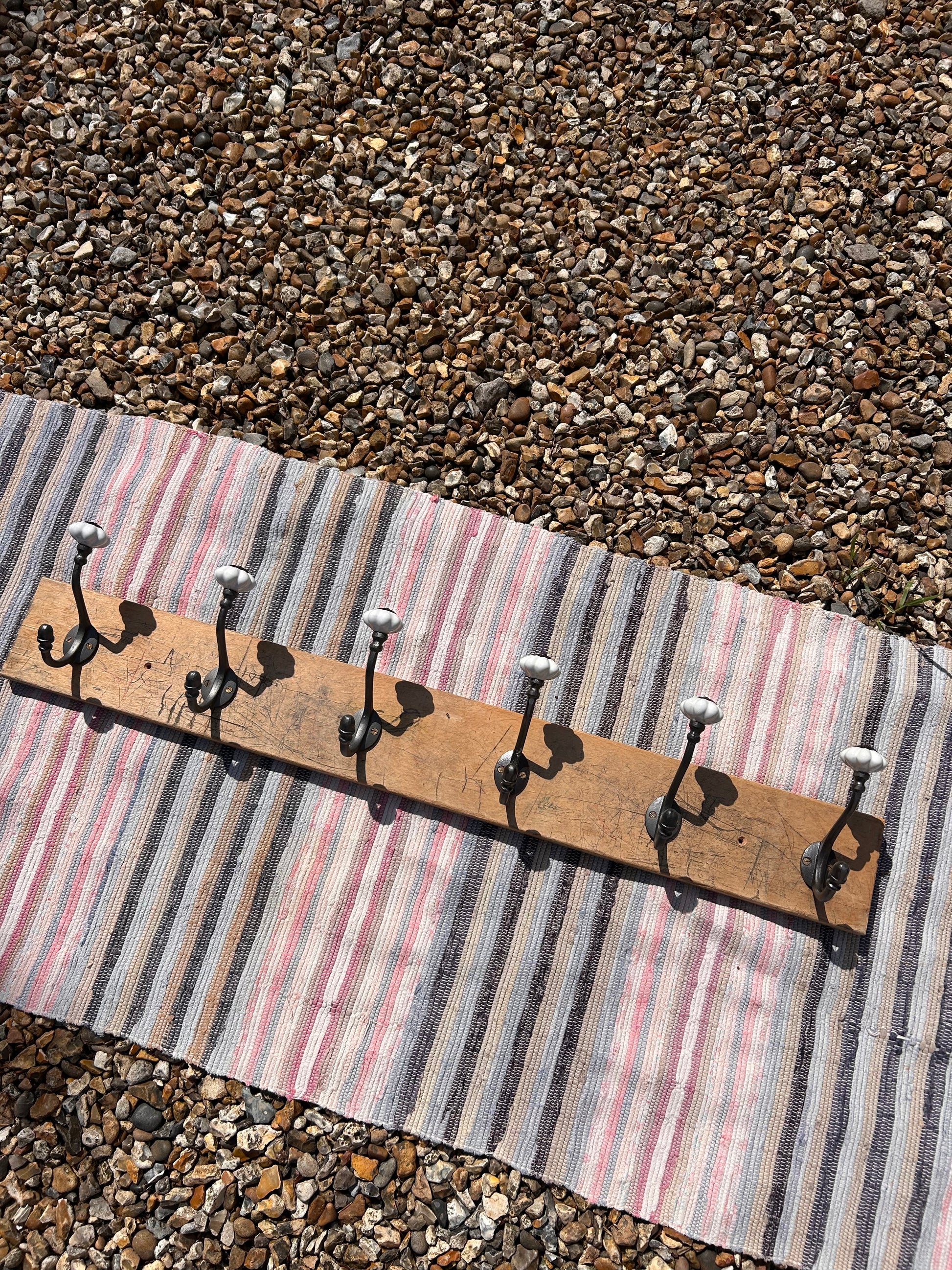 91 cm long six beautiful coat hooks with porcelain tops the width of the plank they are on is 11cm