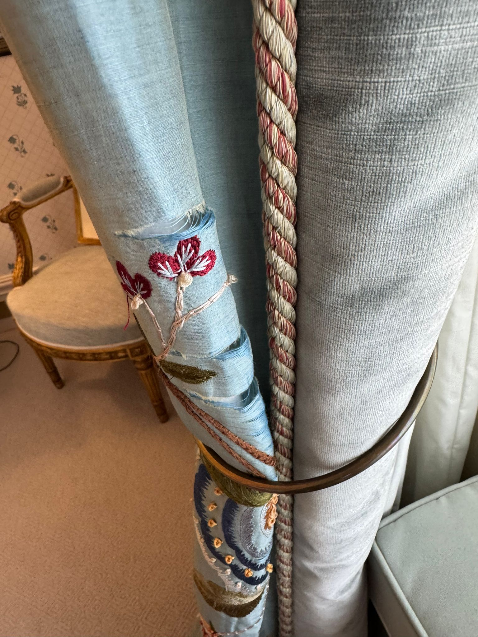 3 pairs of curtains, all of them are beautiful heavily embroidered Colefax and Fowler floral silk. These were ordered for a house in London, when Thomas Starzewski Was the interior designer for my client/ 20 years old! But they are in good condition with the natural signs of wear and tear that you would have over 20 years however the material & style timeless.