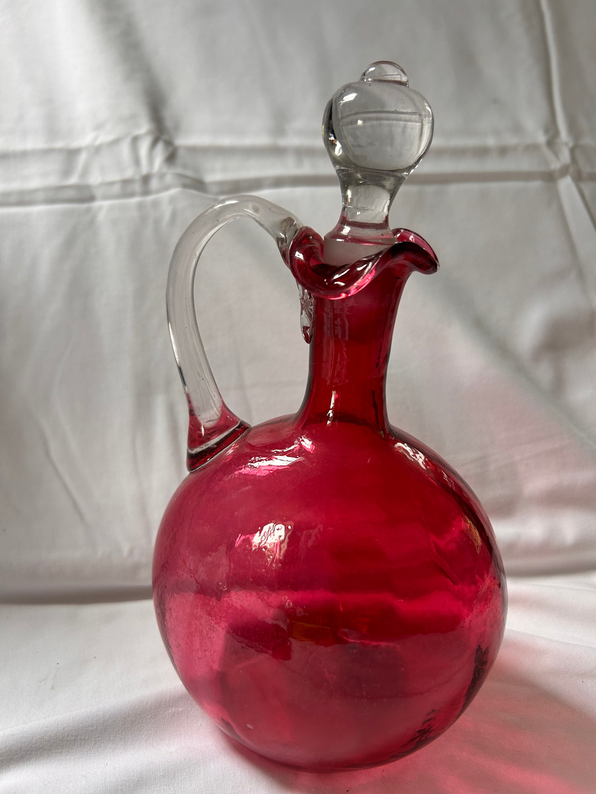 Cranberry glass decanter 25 cm tall. With stopper £25.