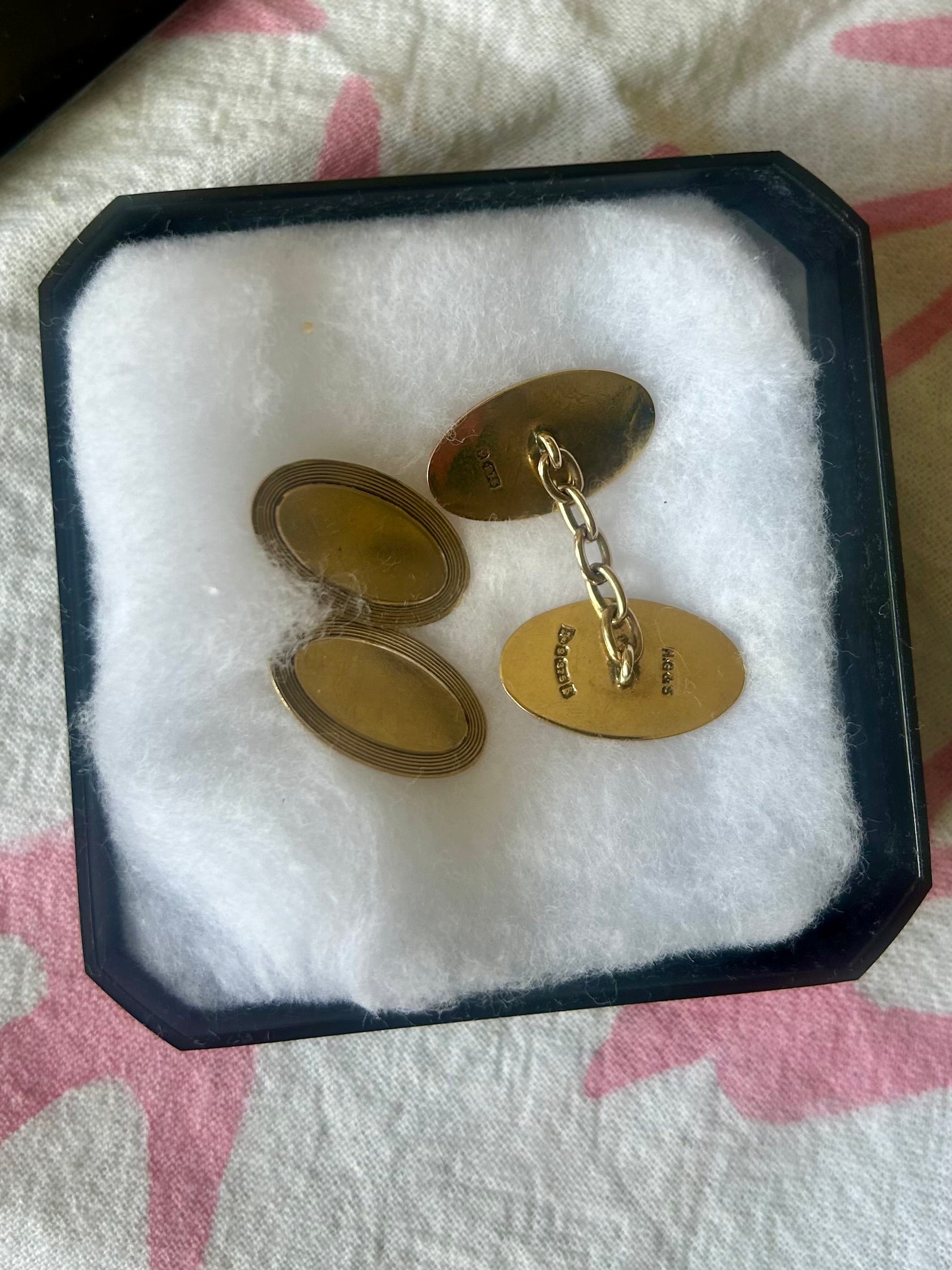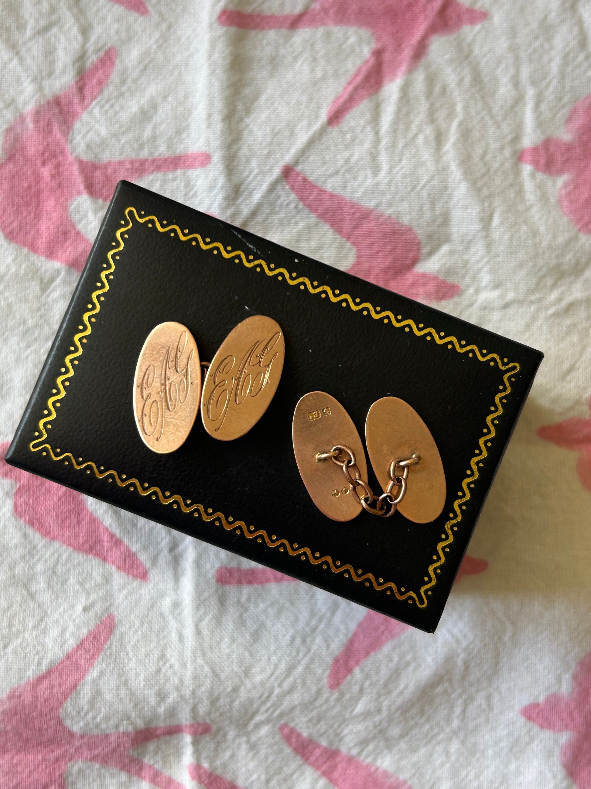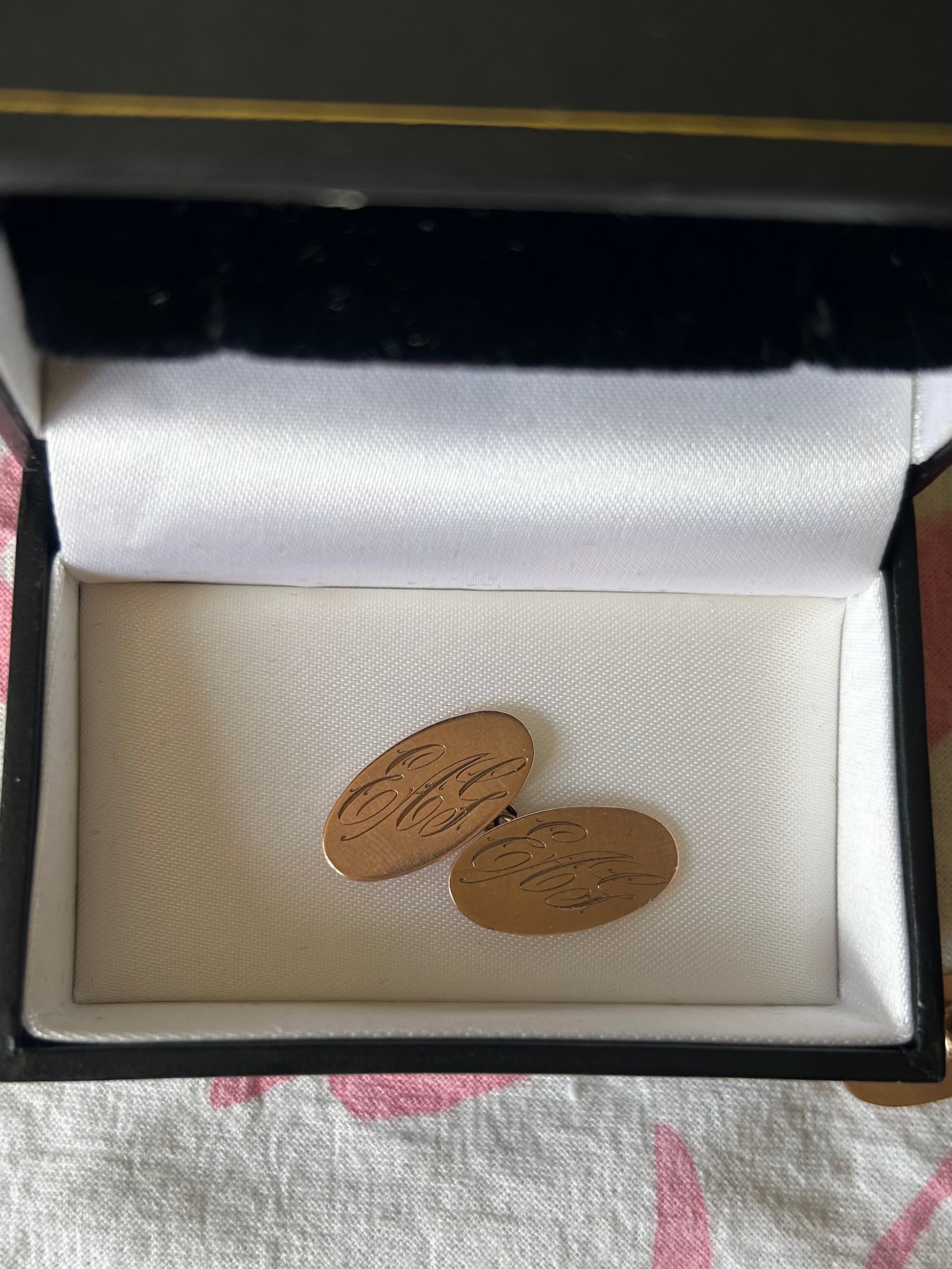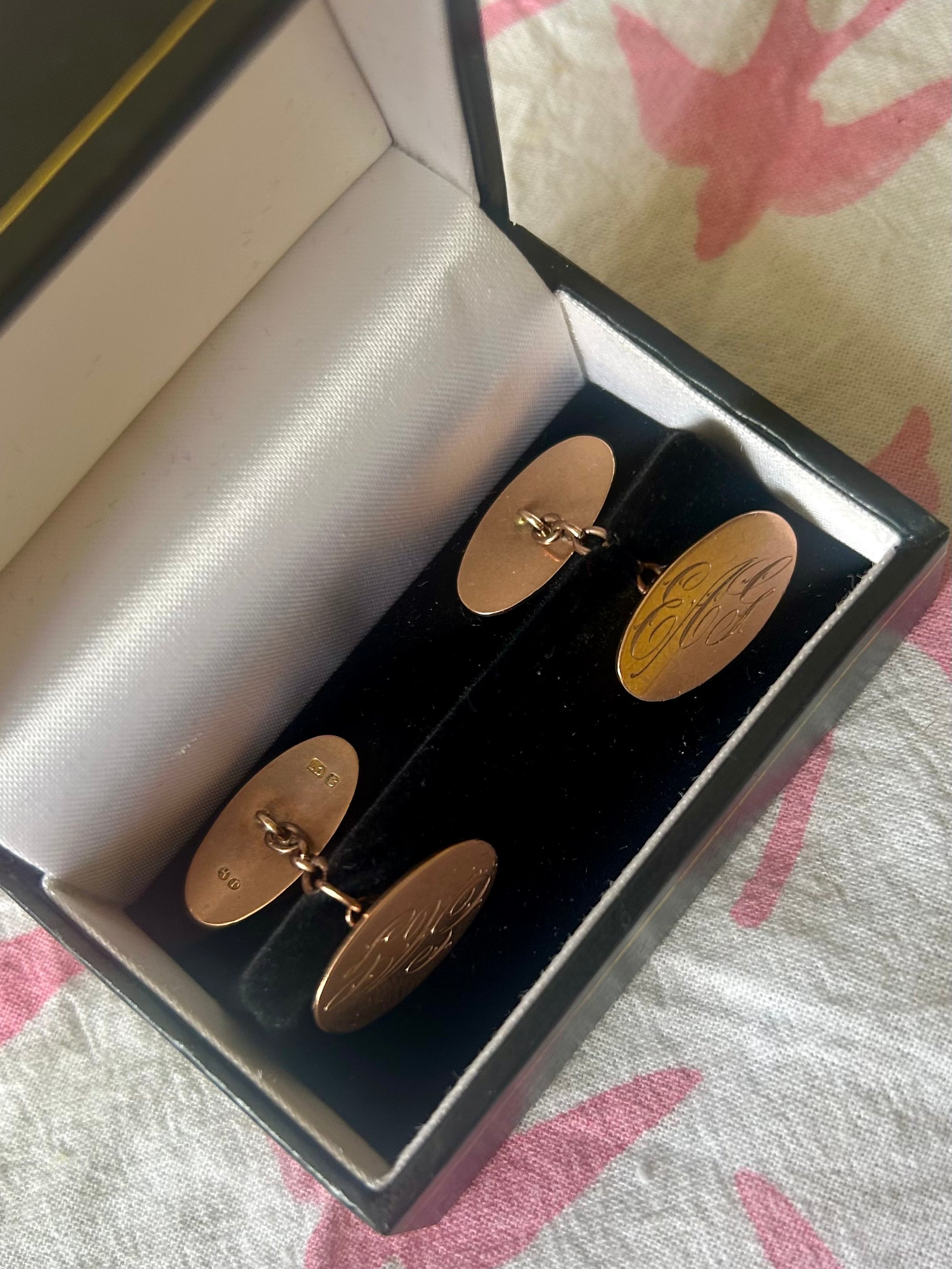 I have two pairs of these smart cufflinks, one is a special pair of antique rose gold cufflinks engraved with the initials EAG, and the other are yellow gold with lovely detailing around the edge