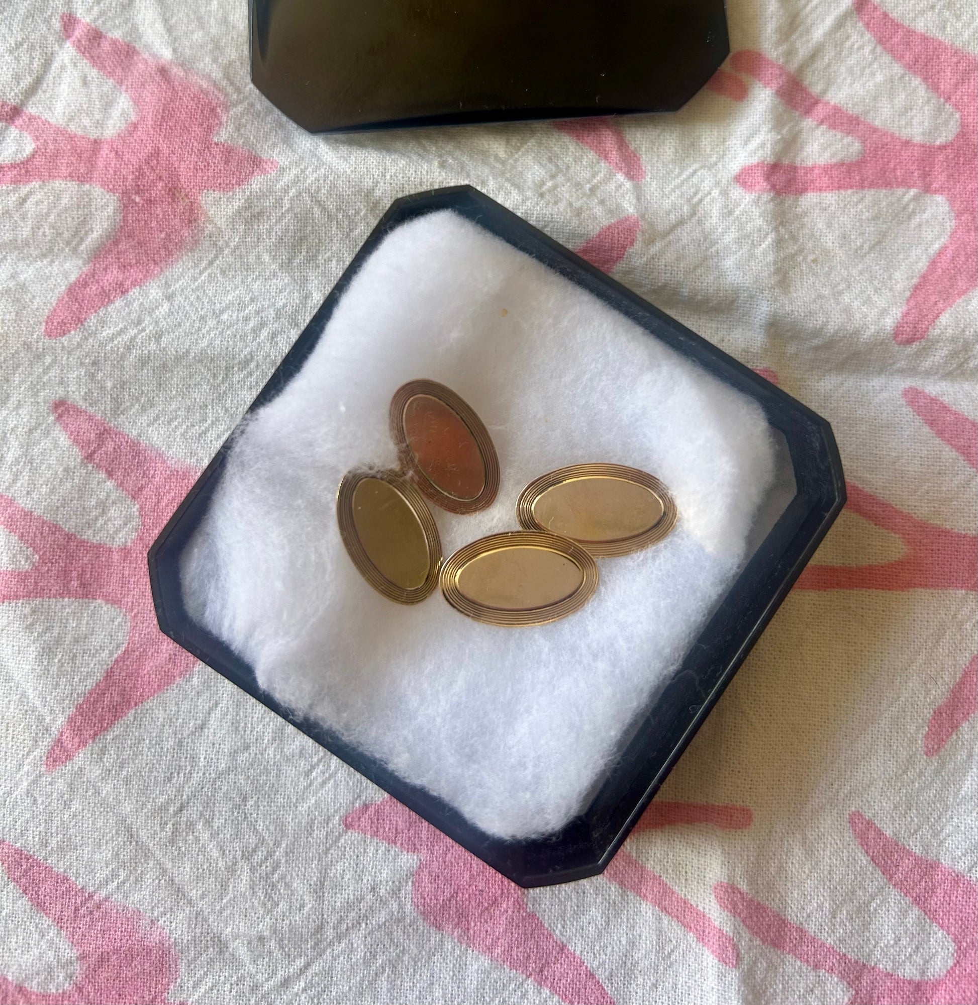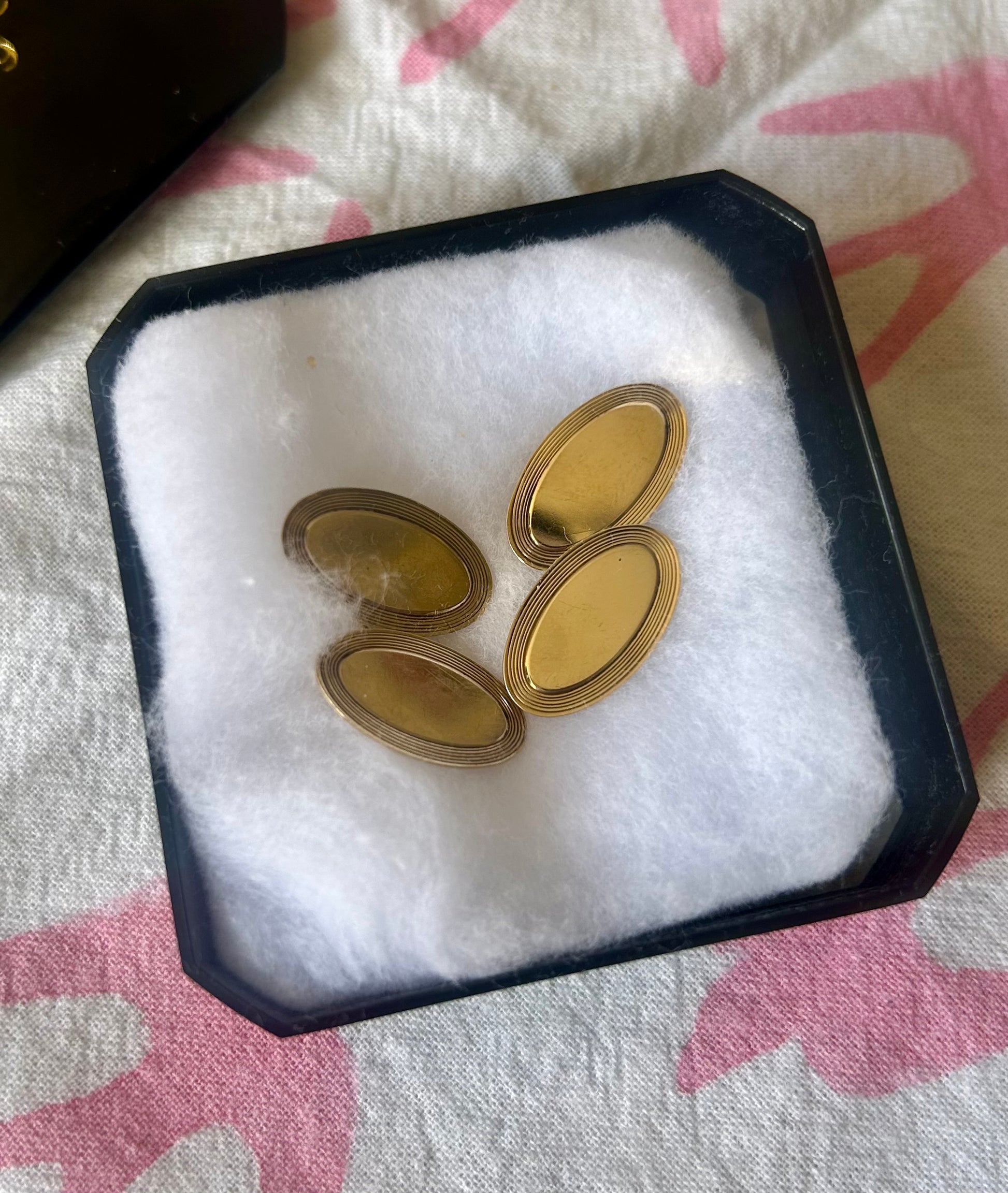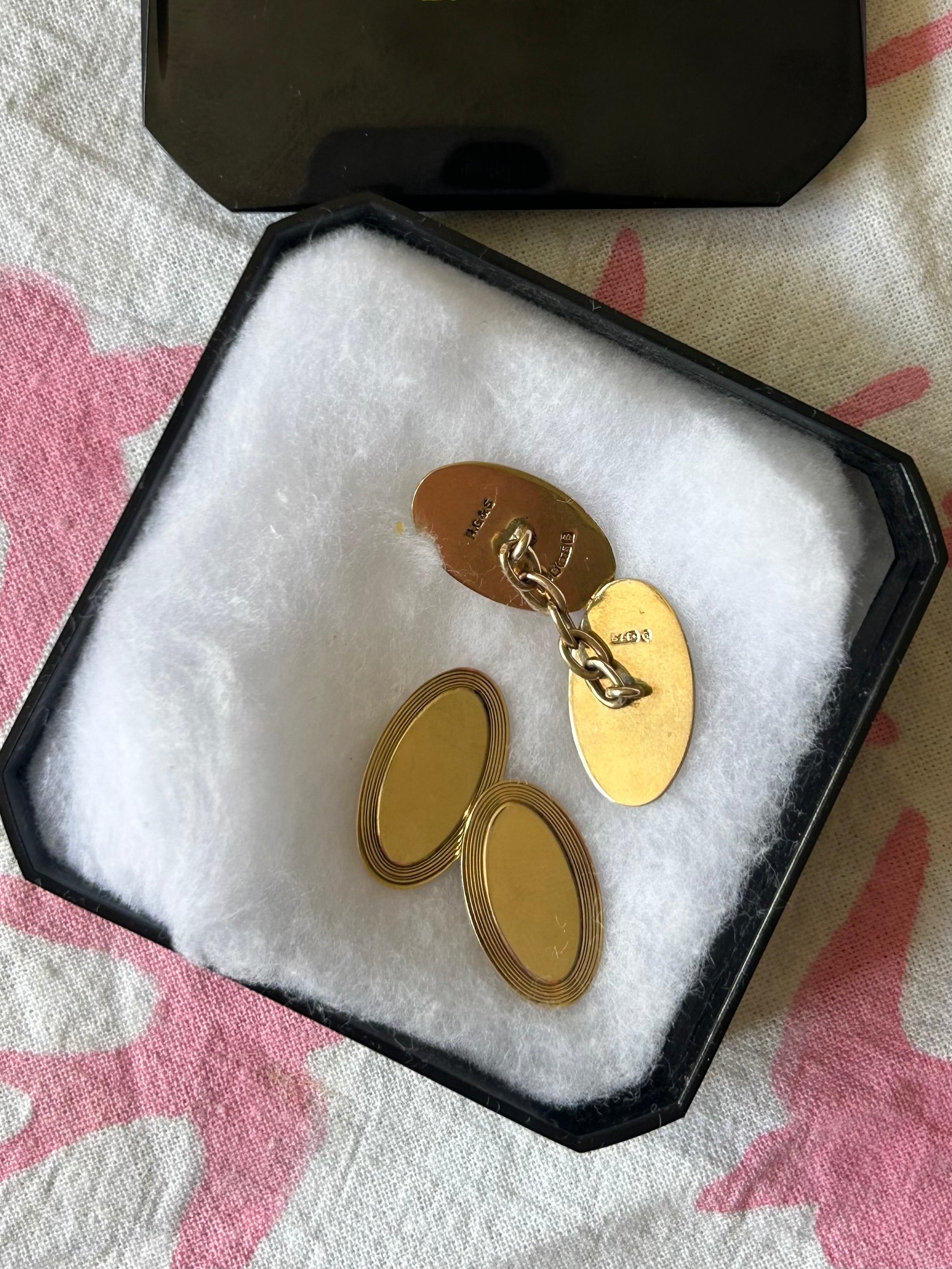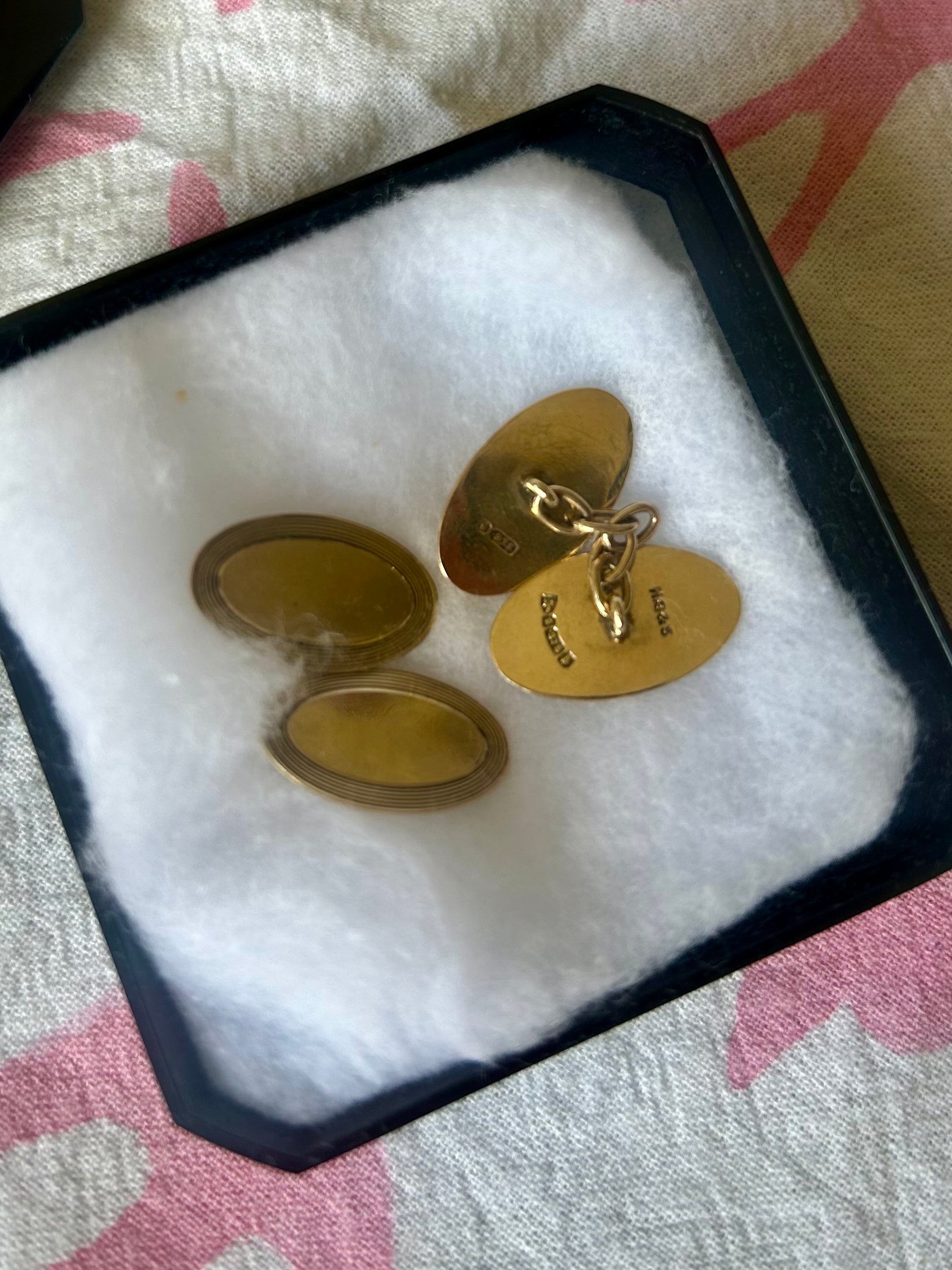 I have two pairs of these smart cufflinks, one is a special pair of antique rose gold cufflinks engraved with the initials EAG, and the other are yellow gold with lovely detailing around the edge