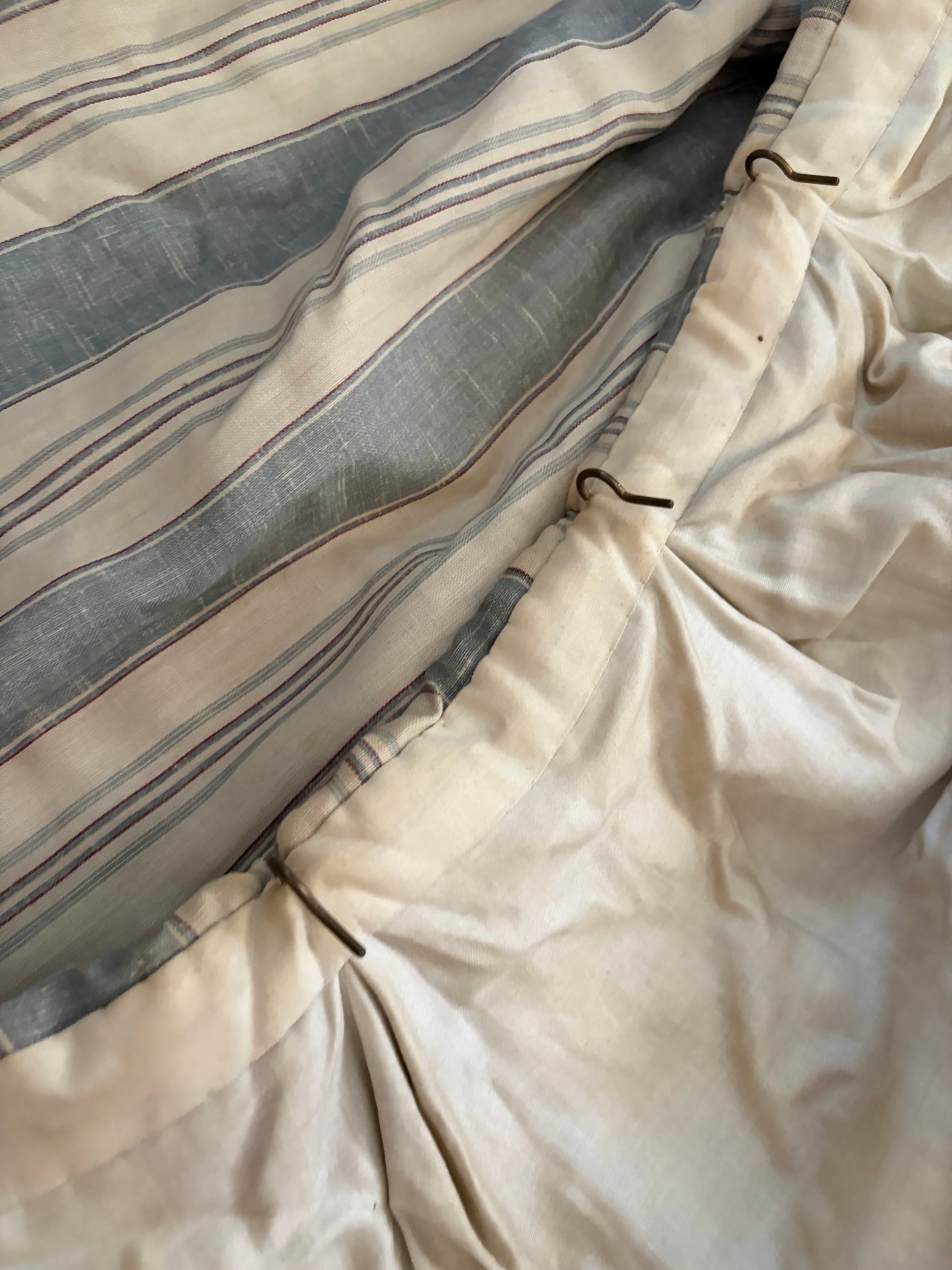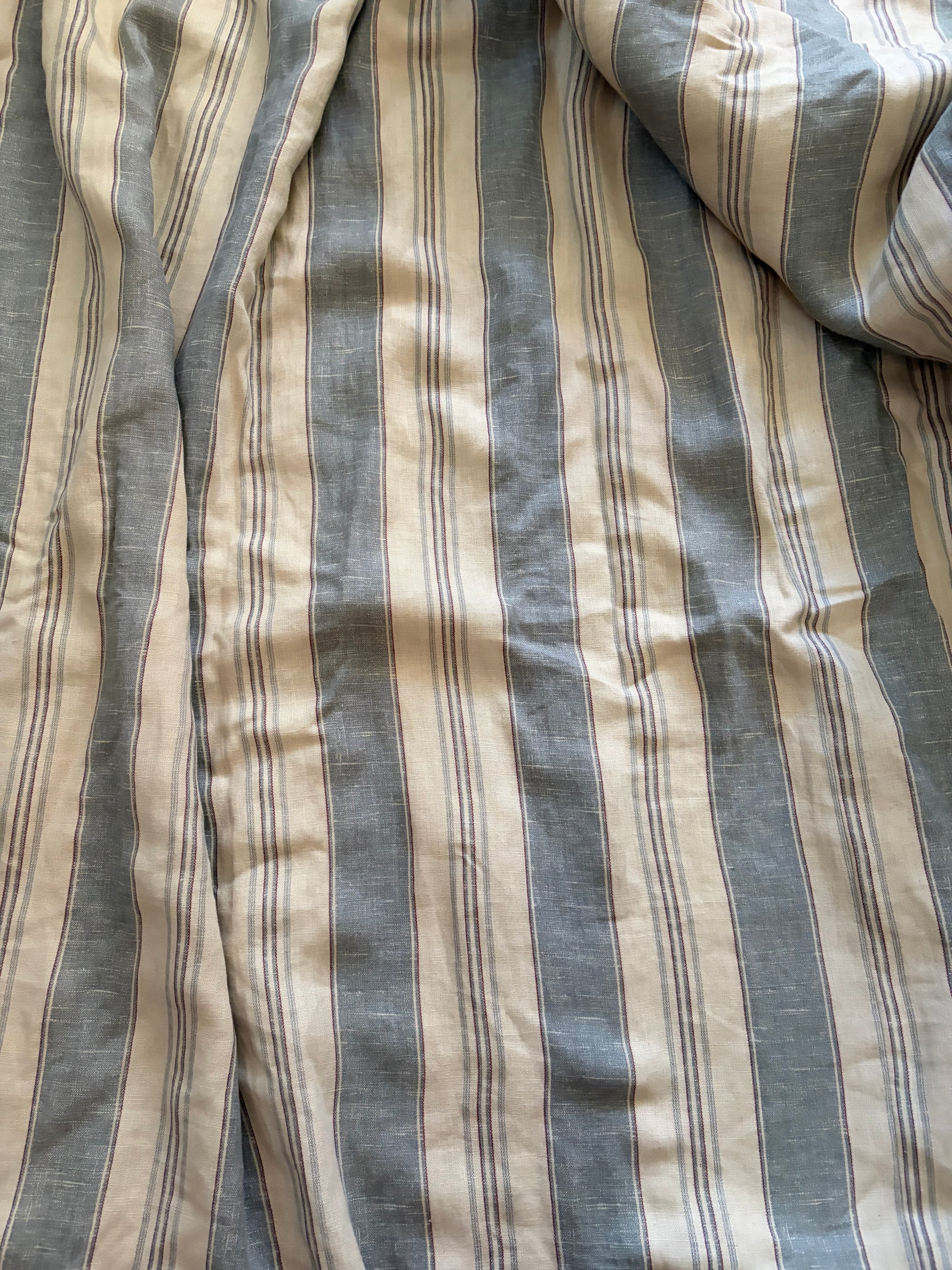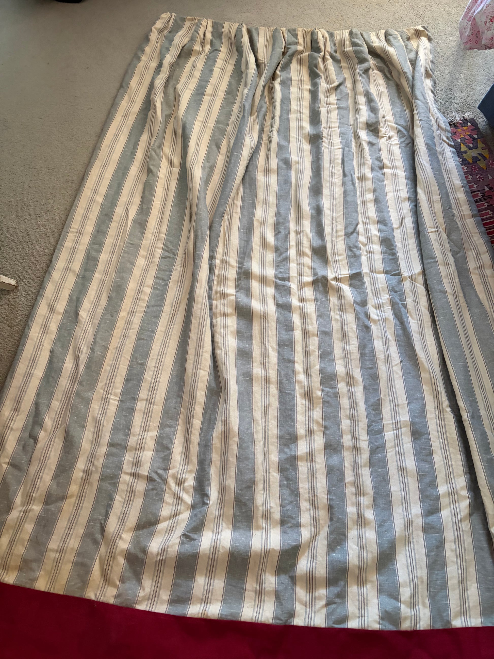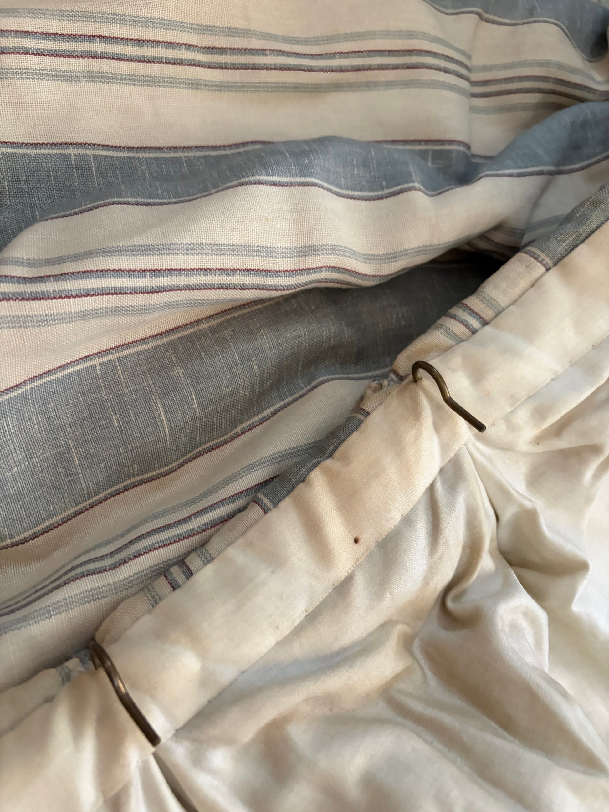 You always know when a pair of curtains as well made when they use those lovely old-fashioned brass hooks. These are lined and interlined thick heavy well-made curtains. I believe that the Fabric is Claremont (£159 per meter). A smart ticking stripe with a red strip across the bottom. 100% linen. There are some watermarks at the bottom, which I should make you aware of, not serious, But these were more than likely be removed with a dry clean or gentle wash.