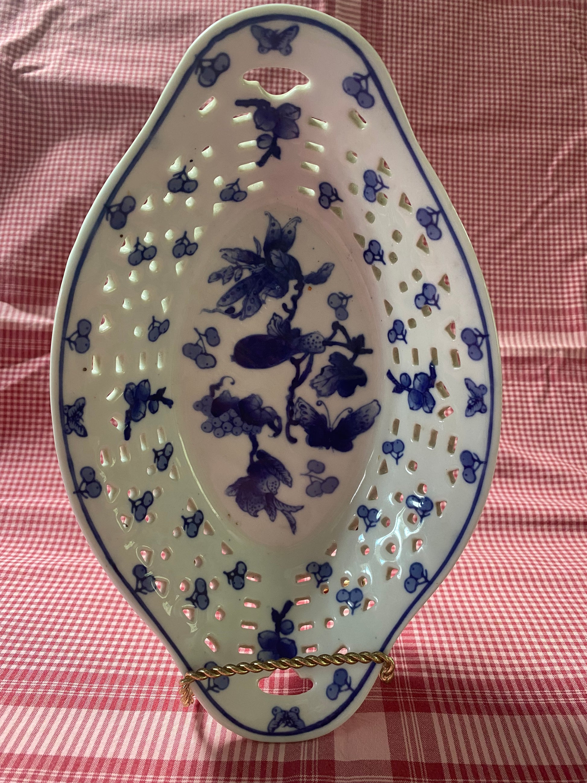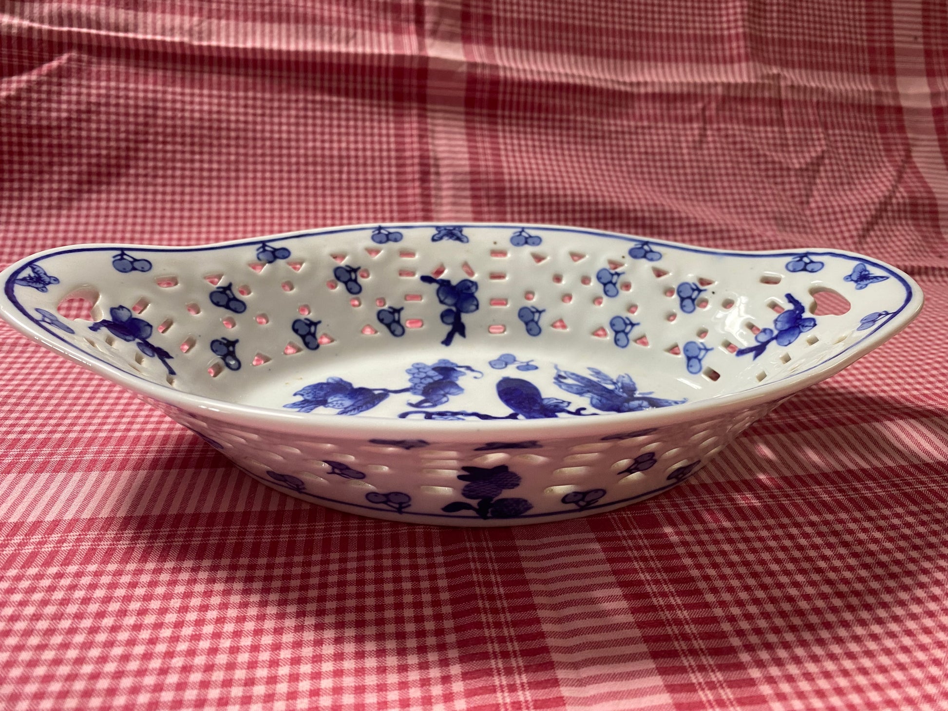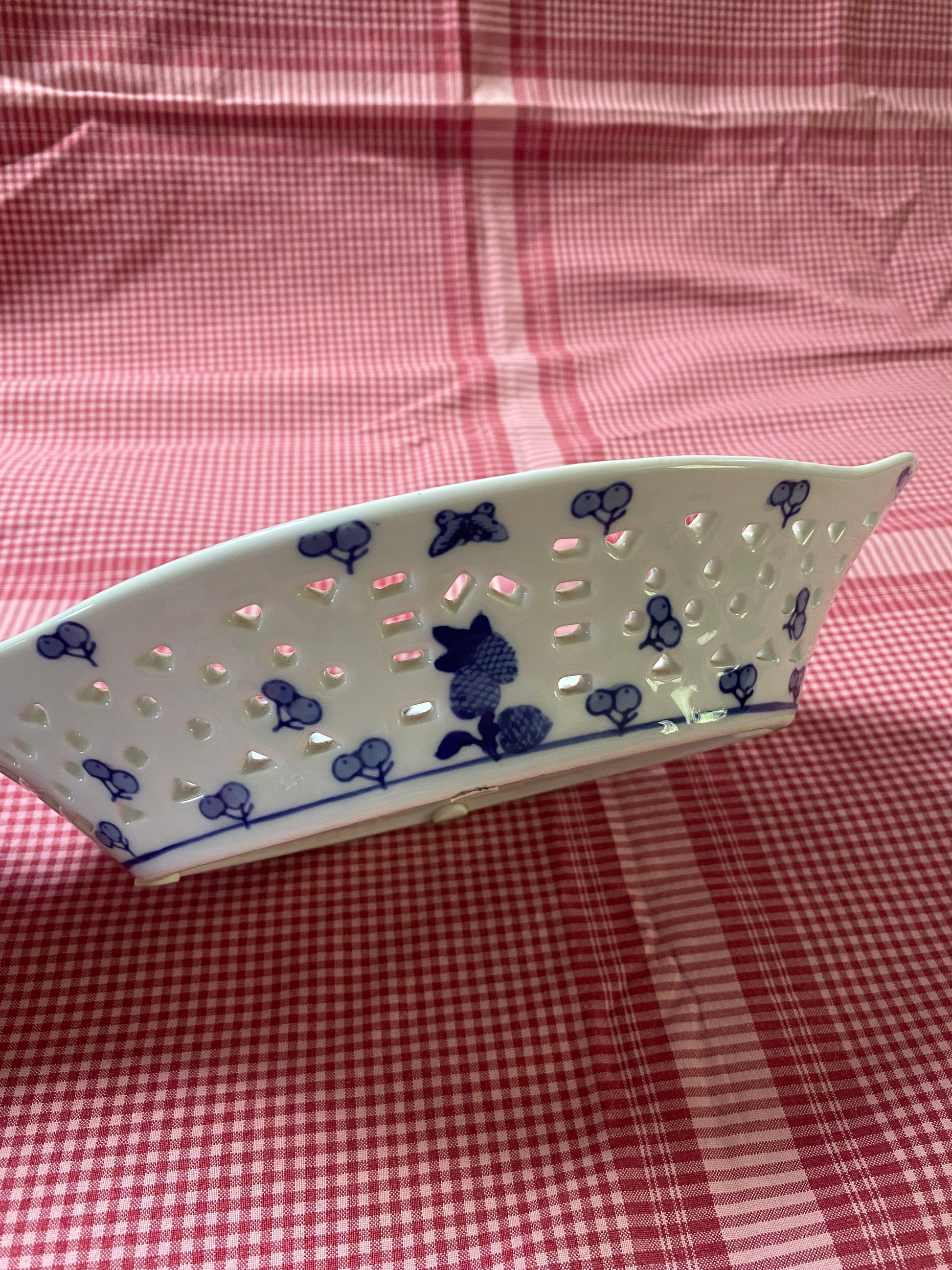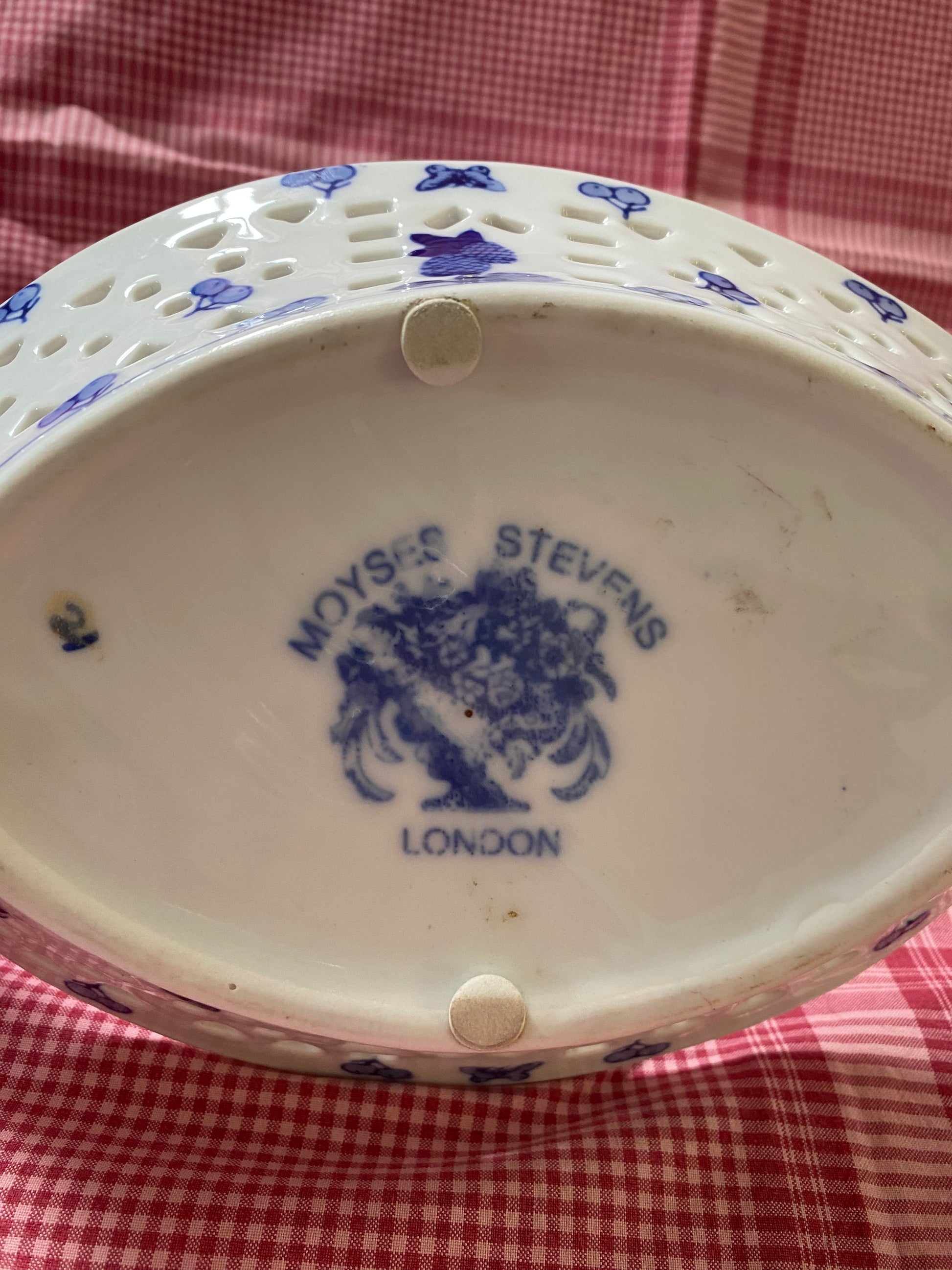 Moyses Stevens blue and white dish. It is 27 cm long and 17 cm wide with a depth of 5 cm. £20
