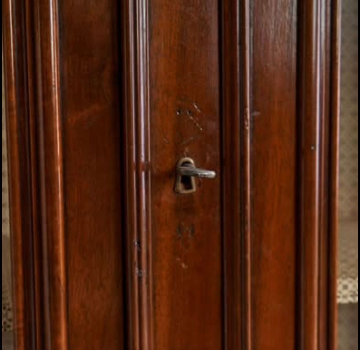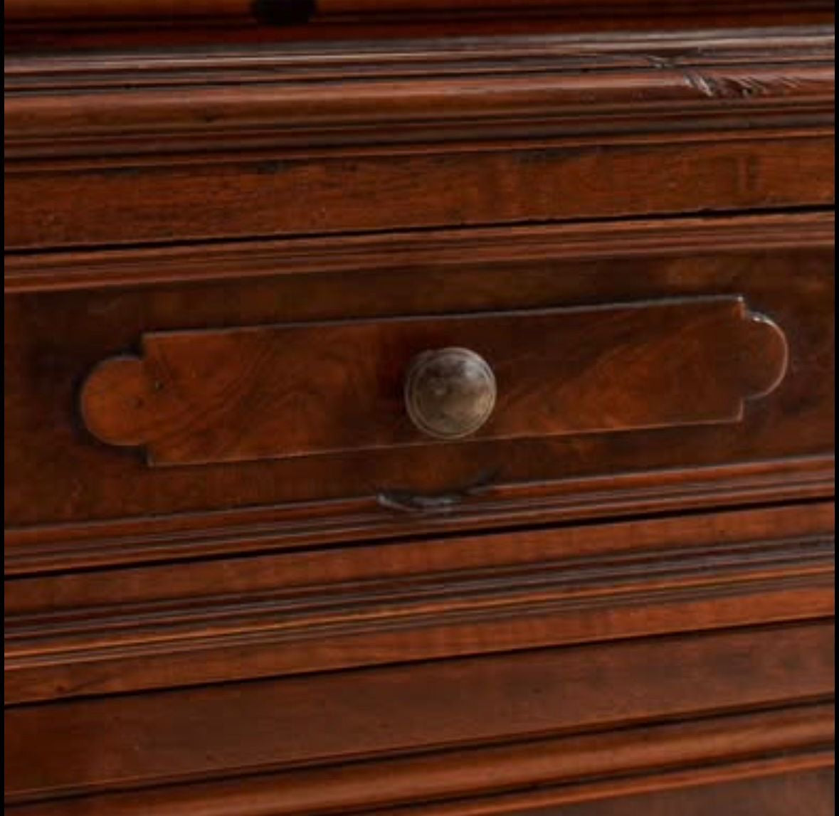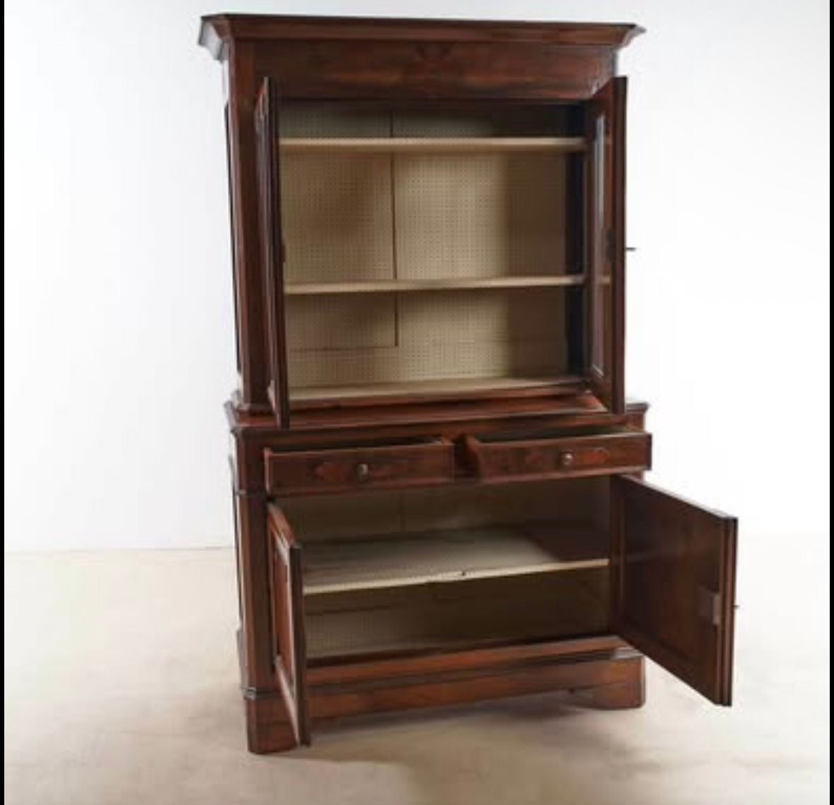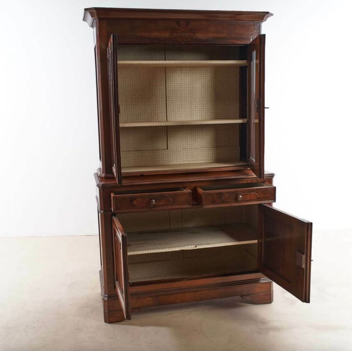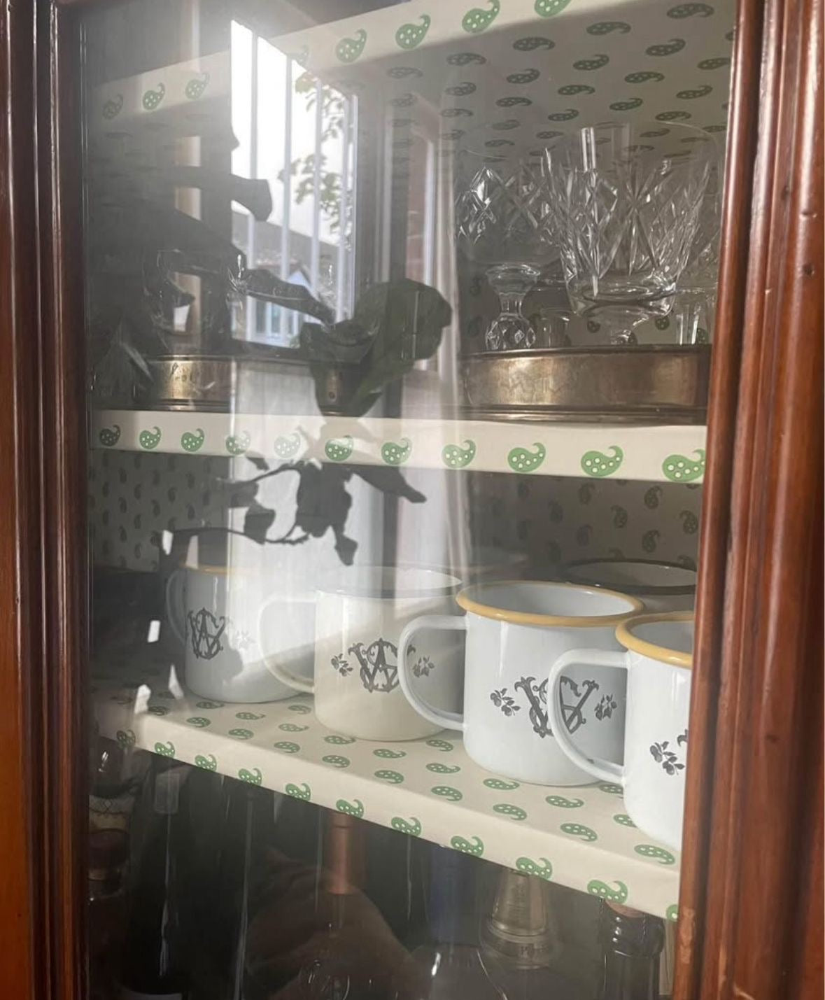 Walnut dresser originally from Italy - great storage and showcase. It comes in two pieces, top and bottom cupboard (with lockable doors). The top piece (showcase sideboard) is lined with Howe wallpaper in “Mr Men Clover” print.
