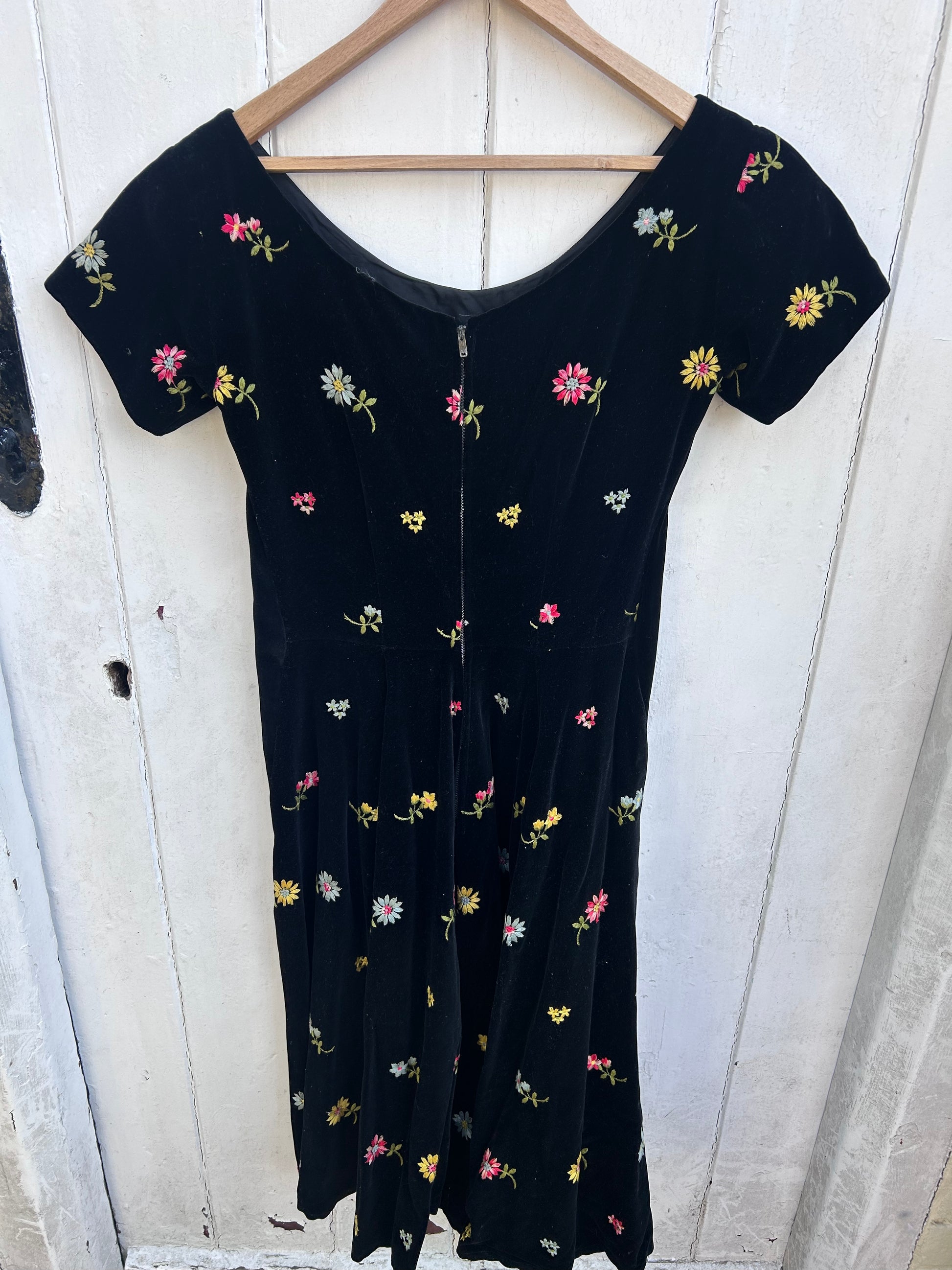 A size 8/10 embroidered vintage velvet dress. Extremely flattering waist and boat neck. The embroidery is very detailed and beautiful. Falls below the knee- Of course could be taken up.