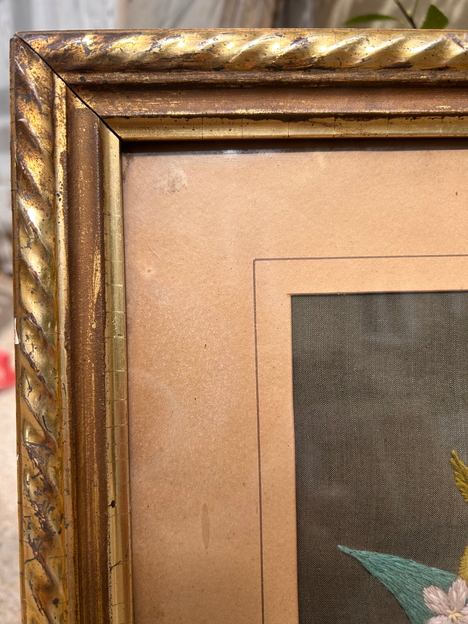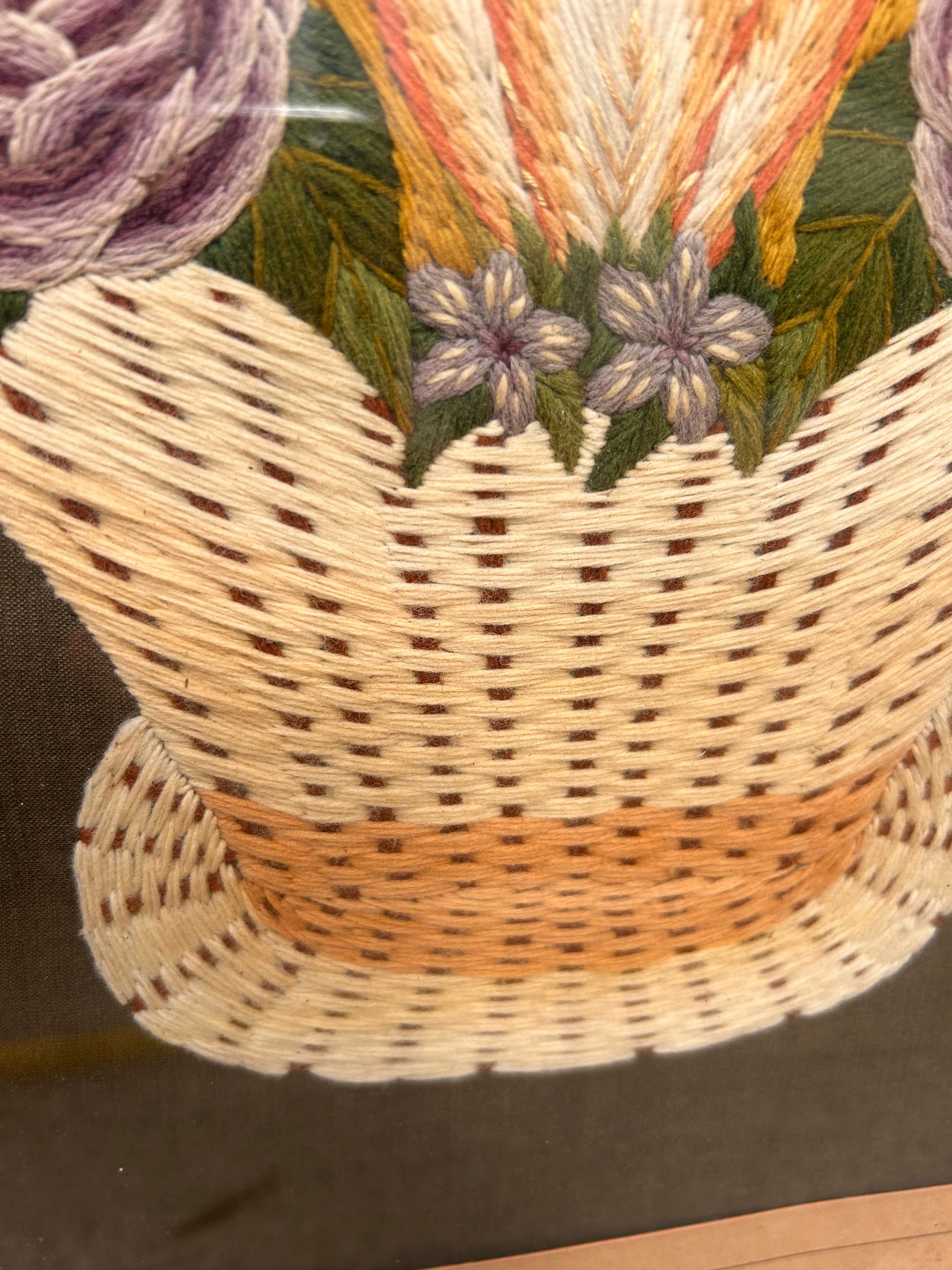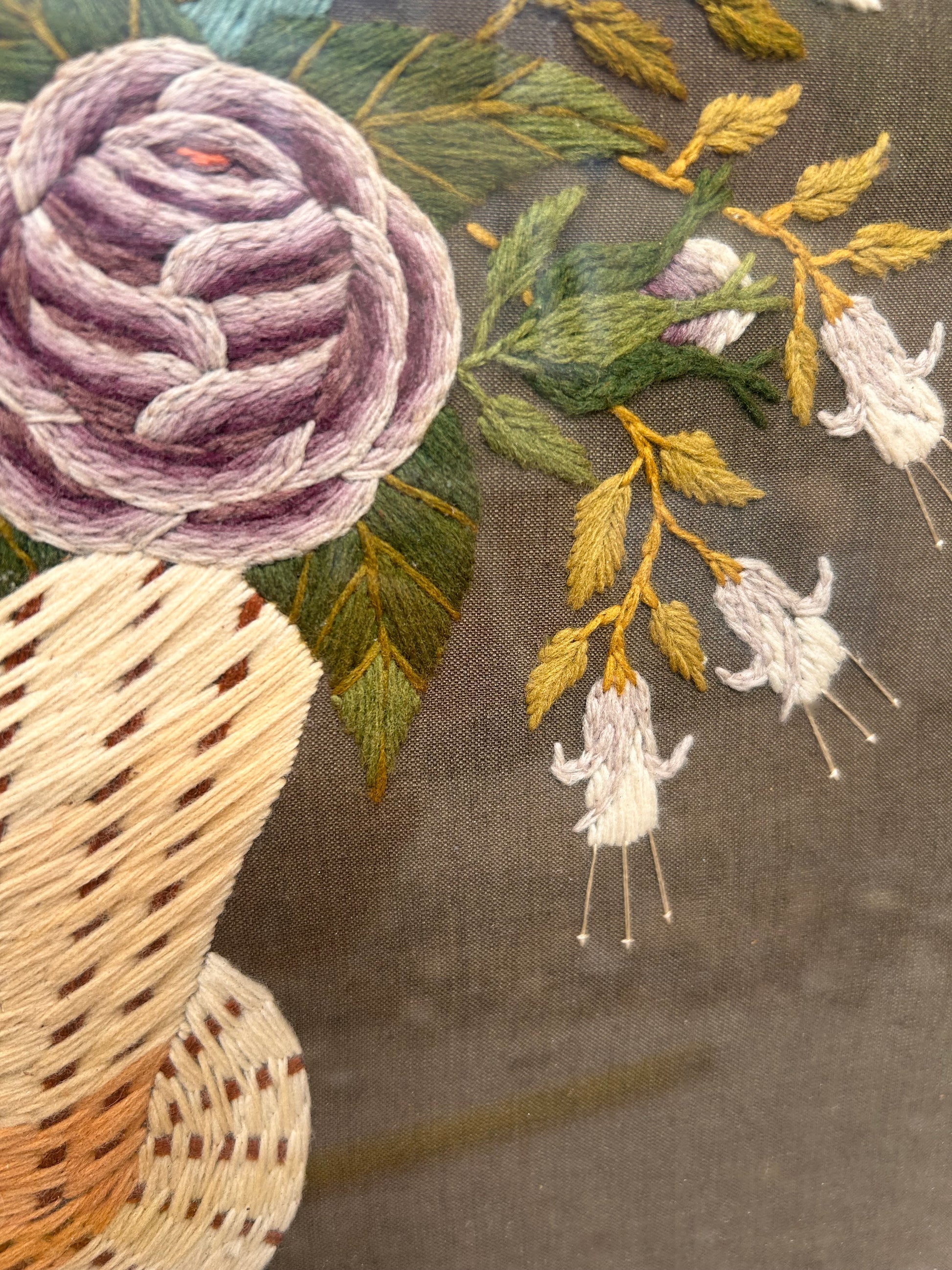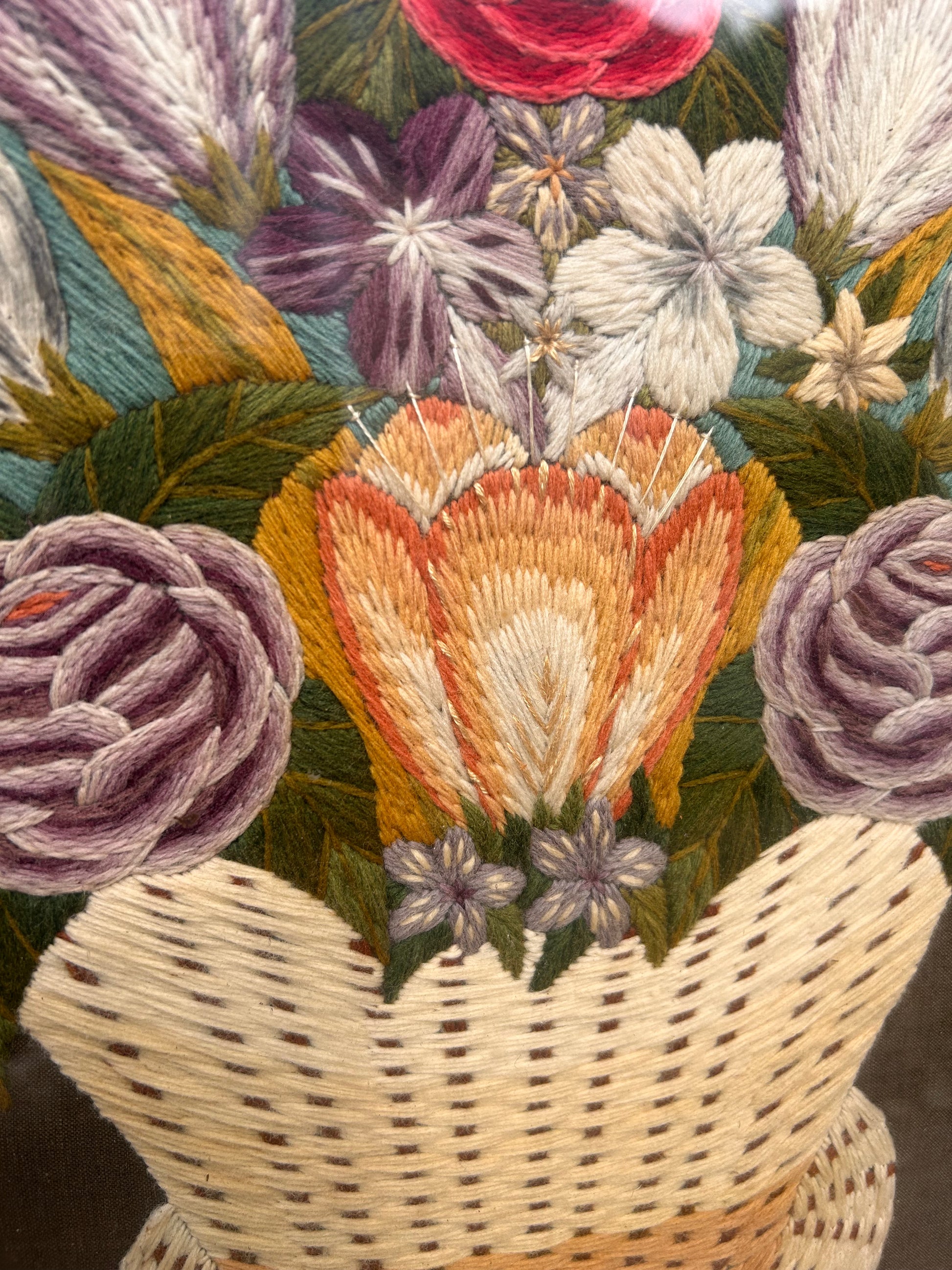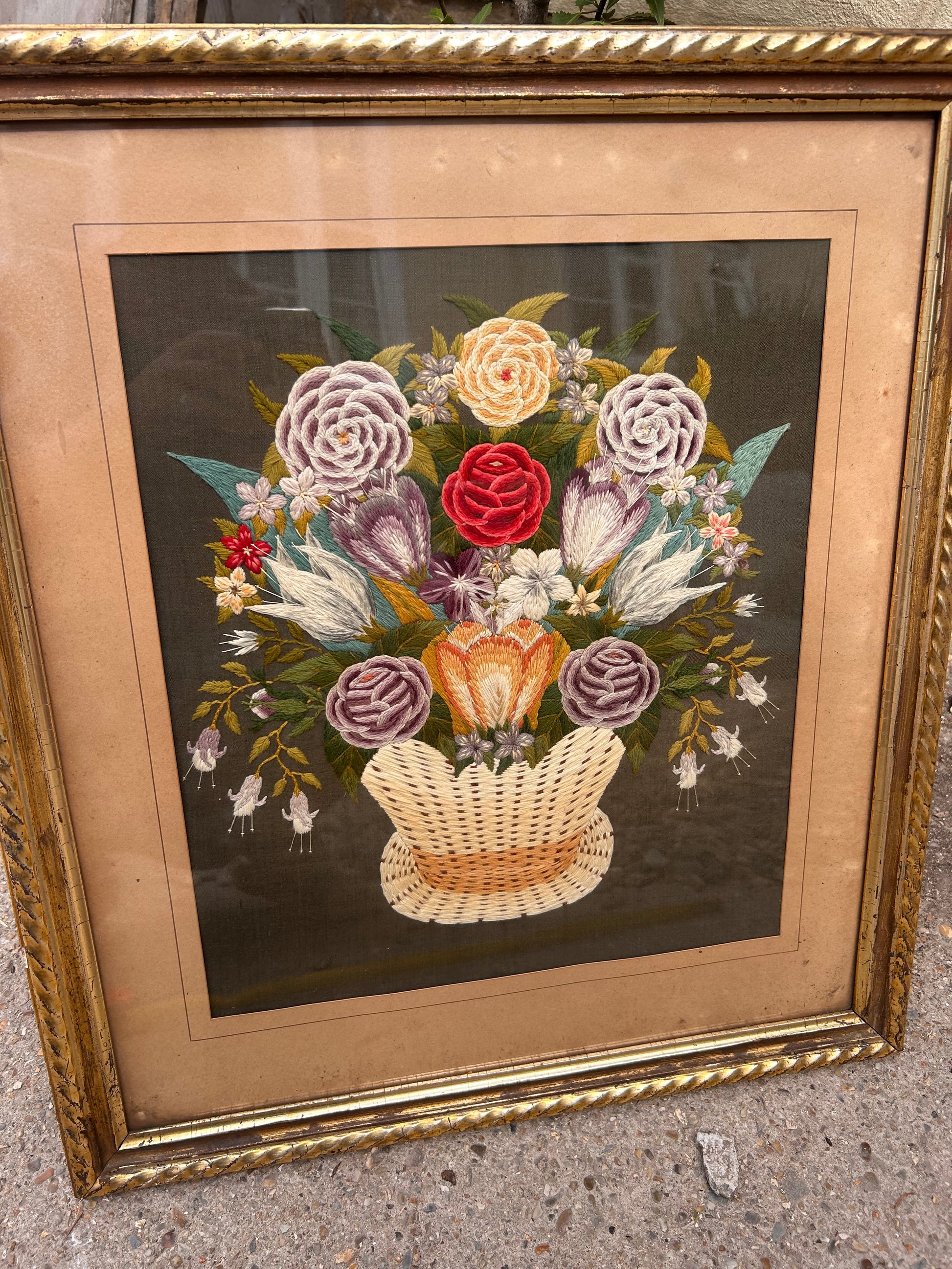 This picture is entirely handmade with Needle and thread. It is such a beautiful embroidered basket of flowers and in its beautiful twisted gilded wooden frame measures 52 x 50 cm.