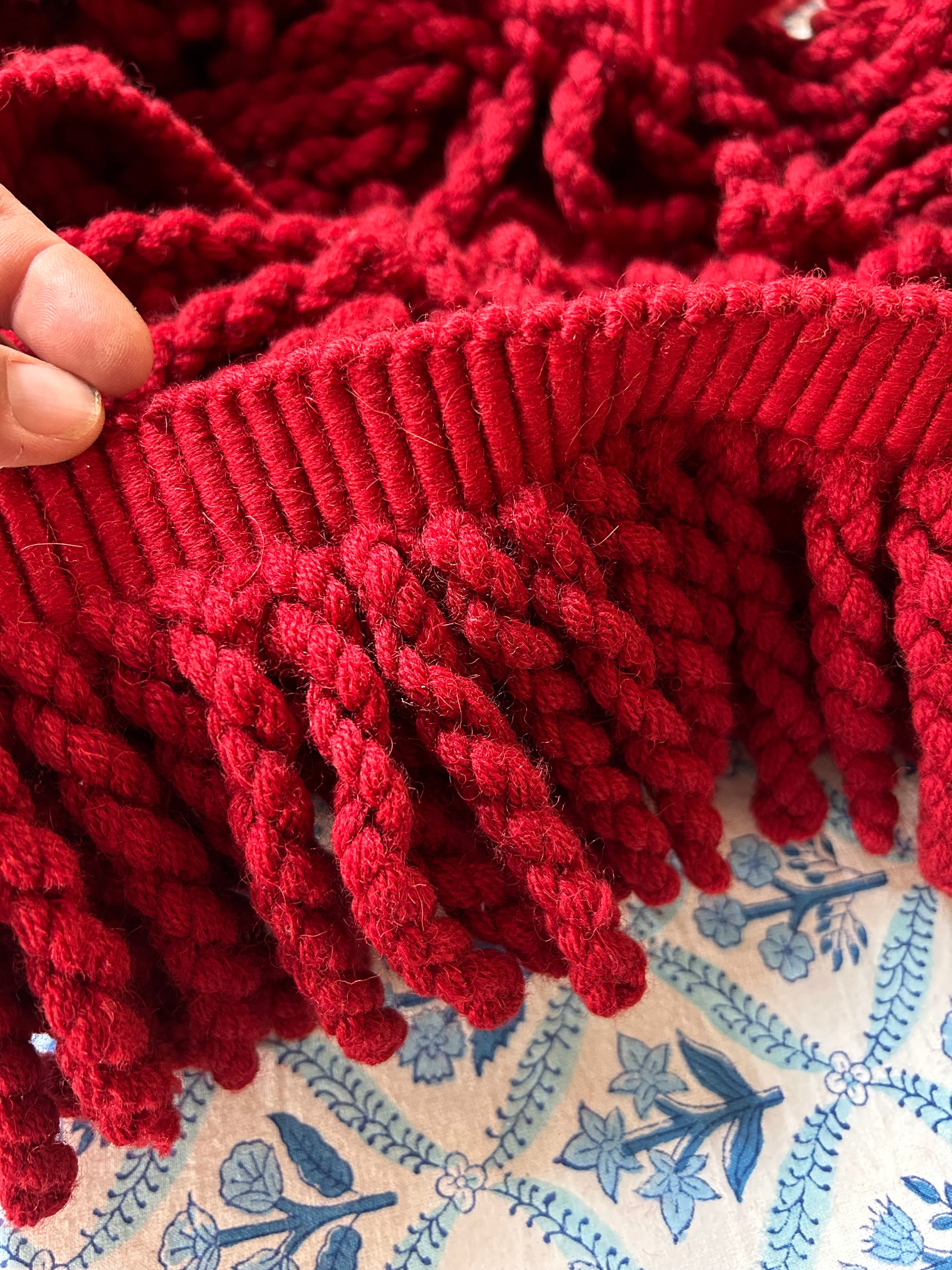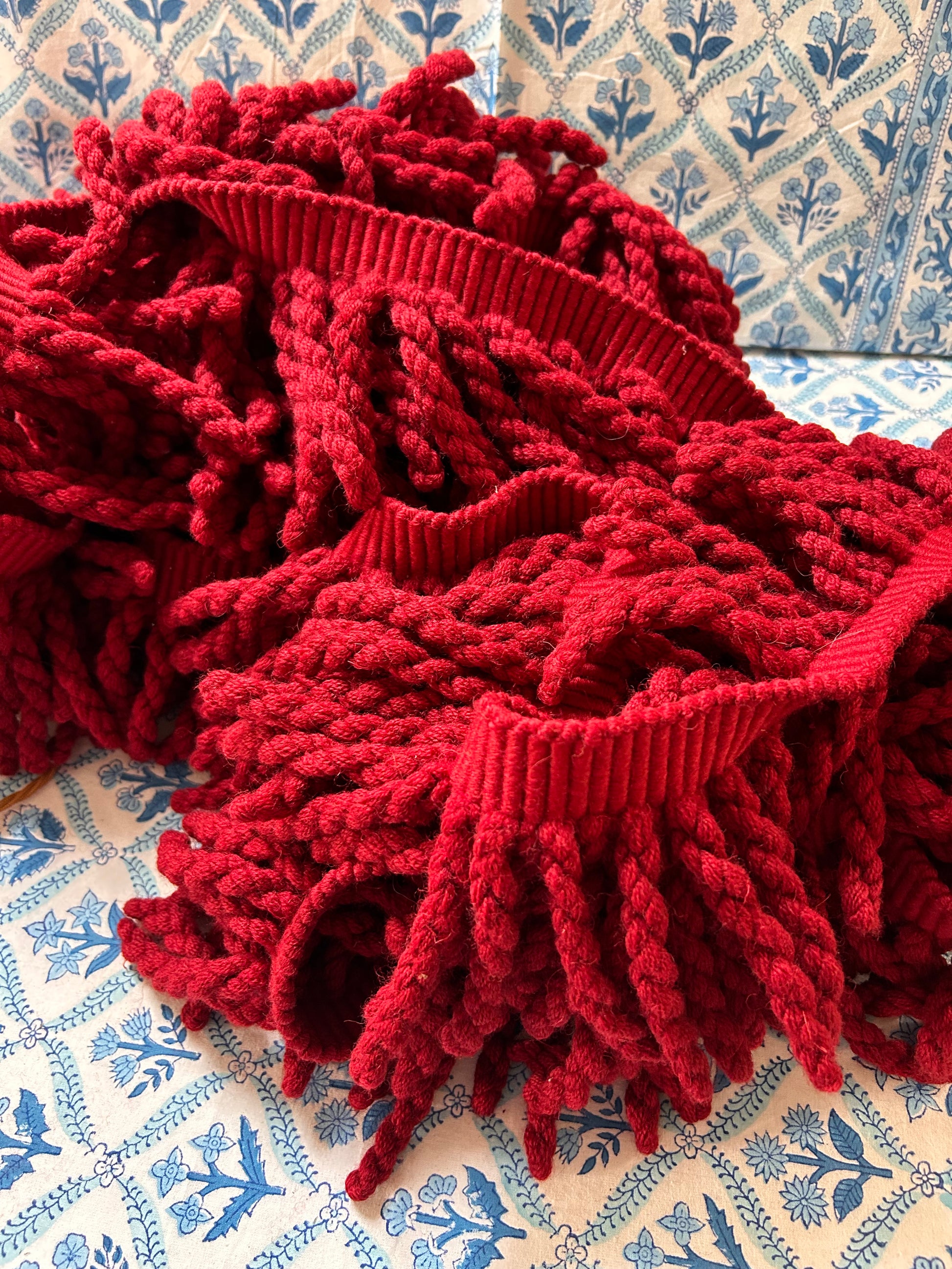 Very superior, thick dark red fringing. 24m in total with a drop of 14 cm