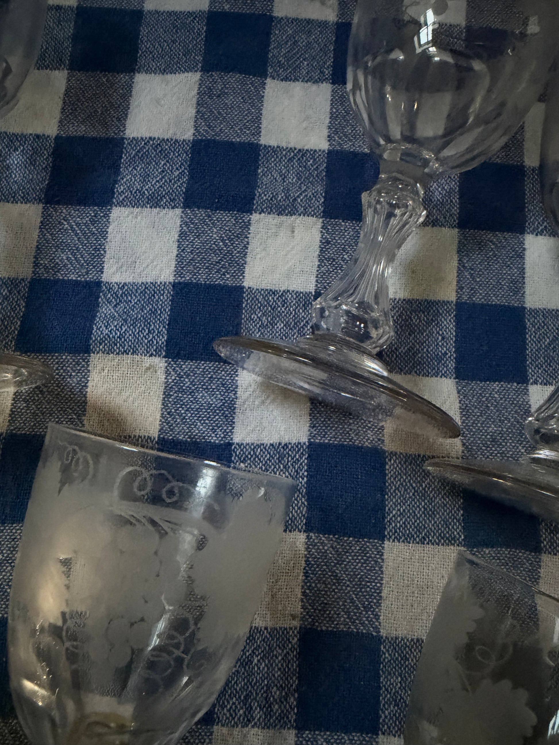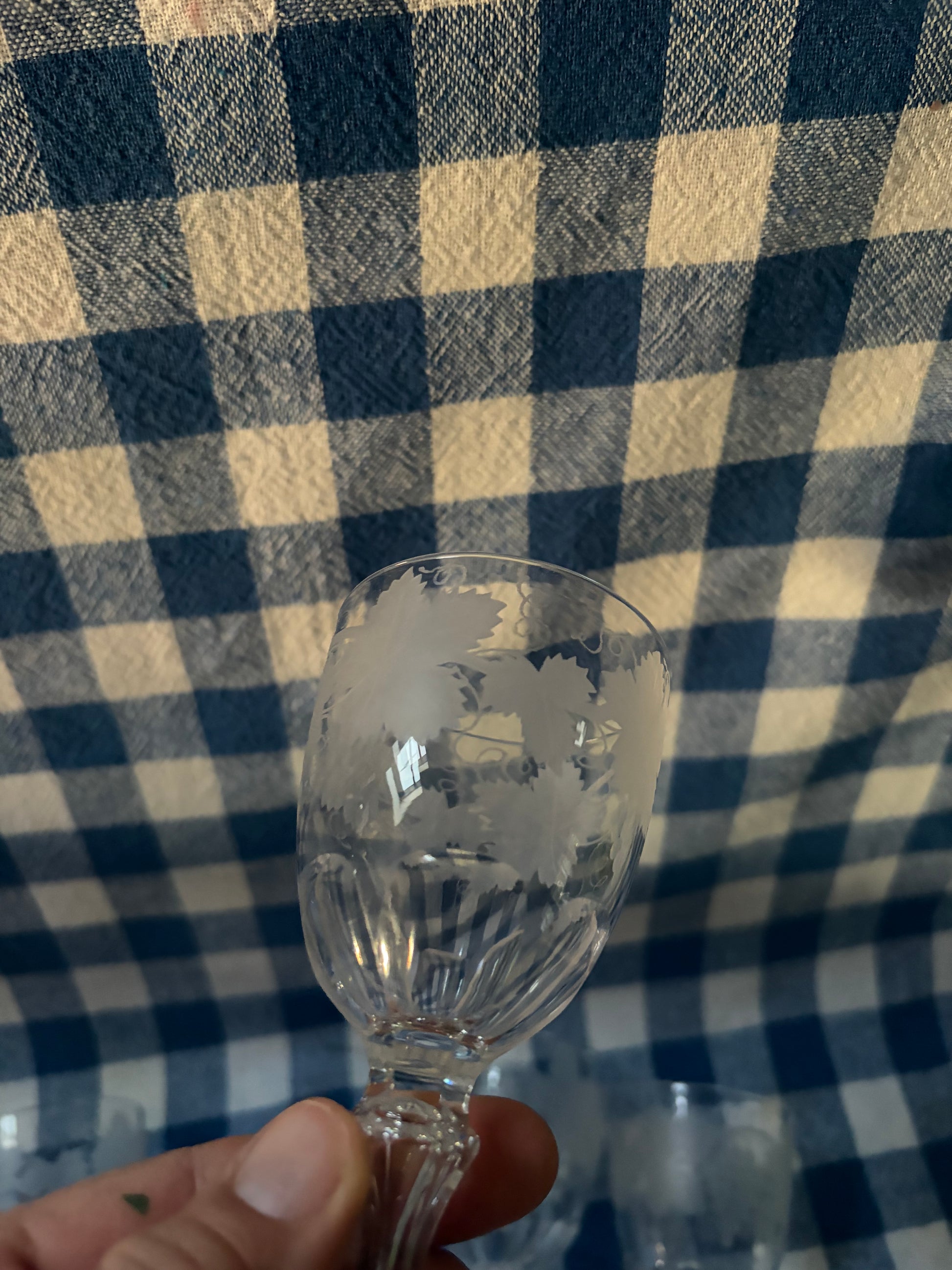 Small wine glasses with beautiful etched Vine leaves and grapes. There are seven in total.