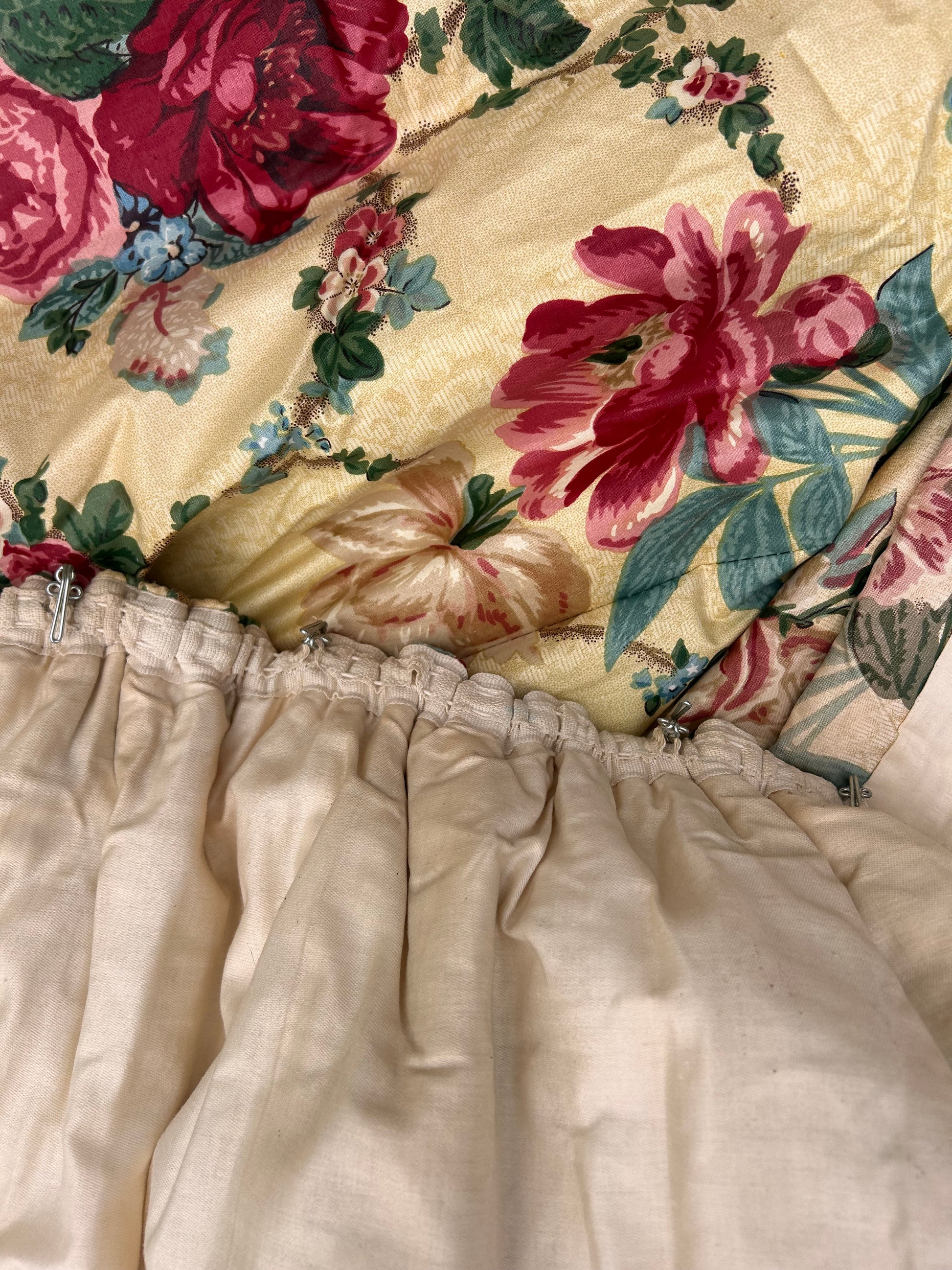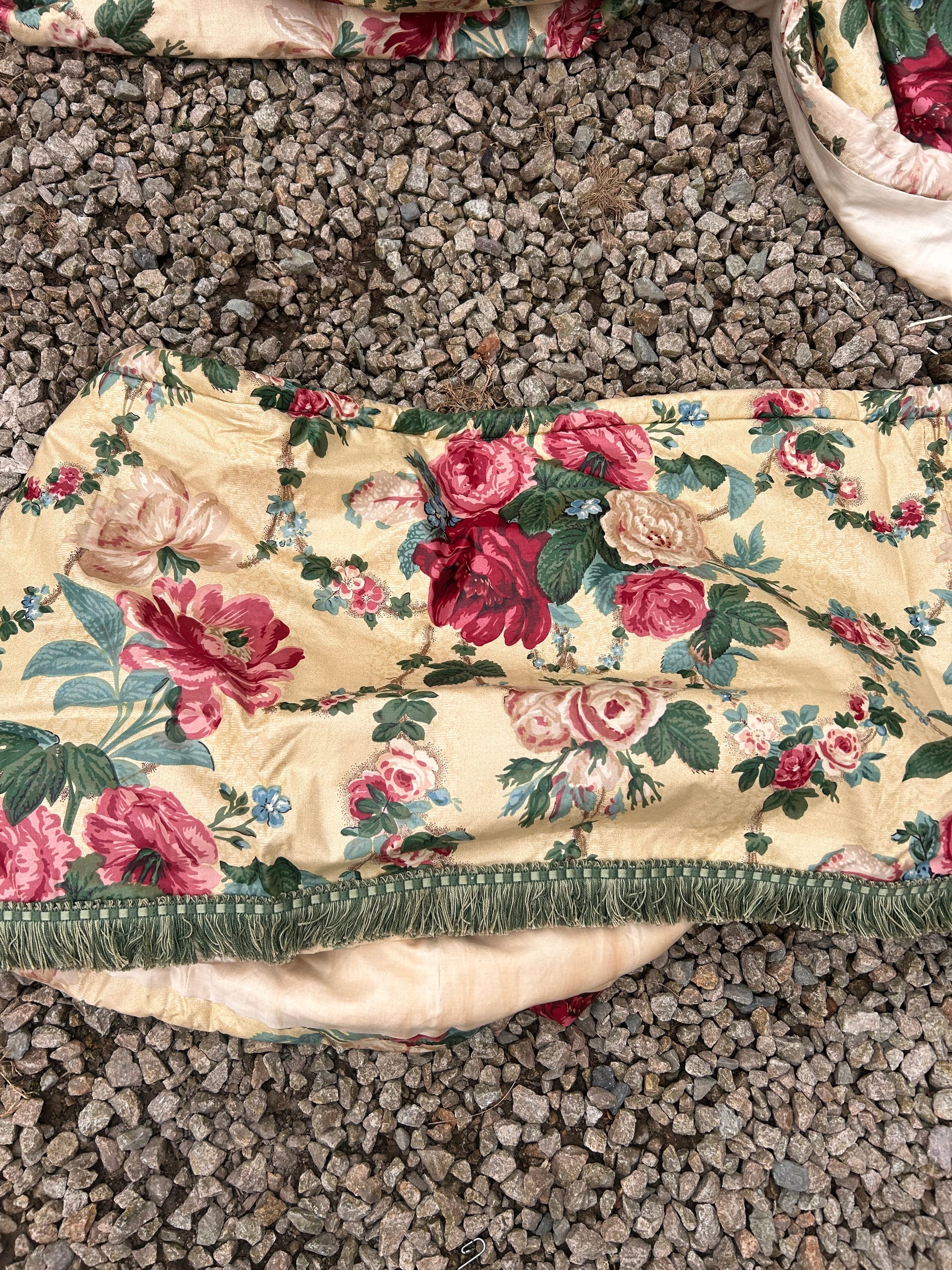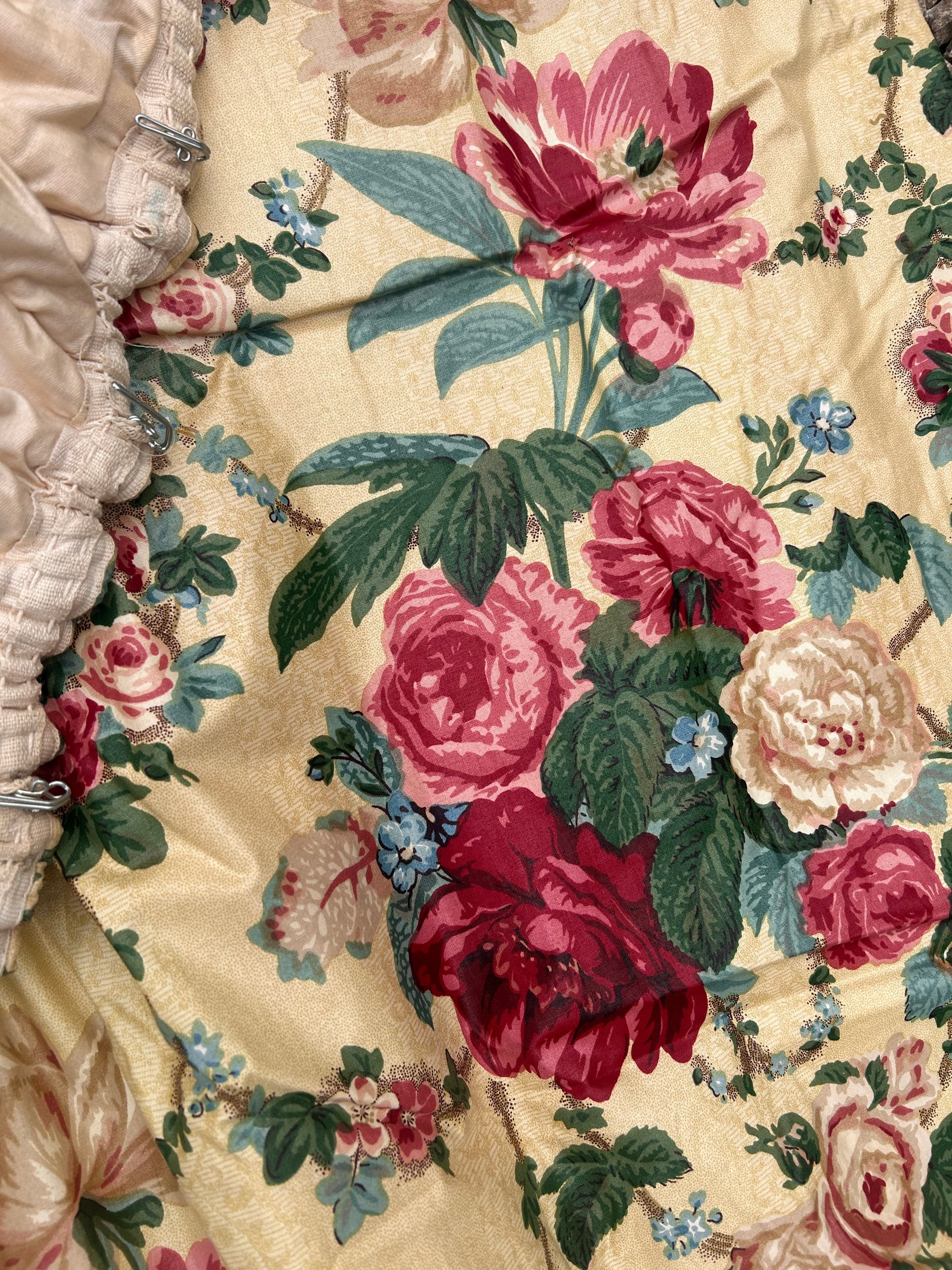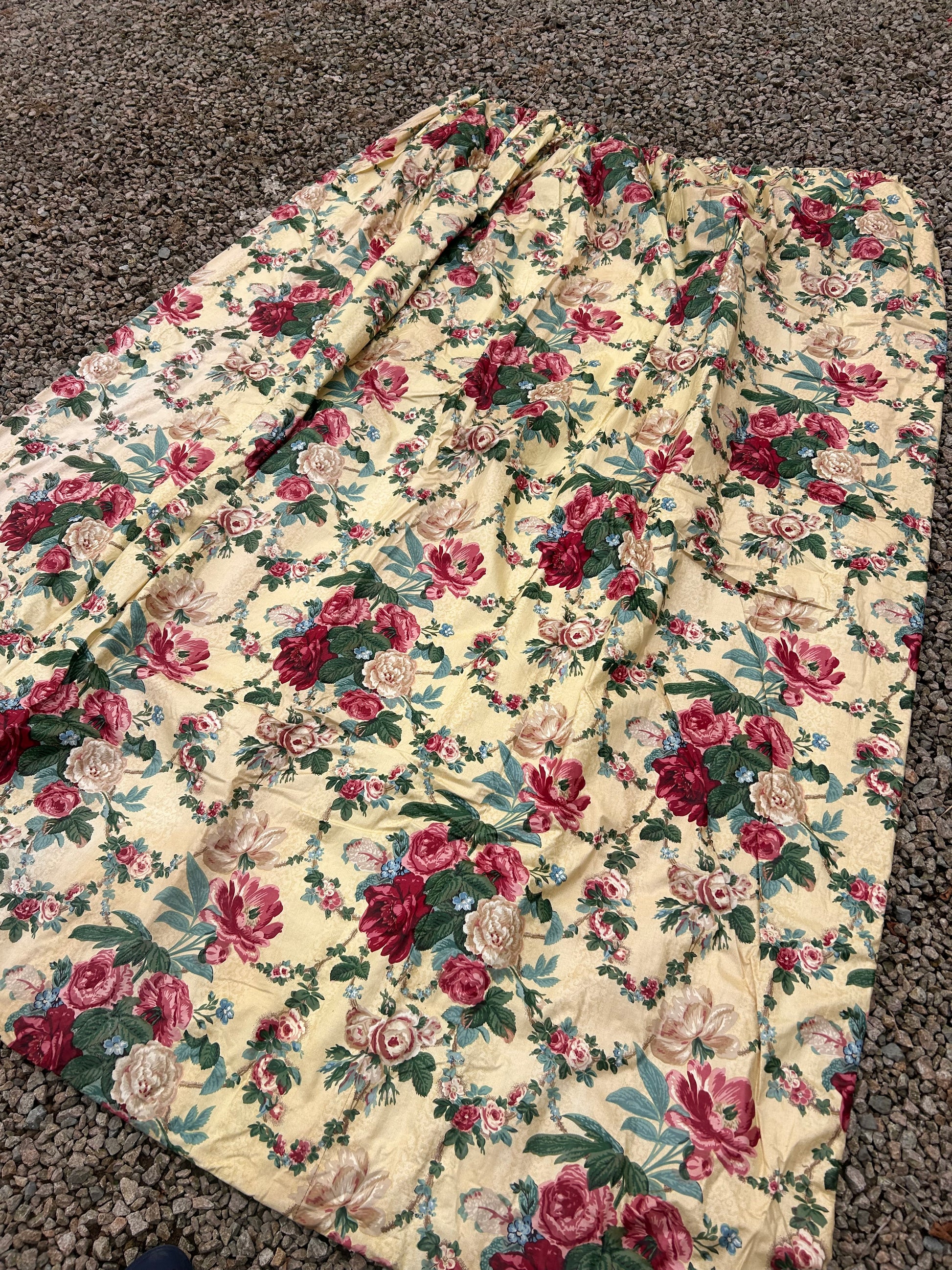 TWO pairs of curtains/ GP & J Baker material. Lovely rich colours a yellow background with pink greens and blue. Floral patterned antique chintz in good condition though the lining has got damaged from Light but they are well-made lined and interlined each one comes with a pelmet too.