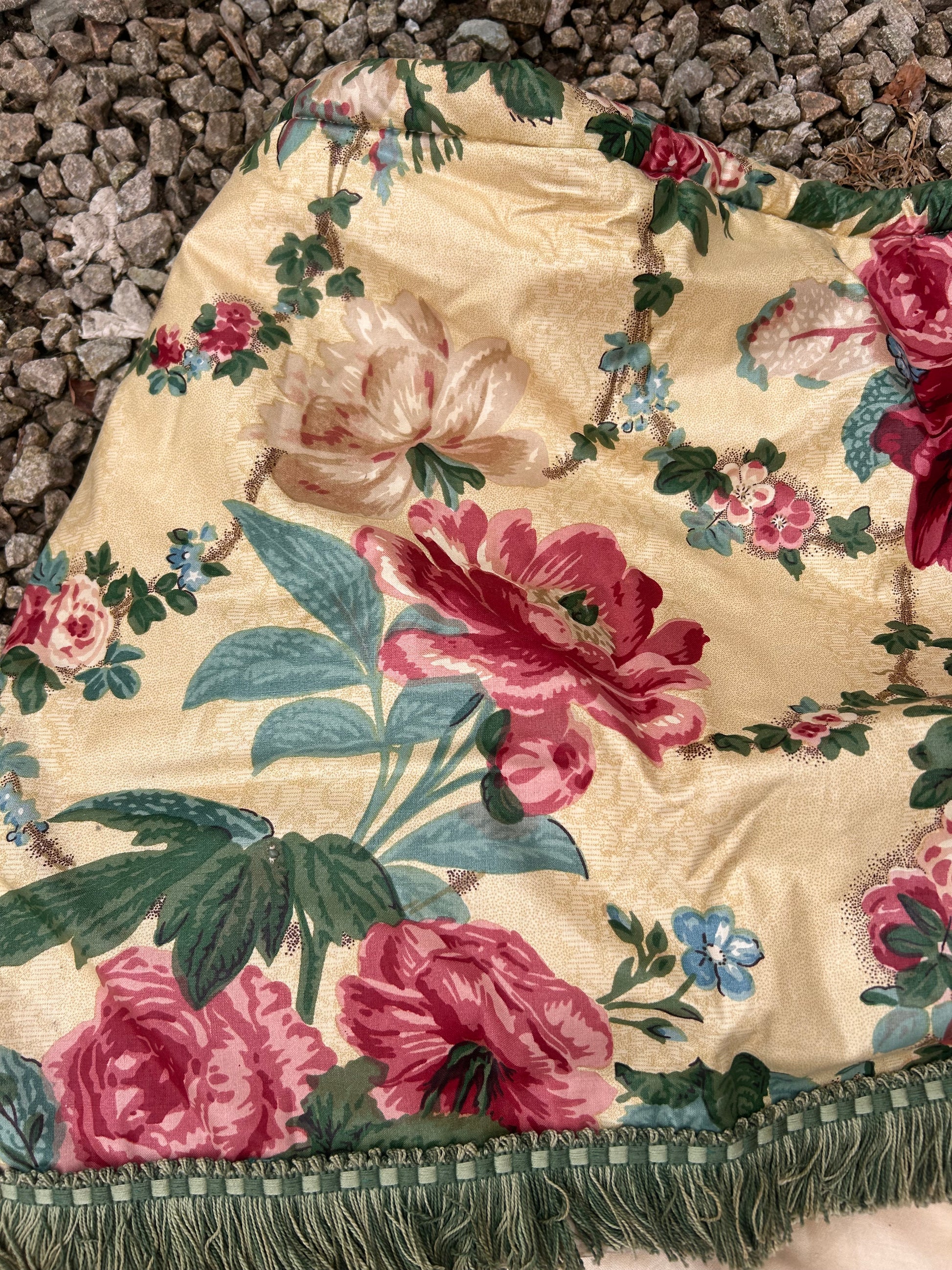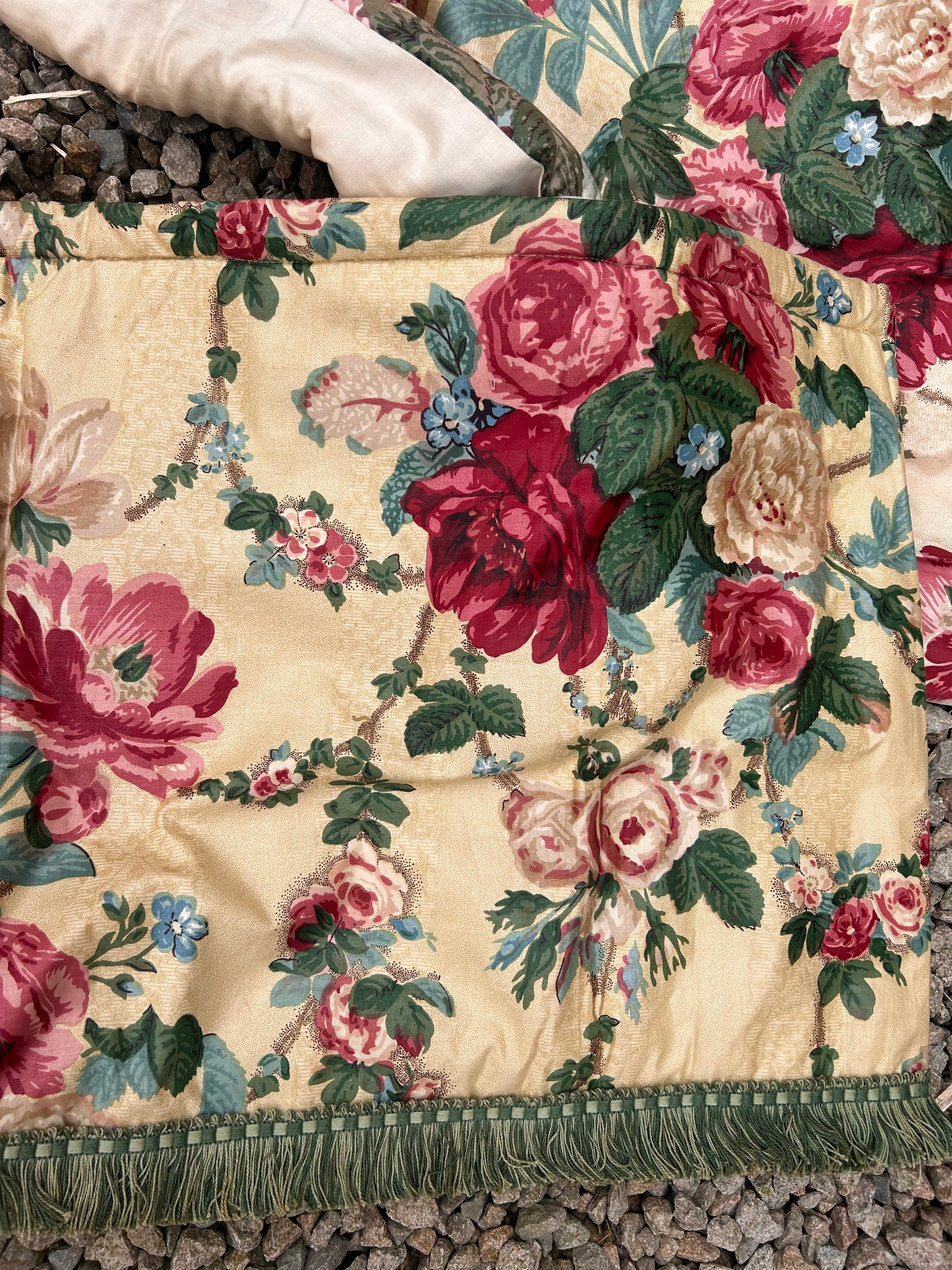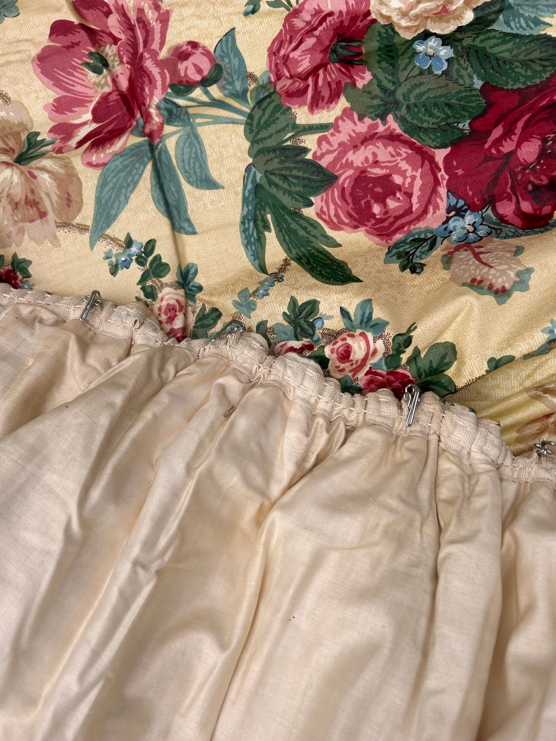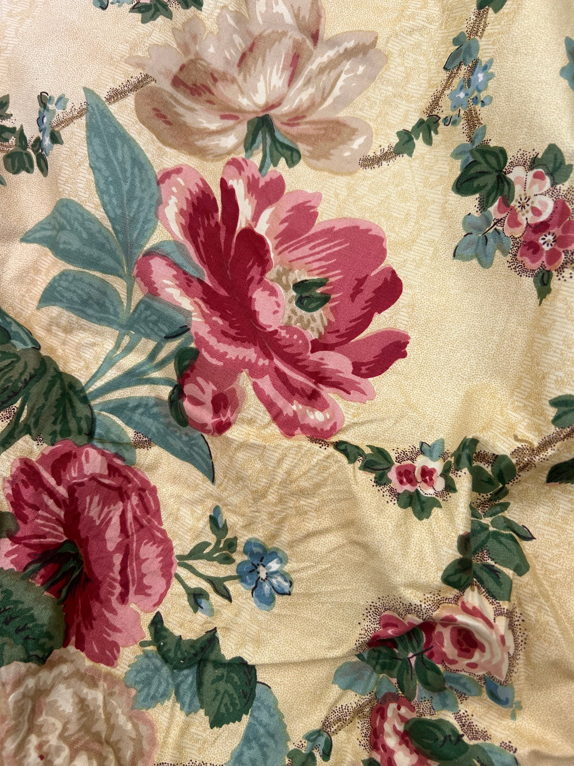 TWO pairs of curtains/ GP & J Baker material. Lovely rich colours a yellow background with pink greens and blue. Floral patterned antique chintz in good condition though the lining has got damaged from Light but they are well-made lined and interlined each one comes with a pelmet too.