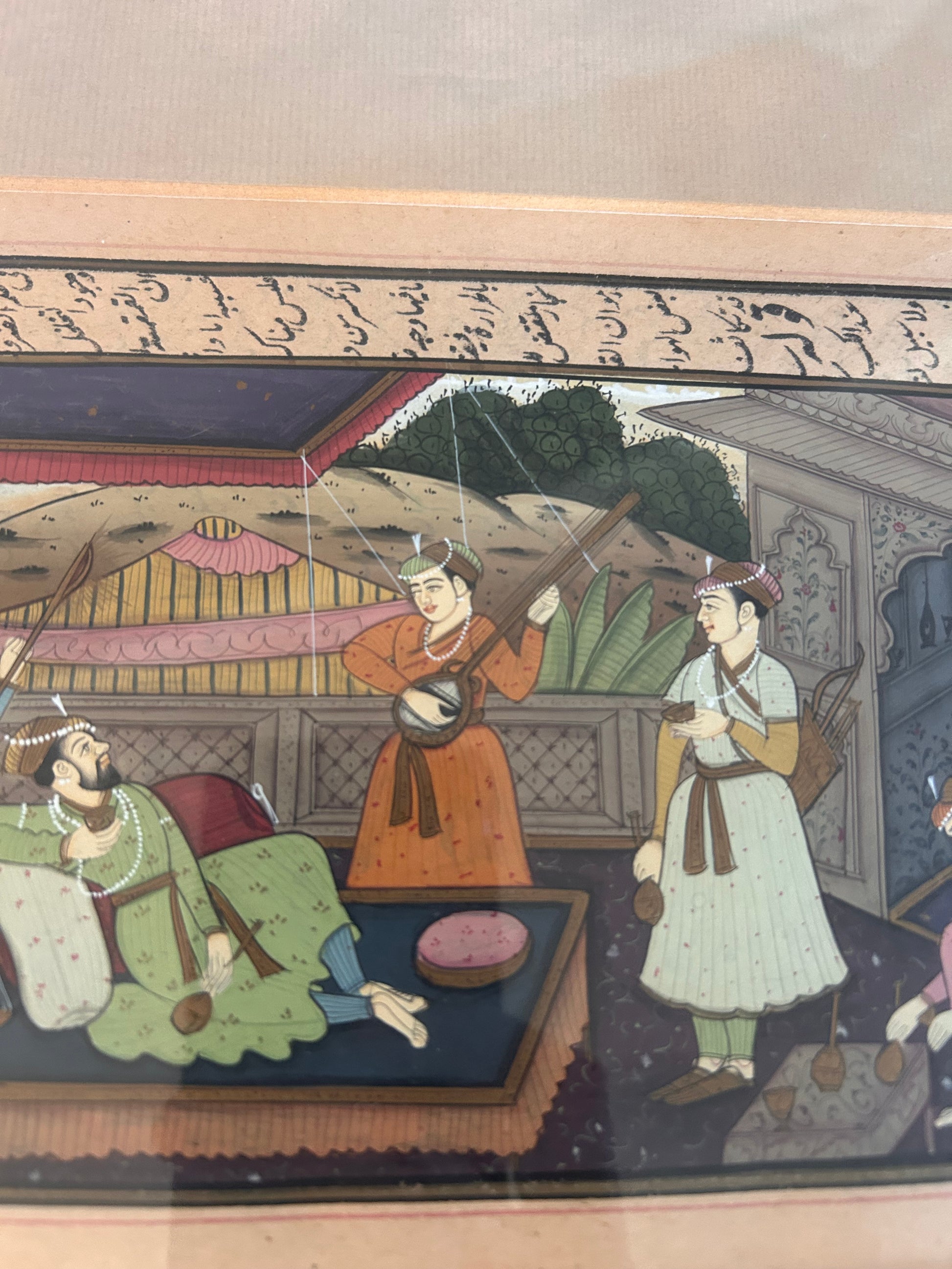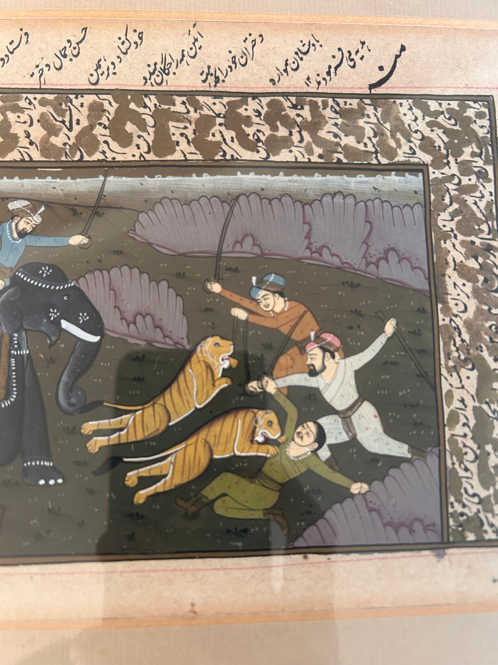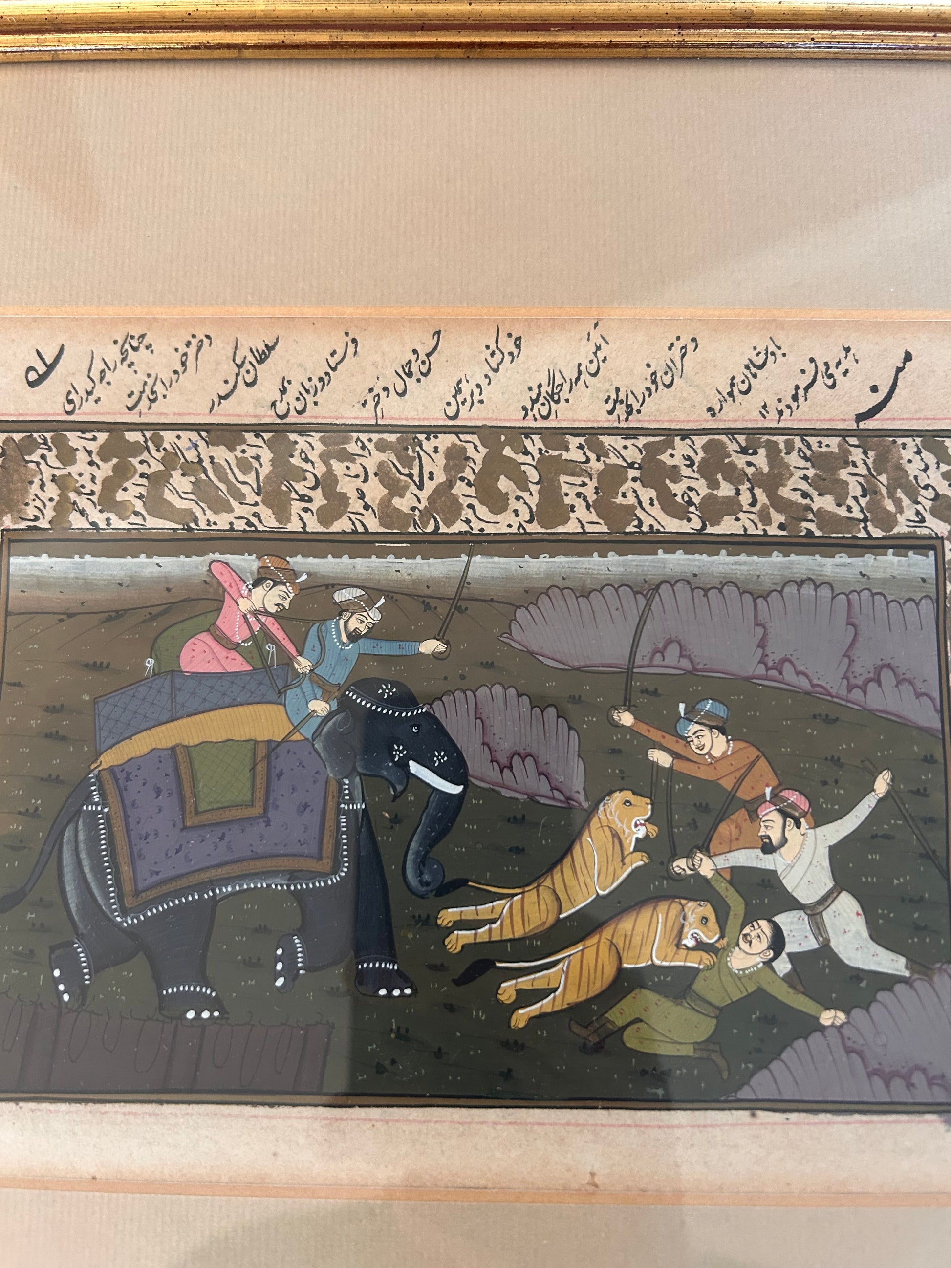35 x 28 cm each small Indian miniature pictures which have been well mounted and framed. A maharajah reclines on a large cushion and is entertained by musicians whilst the other one is a bit more gory - it depicts two men on an elephant being attacked by three swordsman. Unfortunately, the Tigers are beginning to devour one of the soldiers!