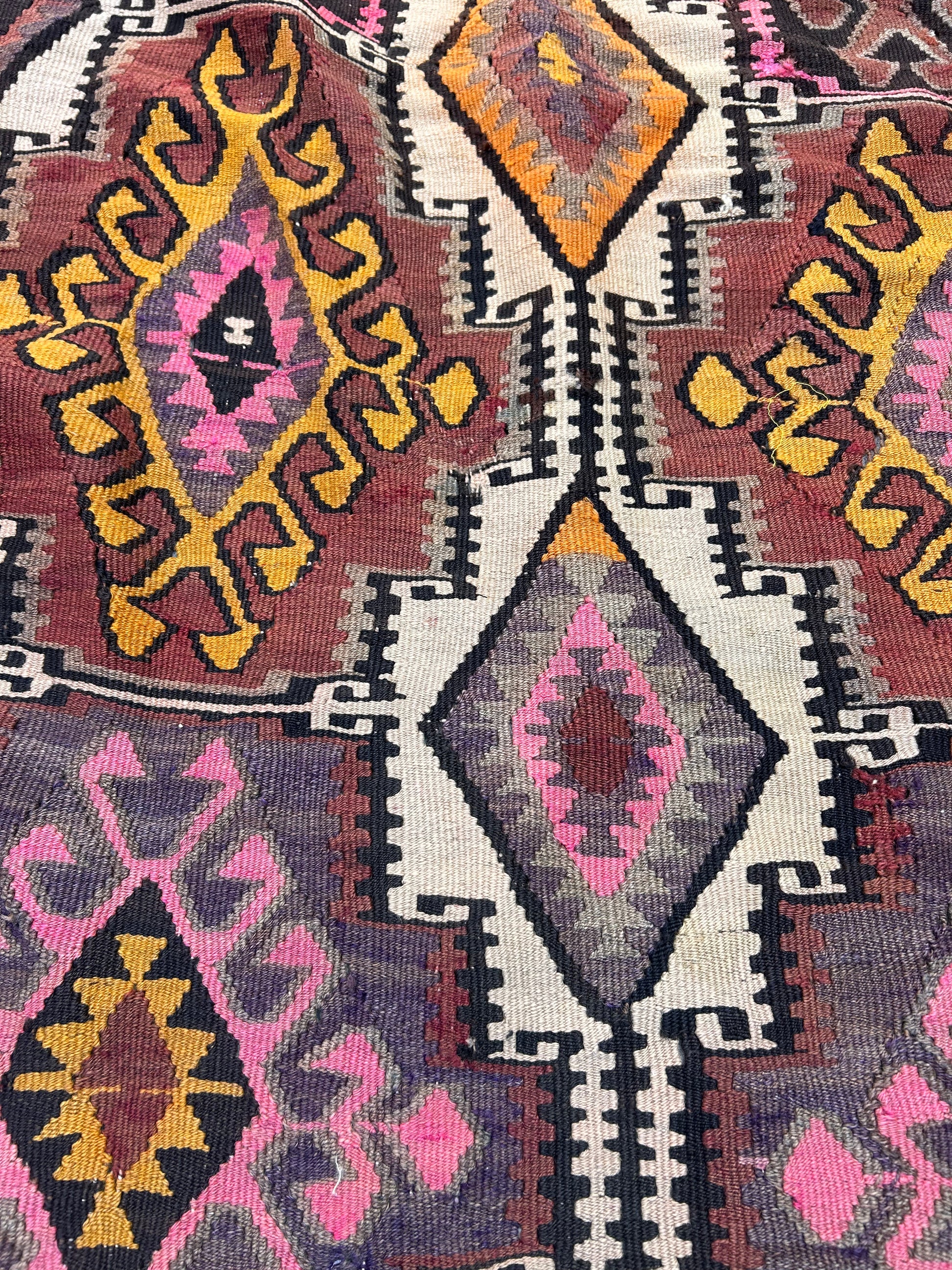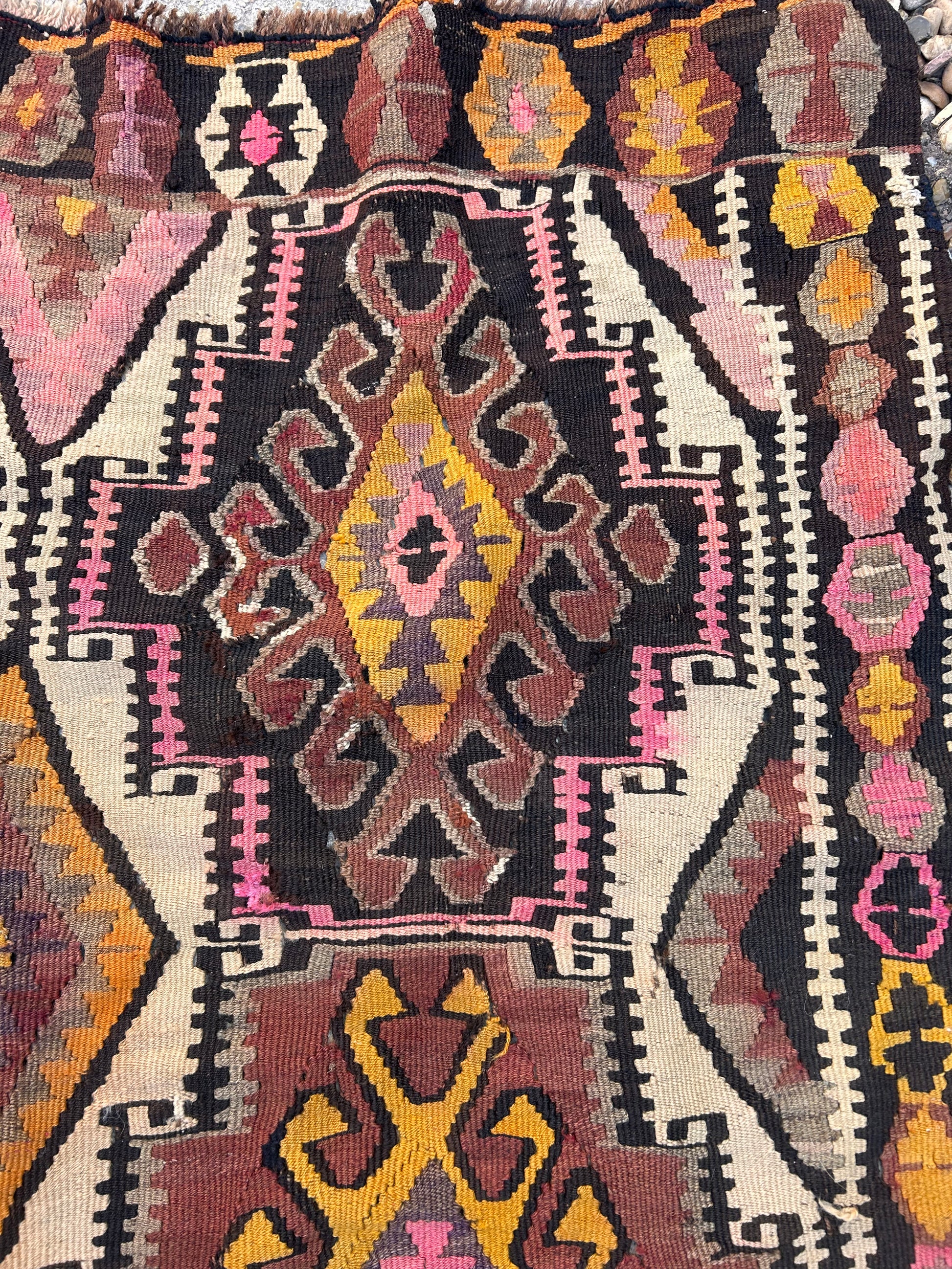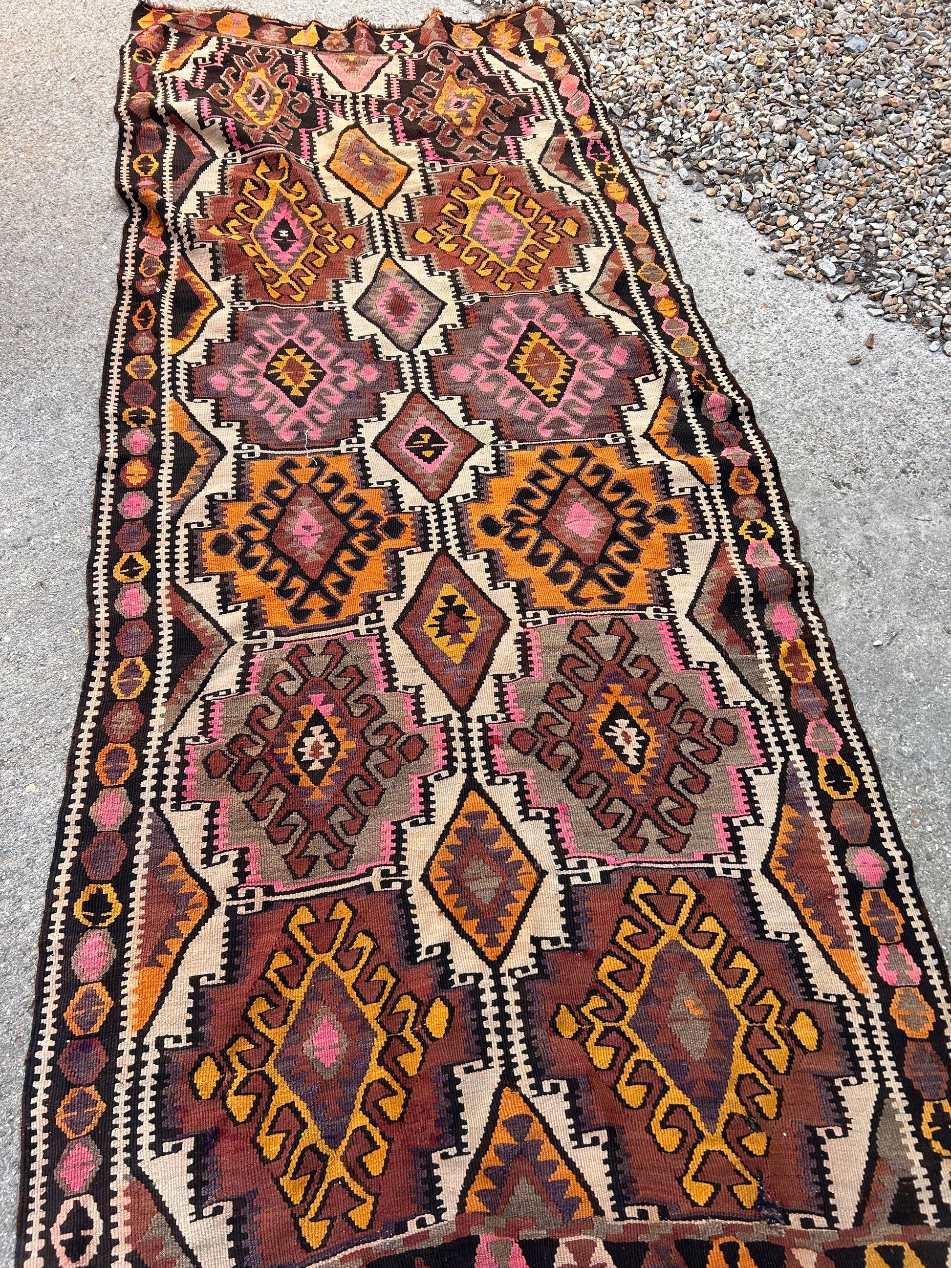 300 cm x 122 cm. I absolutely love this one if you have a wide hallway because of the autumnal & ochre / rich colours it would hide a lot of dirt if you have foot fall- But also, it’s got pops of bright pink- a fabulous vintage thick kilim £345