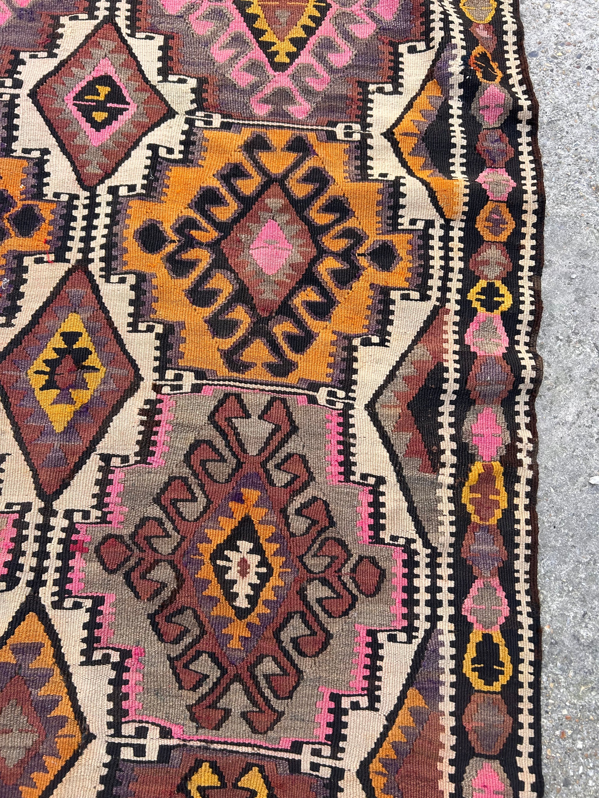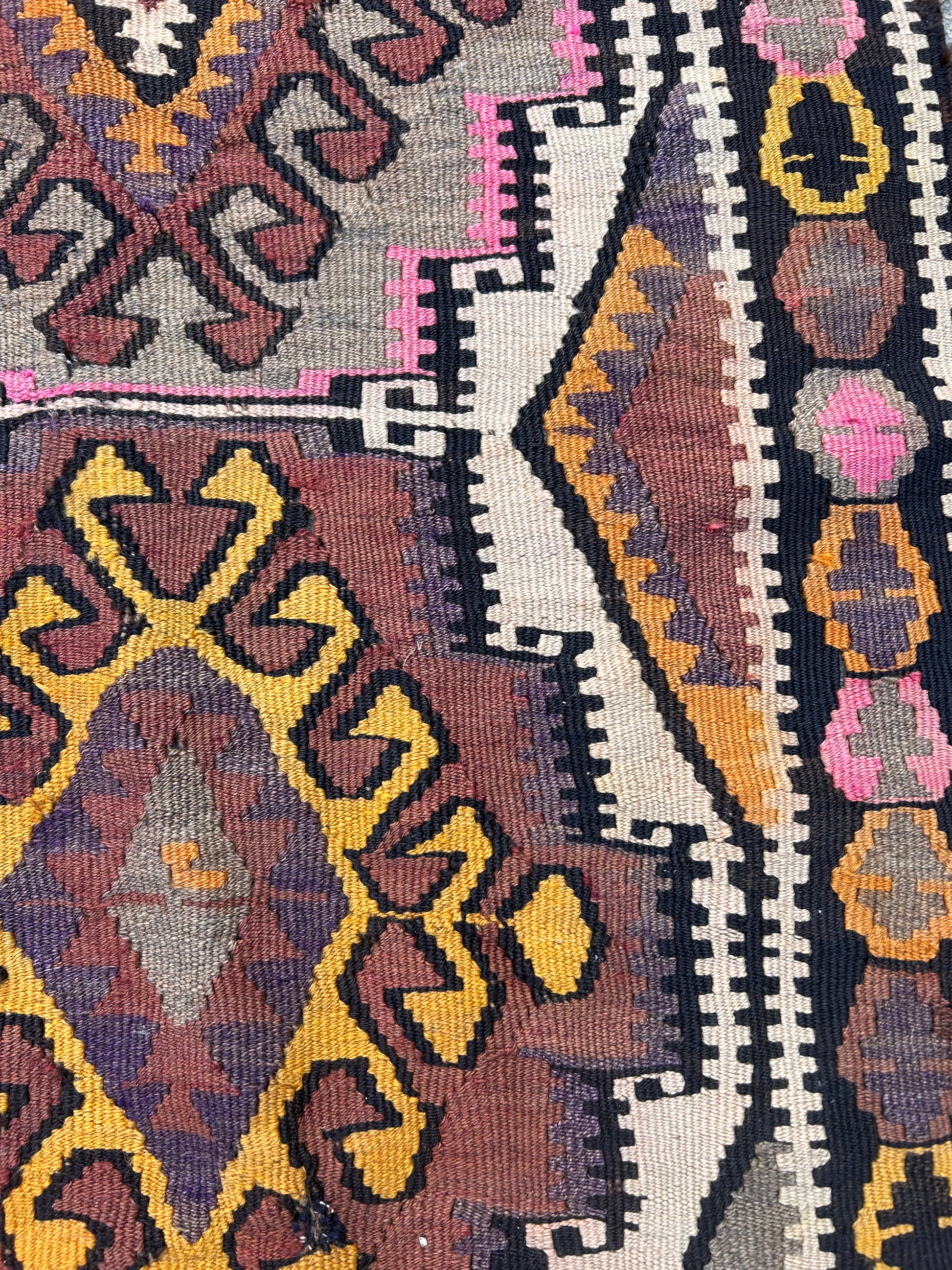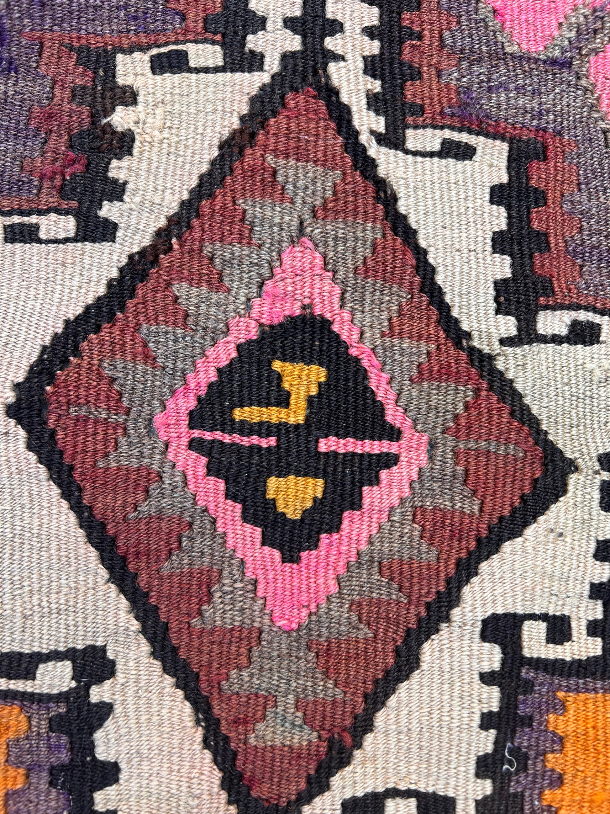 300 cm x 122 cm. I absolutely love this one if you have a wide hallway because of the autumnal & ochre / rich colours it would hide a lot of dirt if you have foot fall- But also, it’s got pops of bright pink- a fabulous vintage thick kilim £345