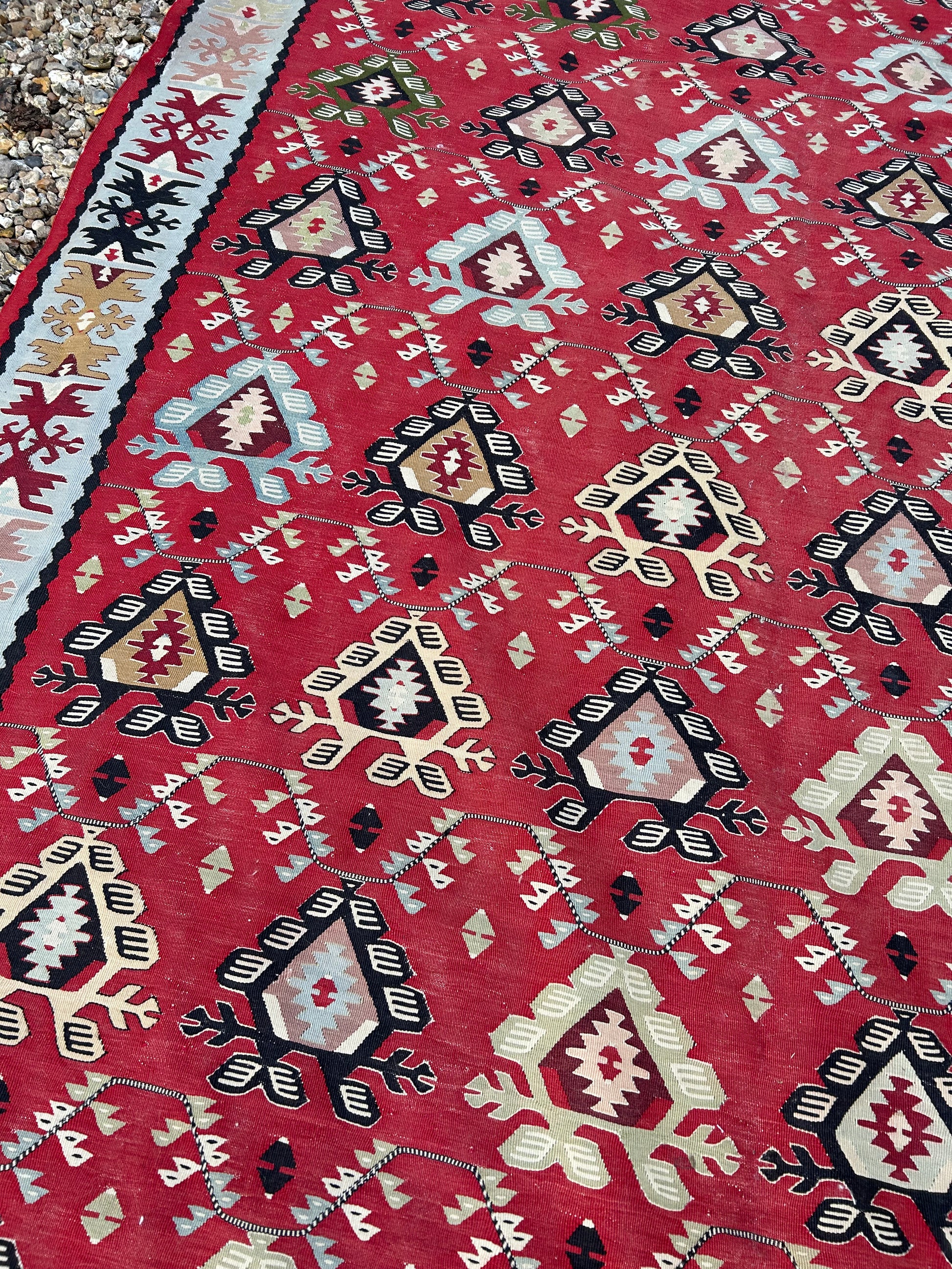 An absolutely fabulous and large kilim with rich reds and a striking green border, very good quality 210x310cm