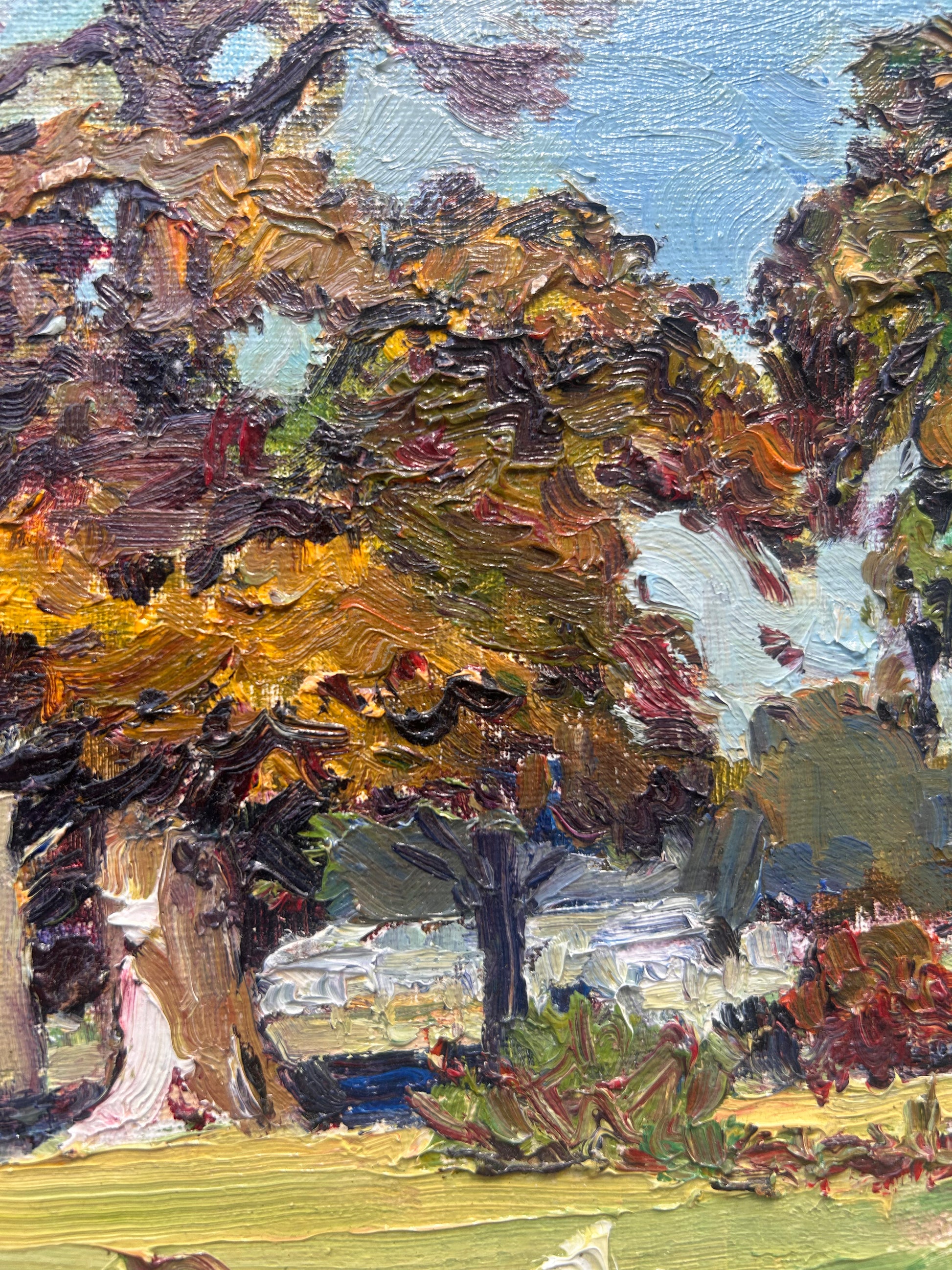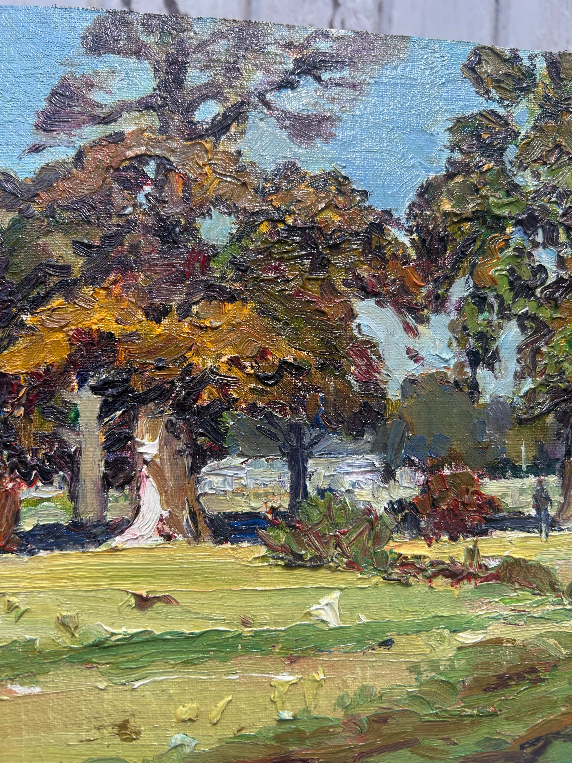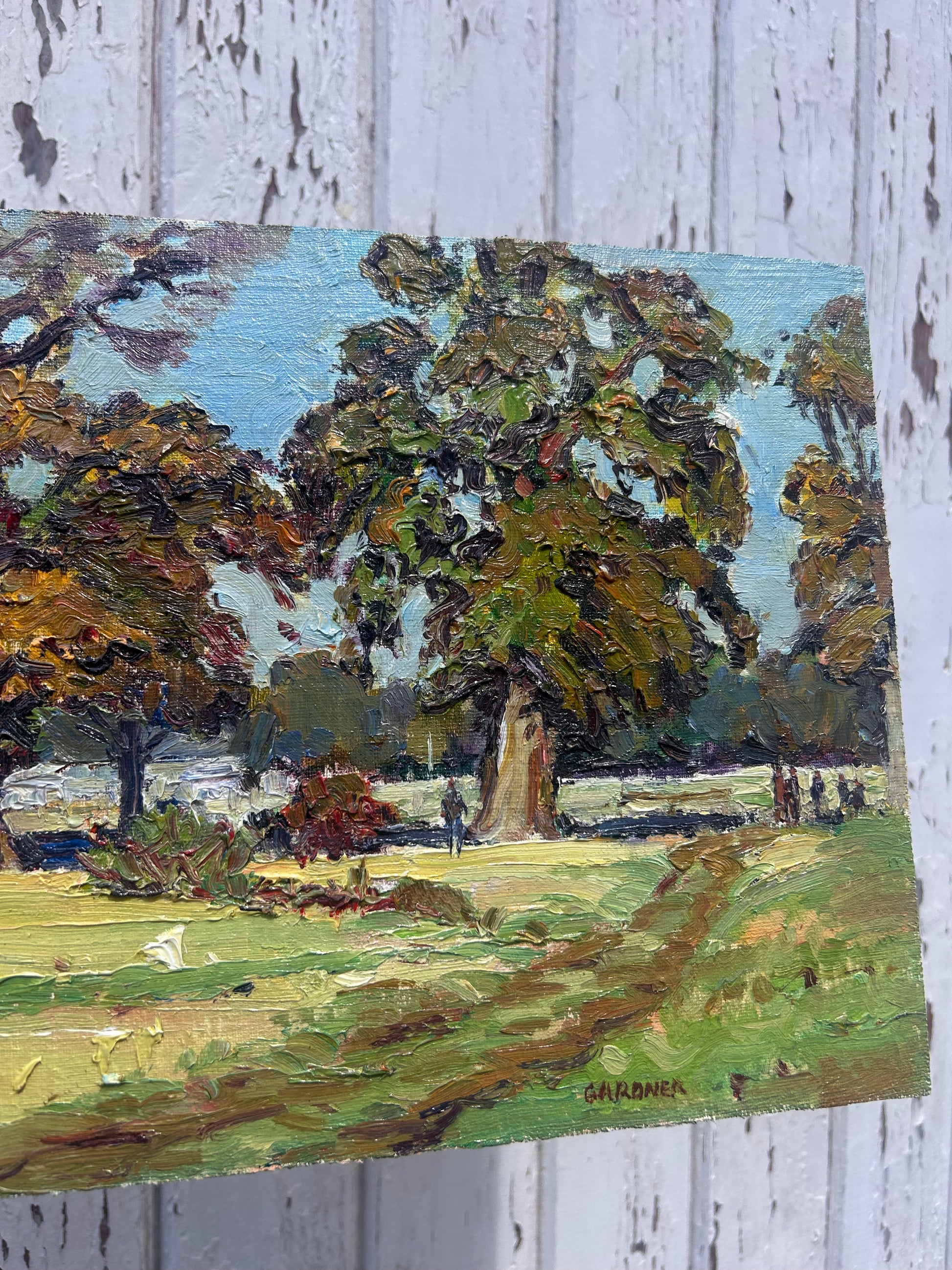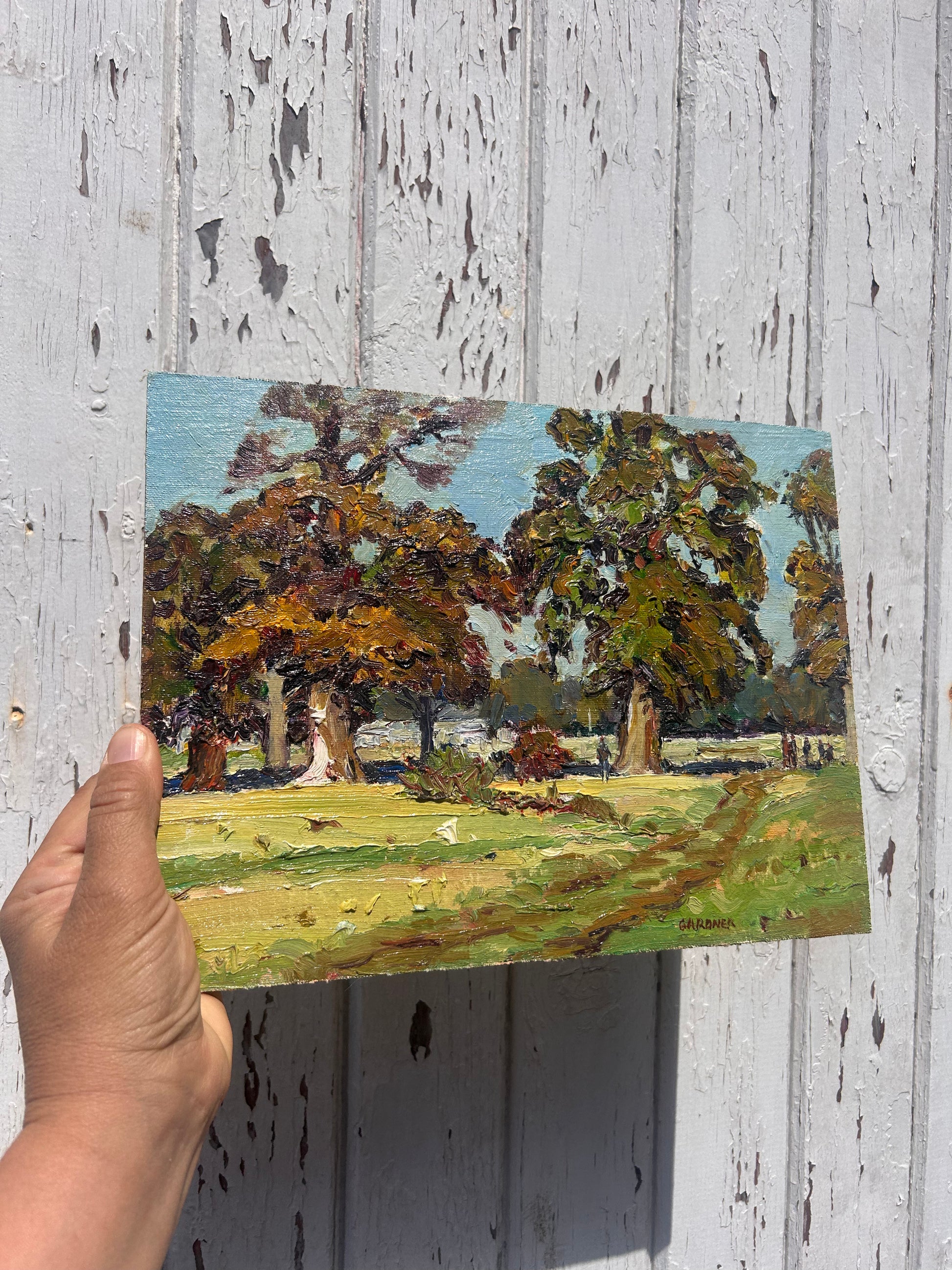 23 x 30 cm small unframed oil on board. Original painting of some mature oak trees in a parkland.