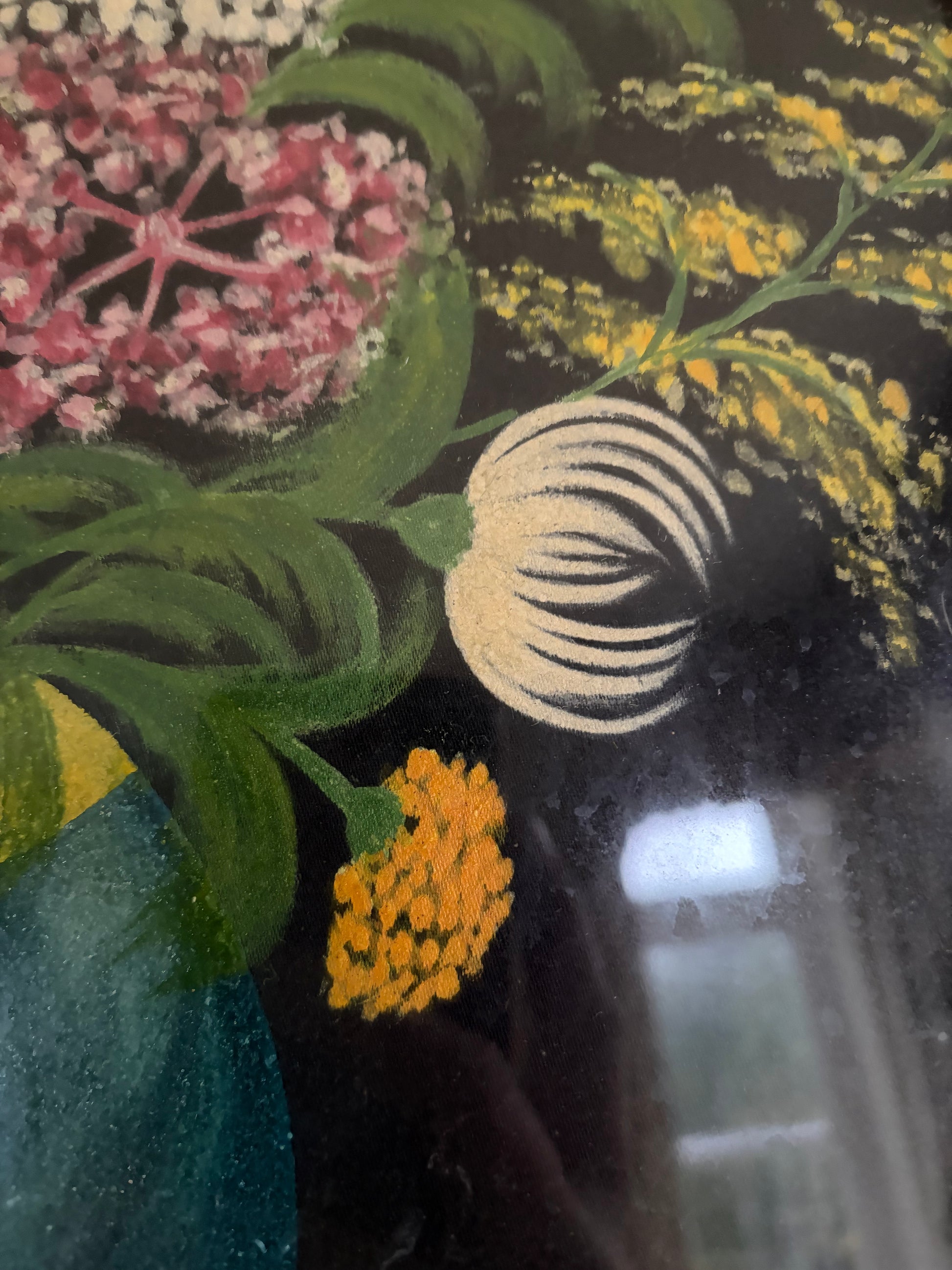 Difficult to photograph because it is glazed/ well framed very pleasing still Life. Has a flat quality which I like! Green vase on a red tablecloth - blousy bunch of garden flowers, including lilacs. 68 x 65 cm