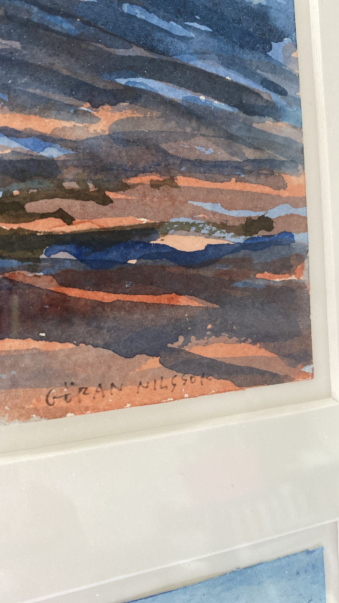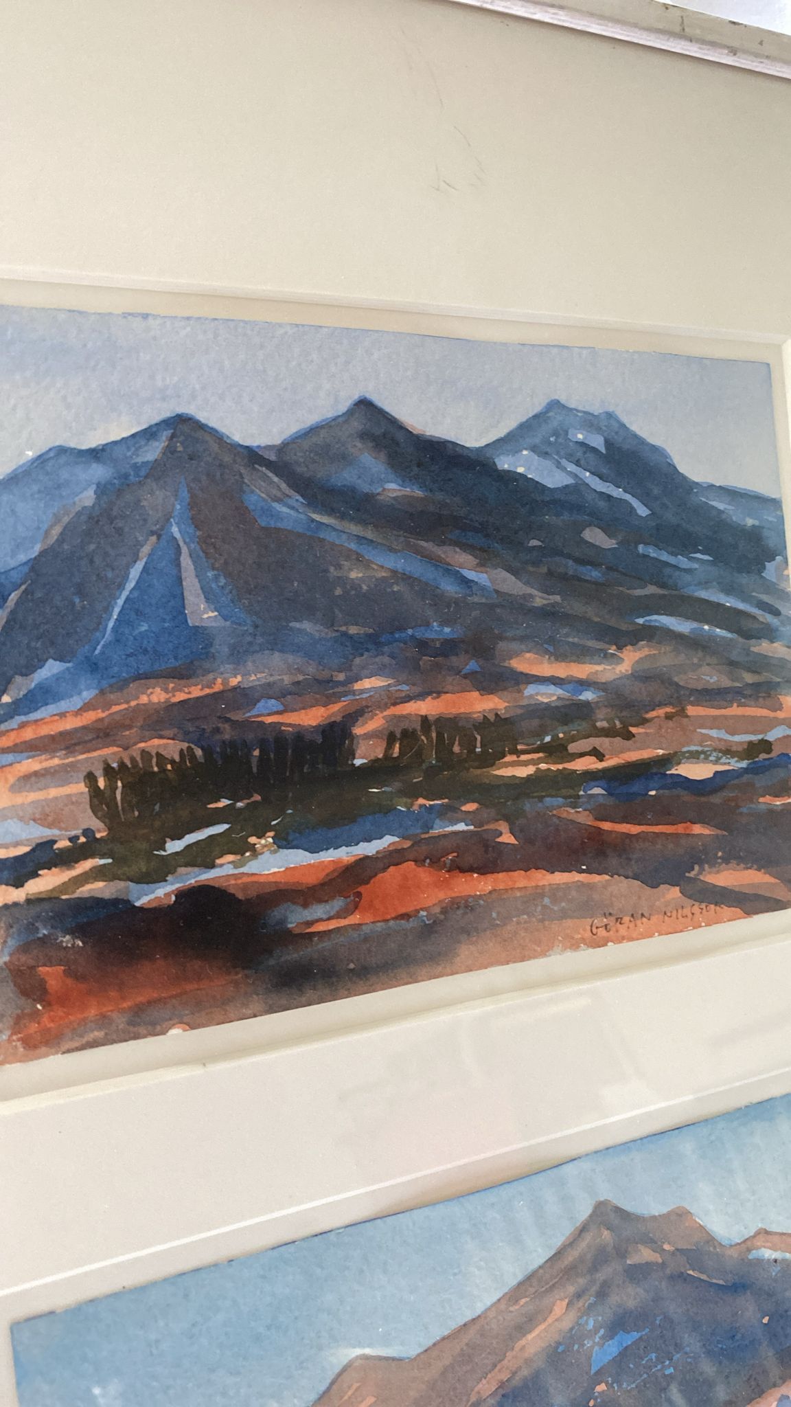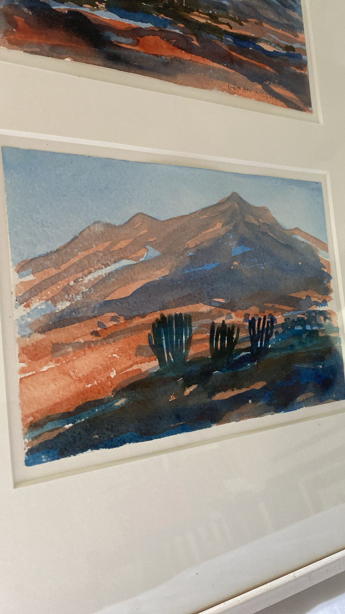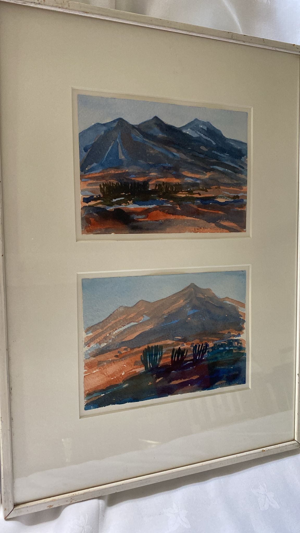 A pair of watercolours frame together in a good frame. Looks like the Mexican desert with cactuses. Sunset.