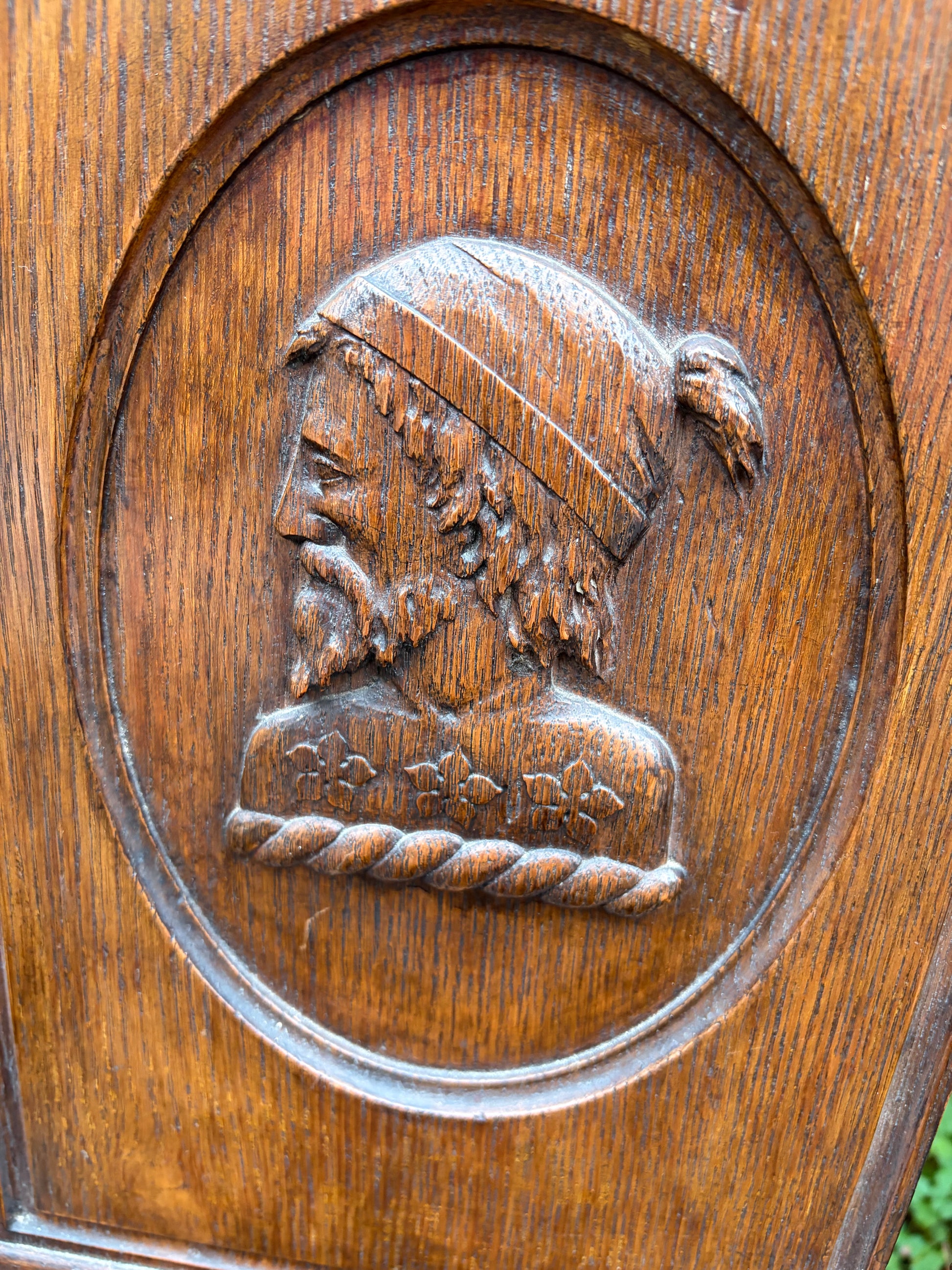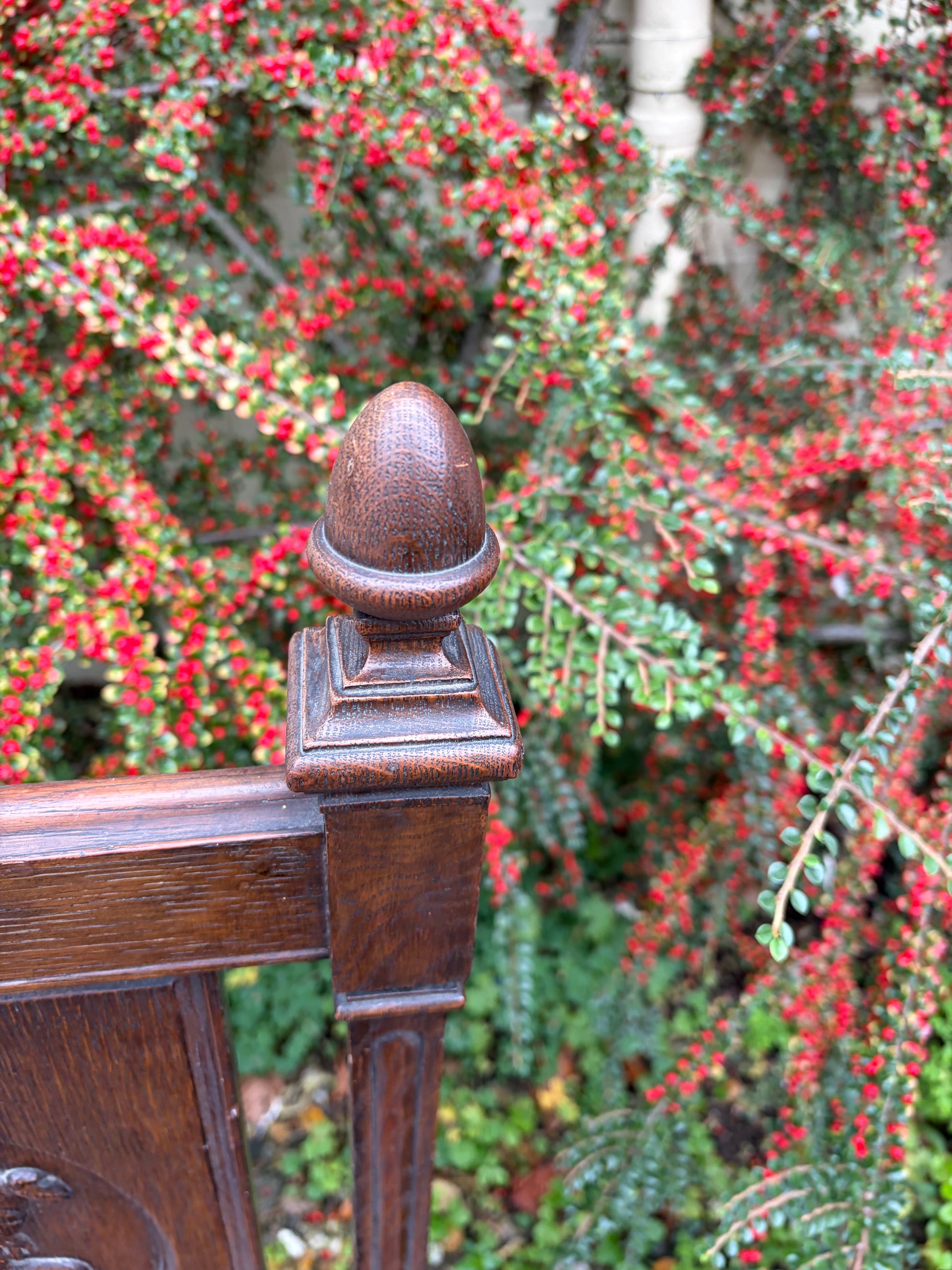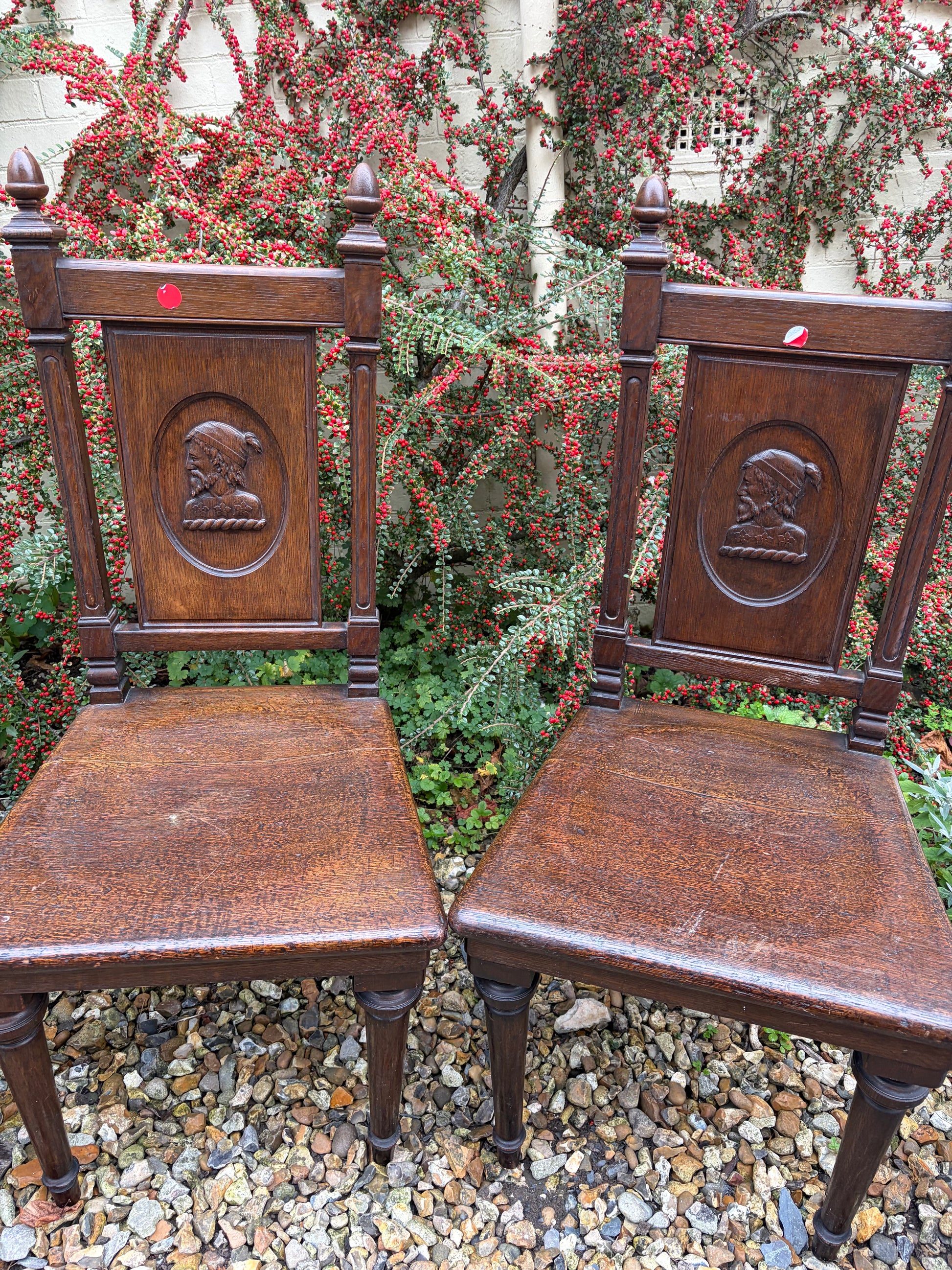 A pair of very sturdy wooden Antique chairs I particularly like the acorn details . Possibly hallway Chairs.