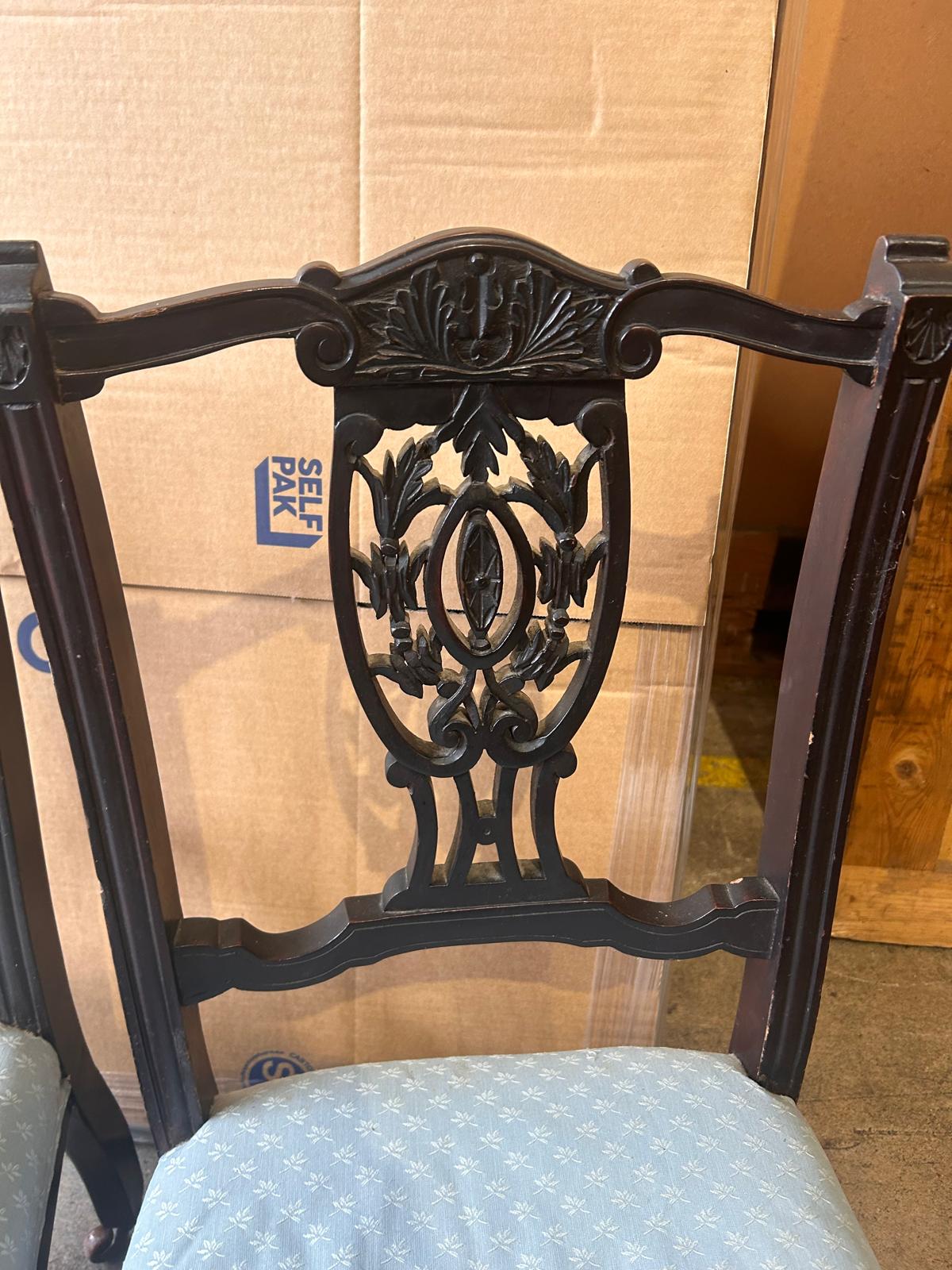 Sweet little pair of chairs width is 45 height is 73 depth- the PAIR Ideal for bathrooms/ bedrooms