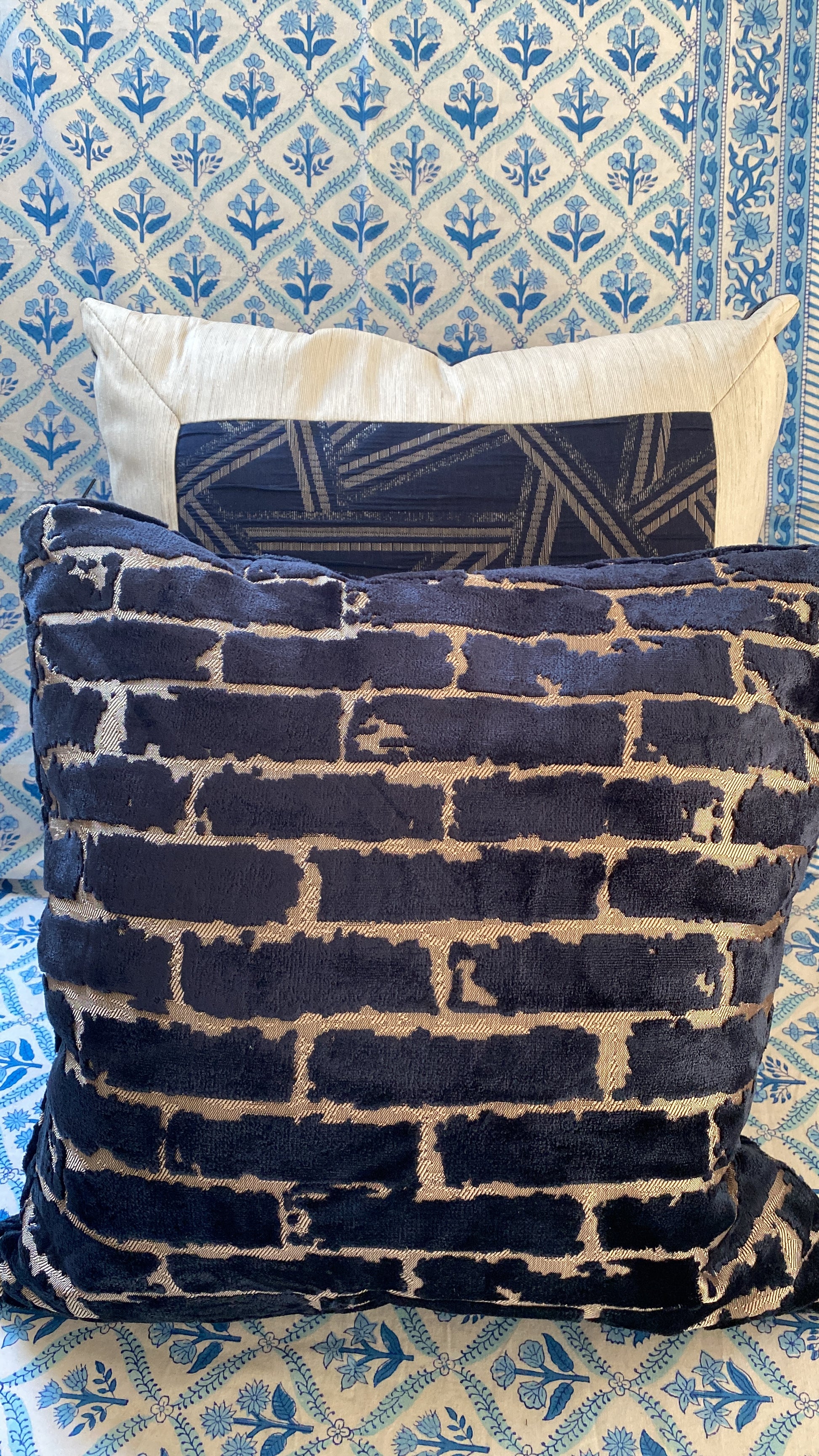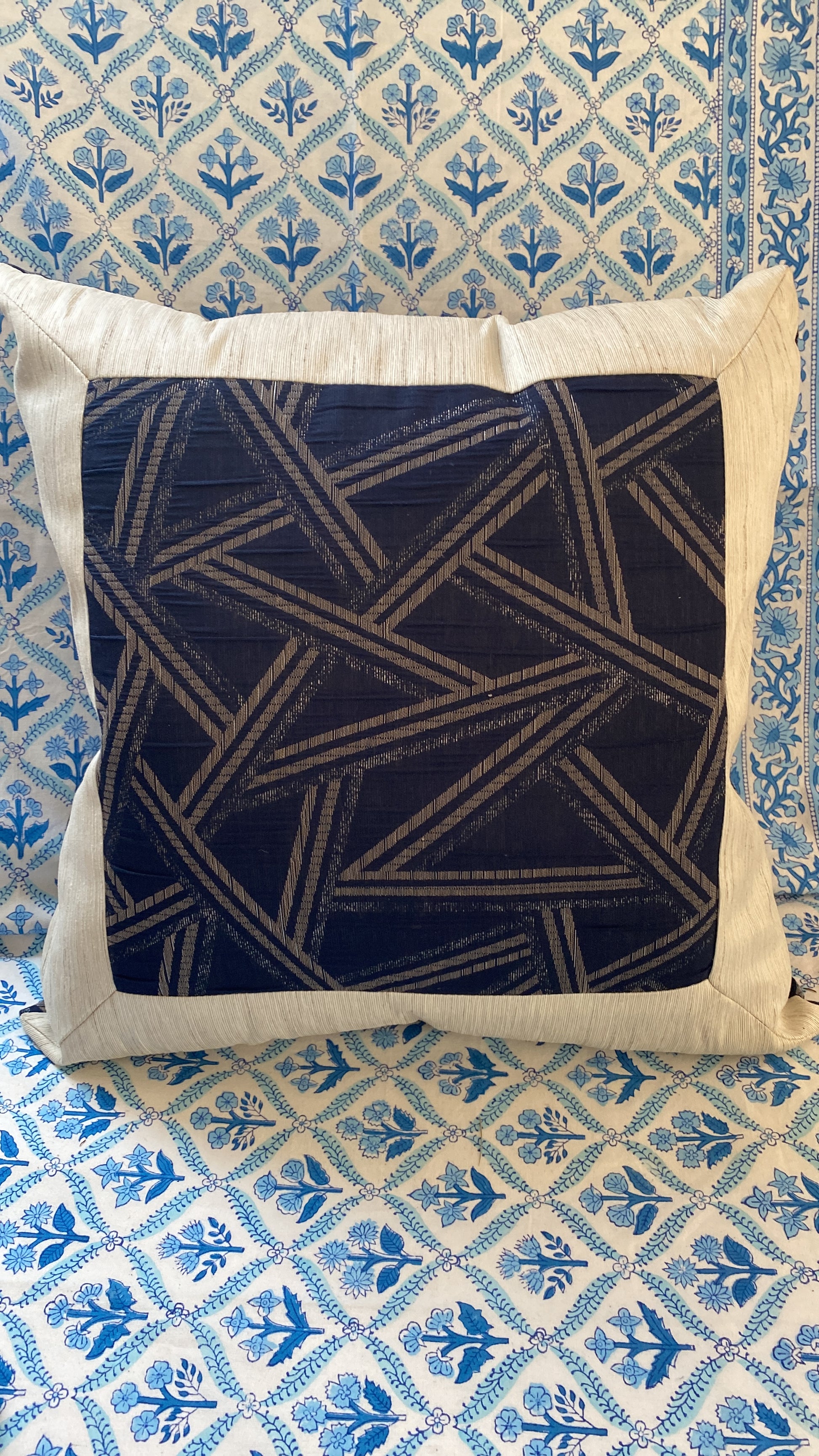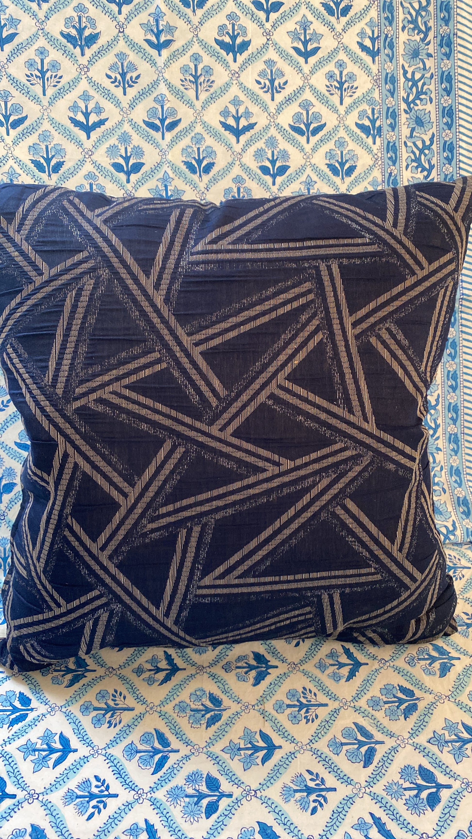 A pair of large navy blue and silver padded feather padded cushions. These are 45 cm²