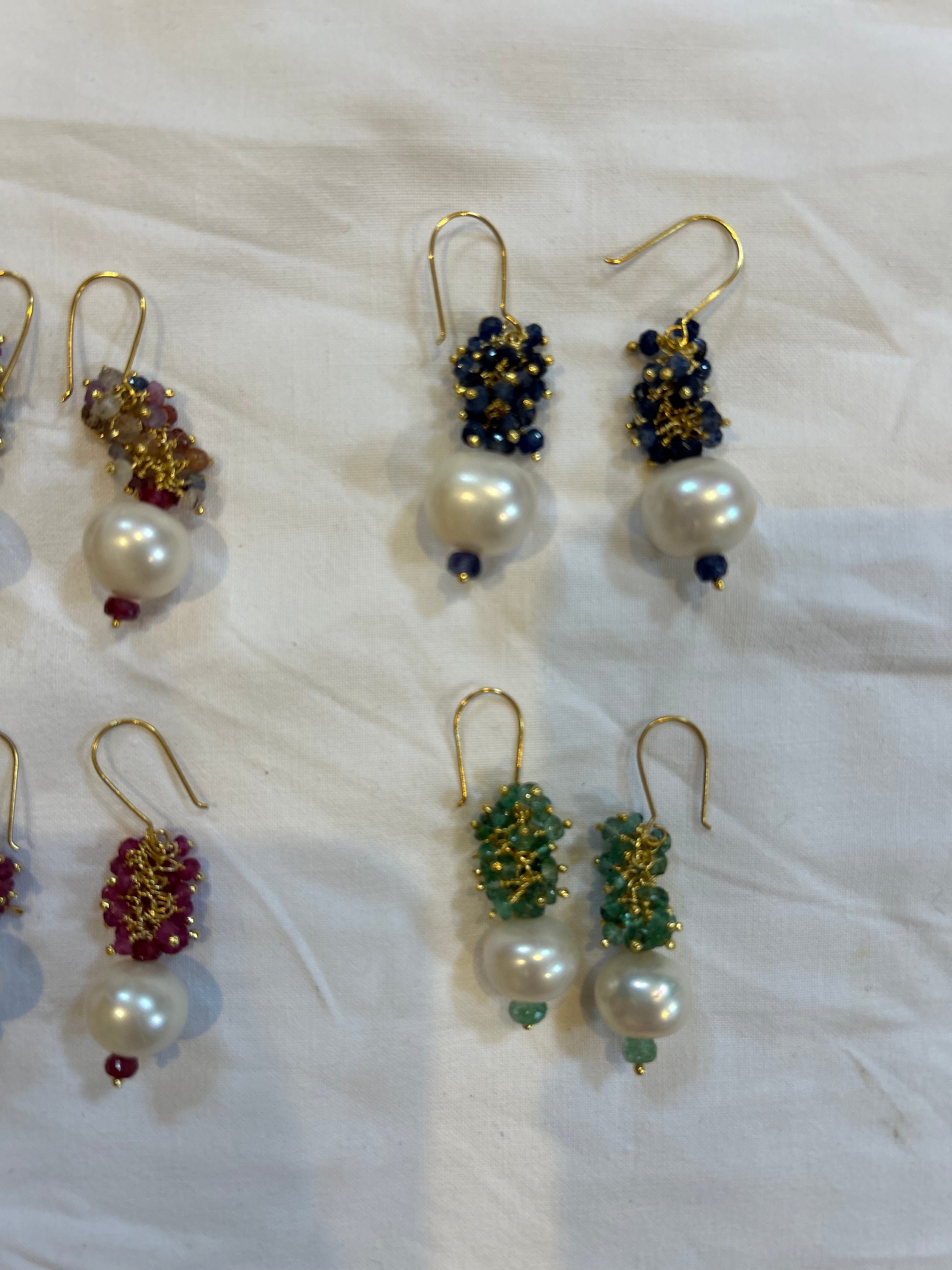 A couple of centimetres drop Emerald pieces threaded onto solid 9 carat gold with a lustrous pearl underneath and yet another Emerald beneath that