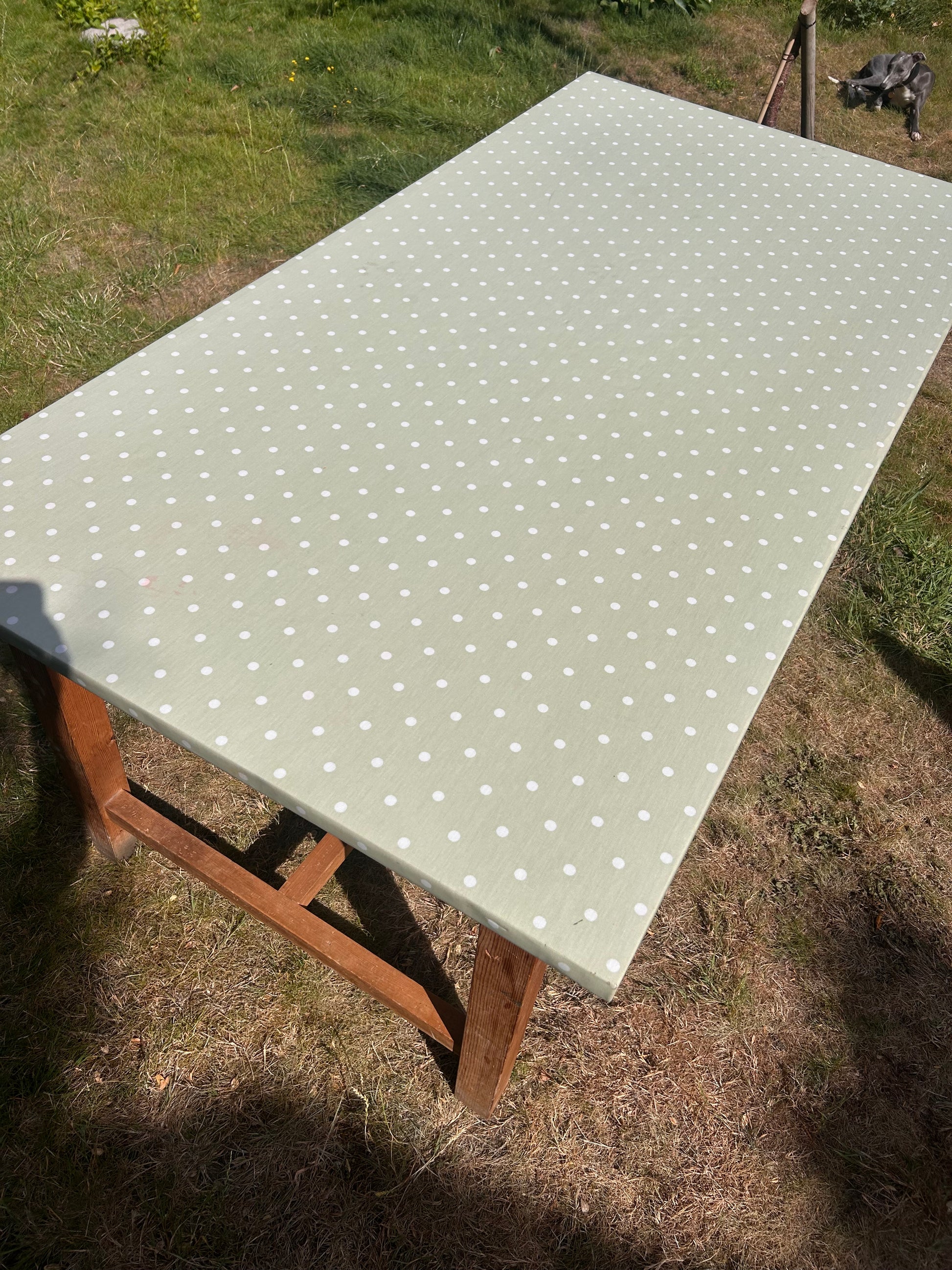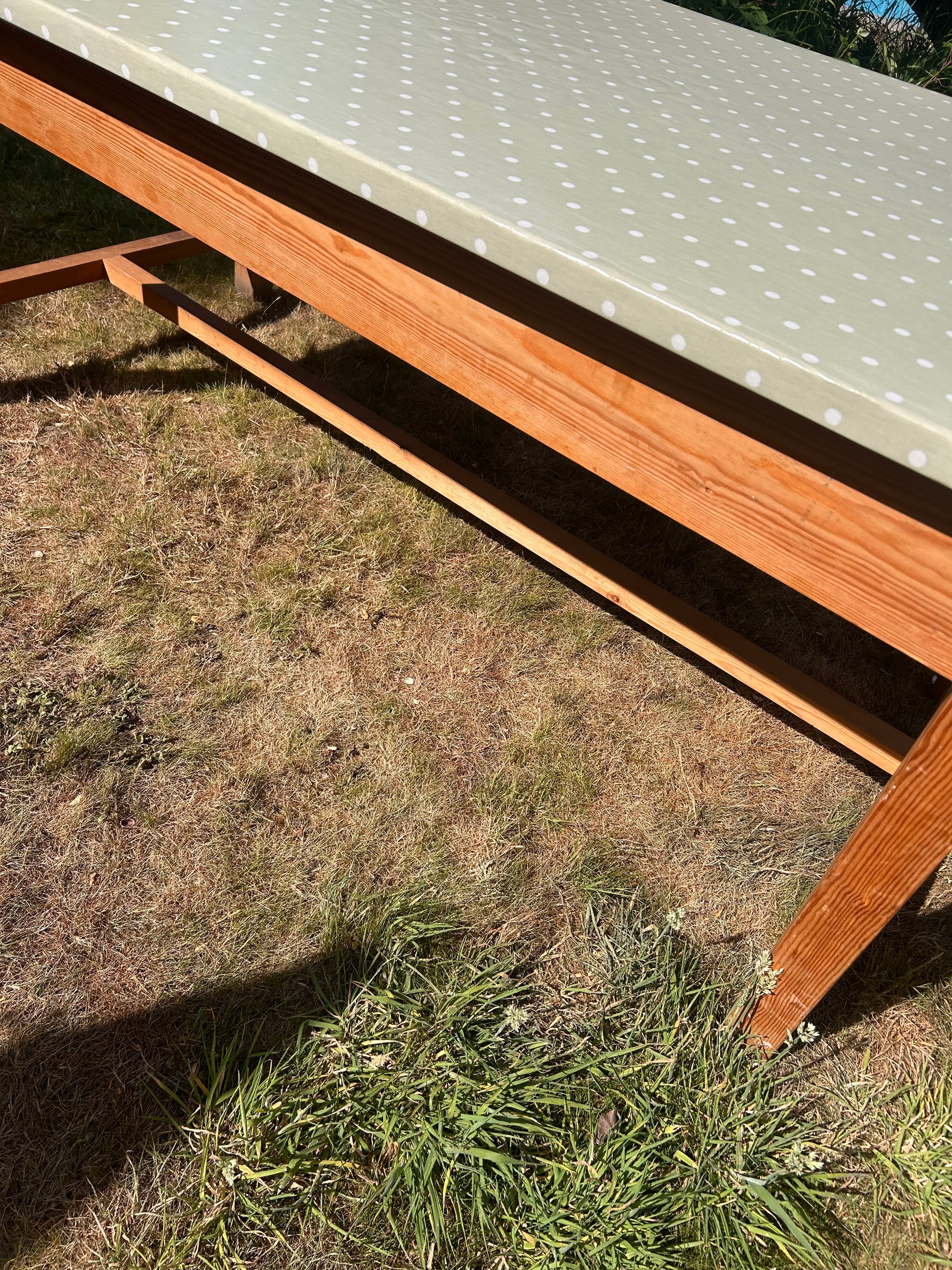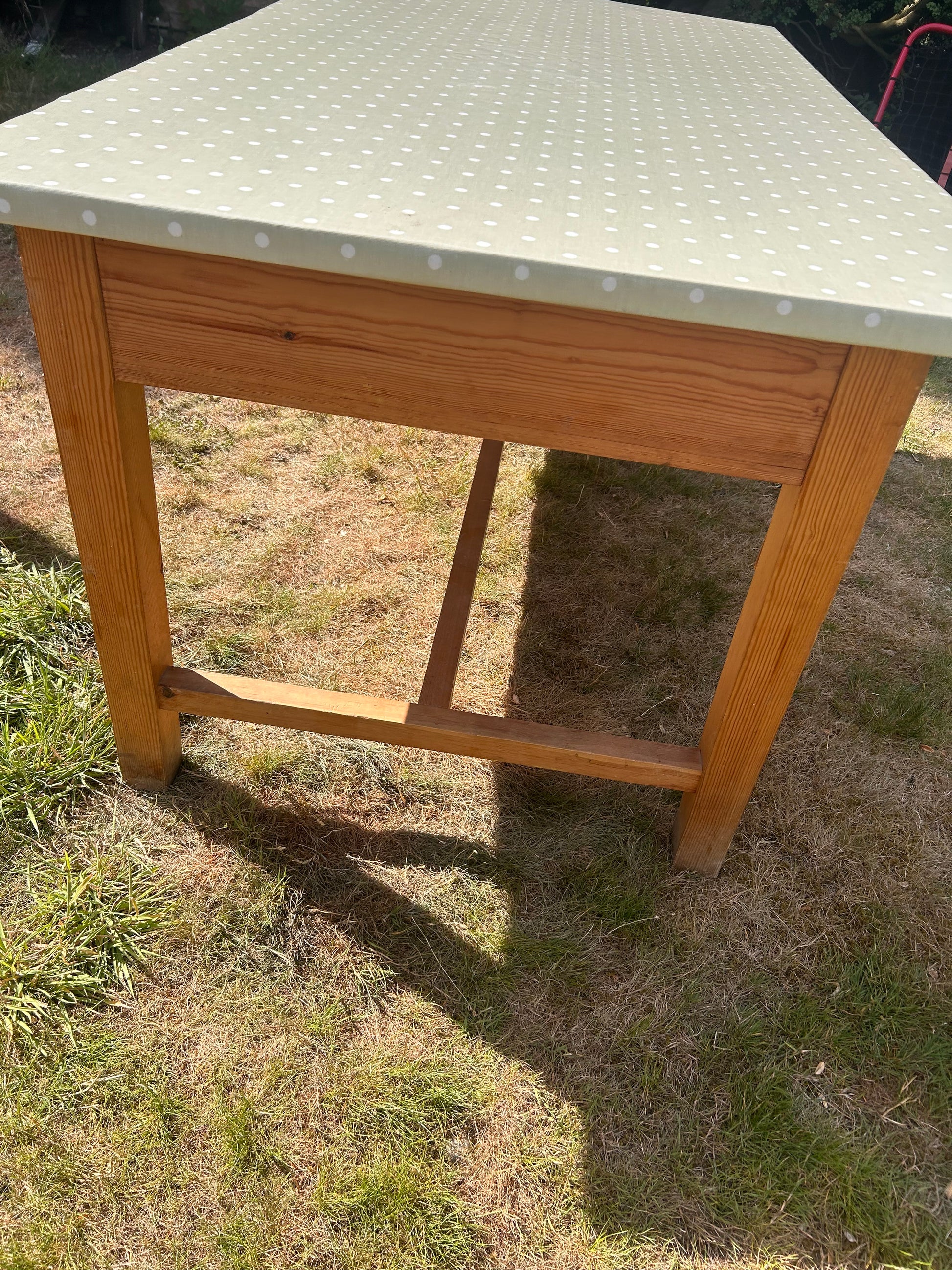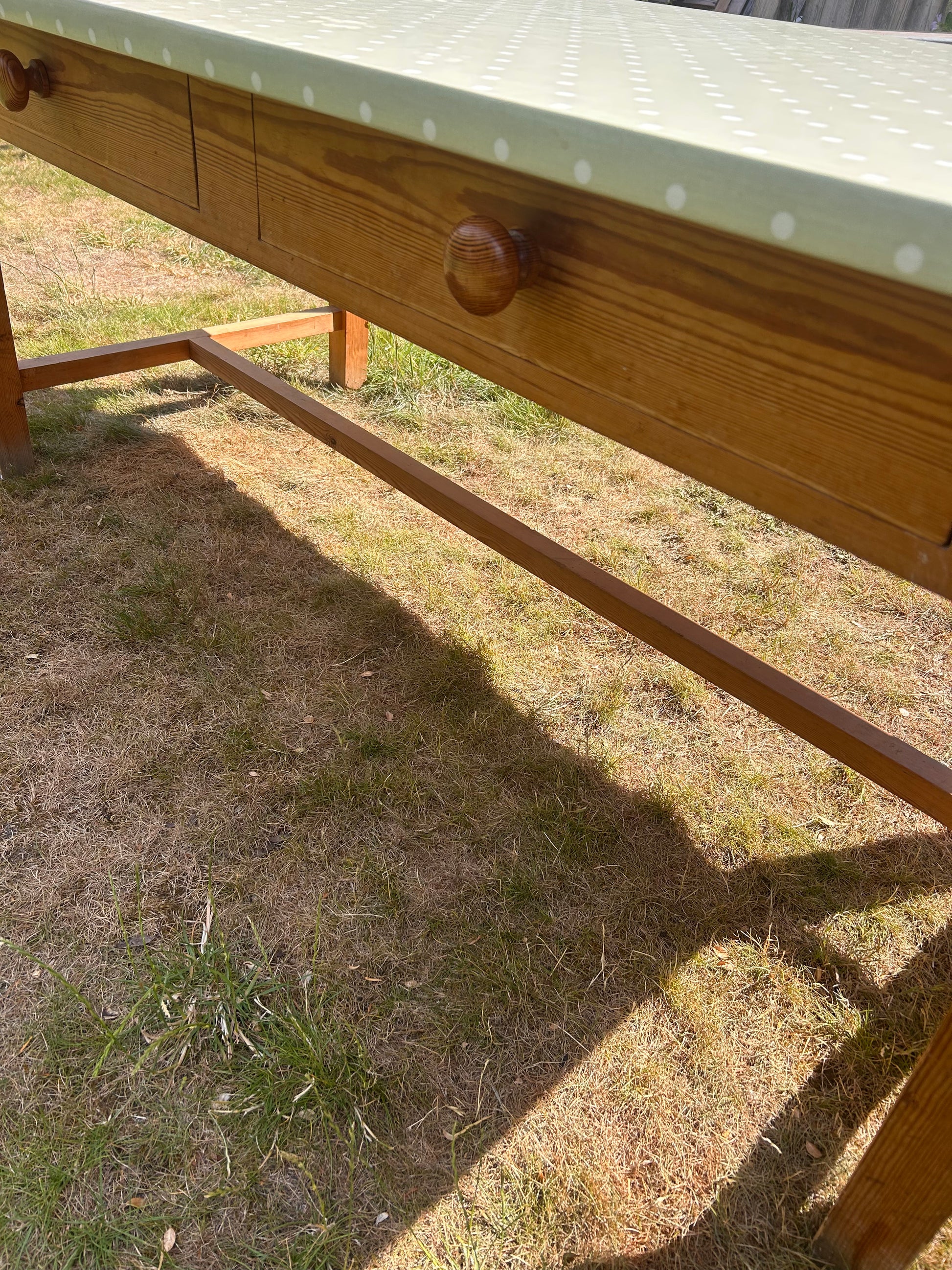 An absolutely perfect kitchen table which comfortably seats six. The length of it is 185 cm. The height of it is 80 cm and the width is 95 cm. It’s got two large drawers for Storage- And oil top cloth, which is so easy to clean.