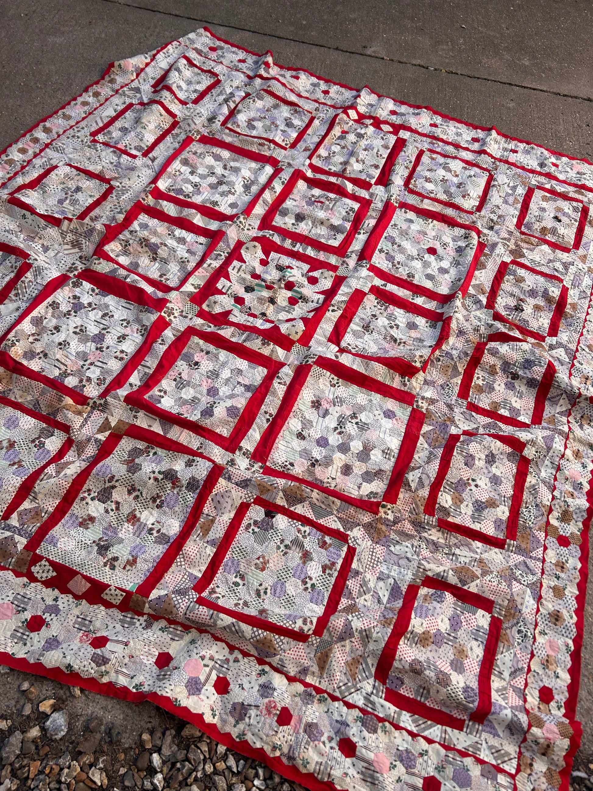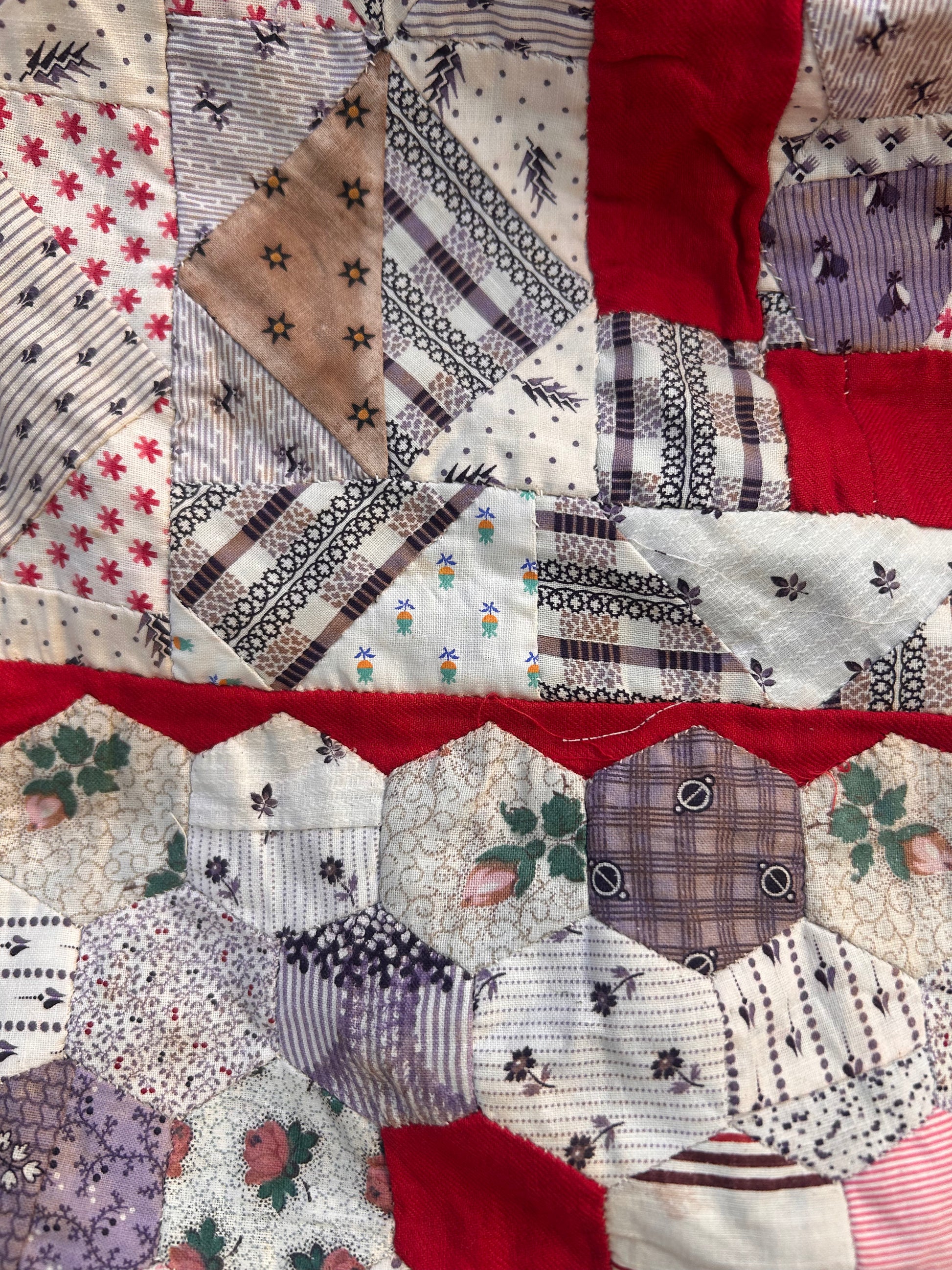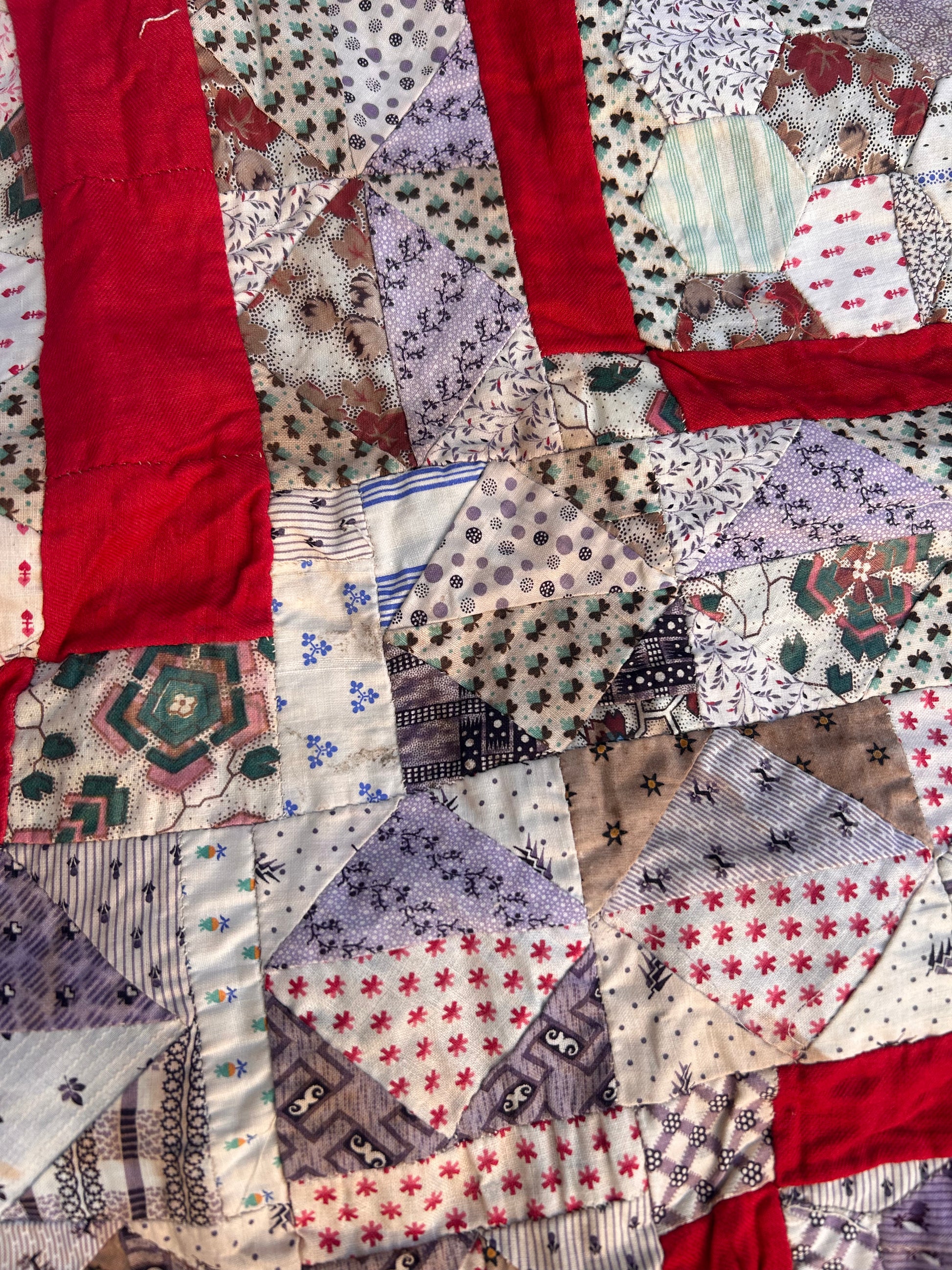 Vast antique patchwork quilt. This is not backed and would therefore be brilliant as a wall hanging… so many lovely materials/ a huge amount of work. All the patches are intact, although it does need a gentle hand wash/ it measures 260 x 220 cm £350