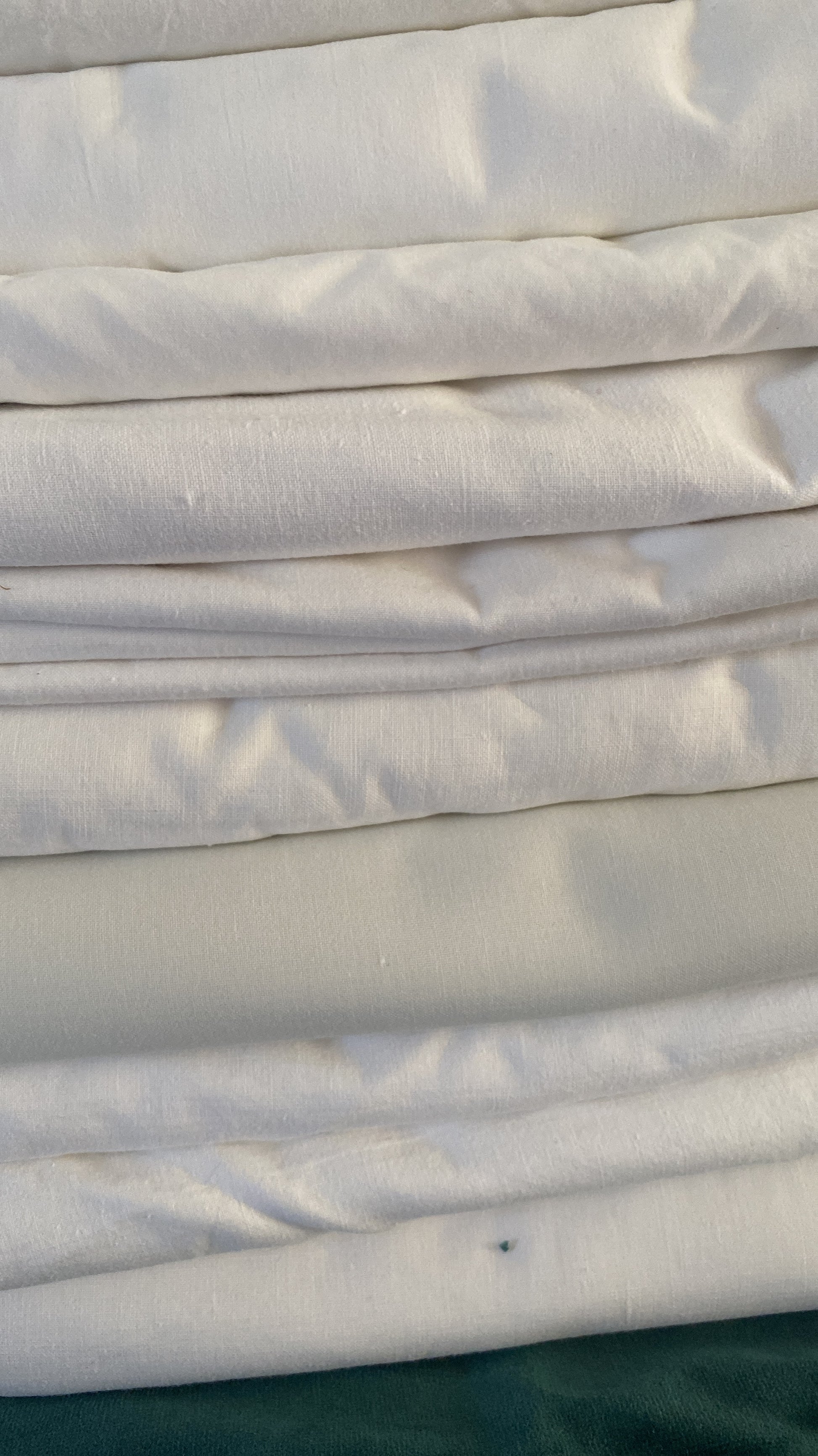 A mixture of Single flat cotton and linen sheets.