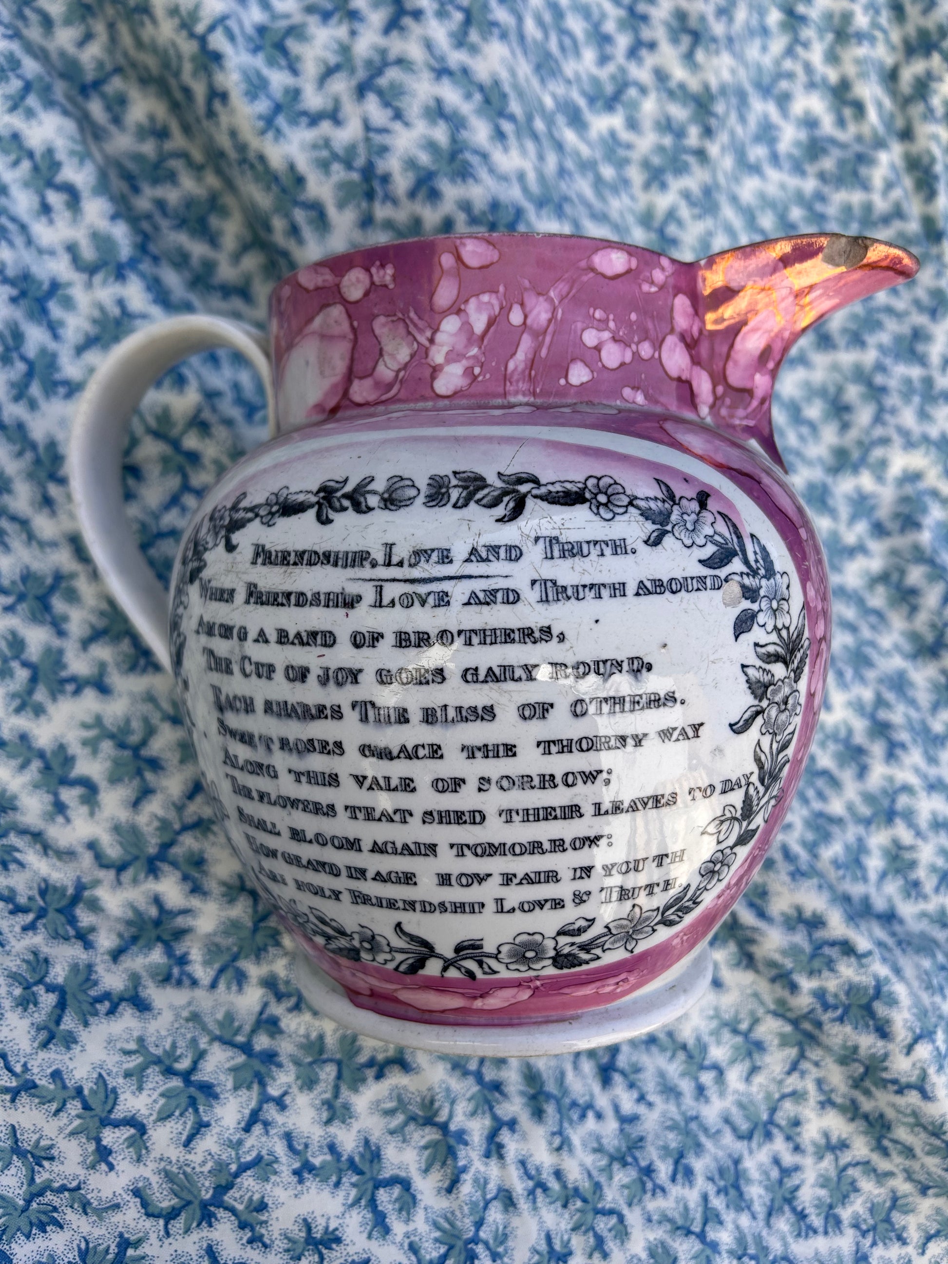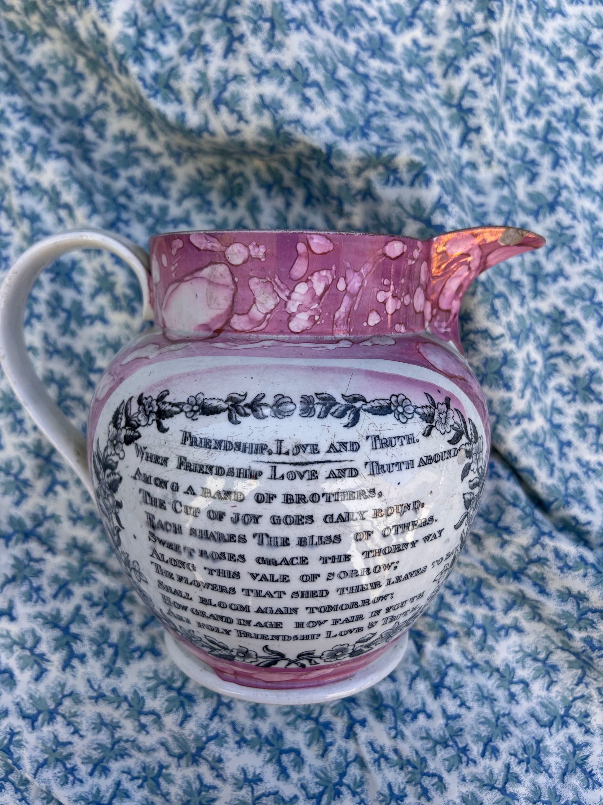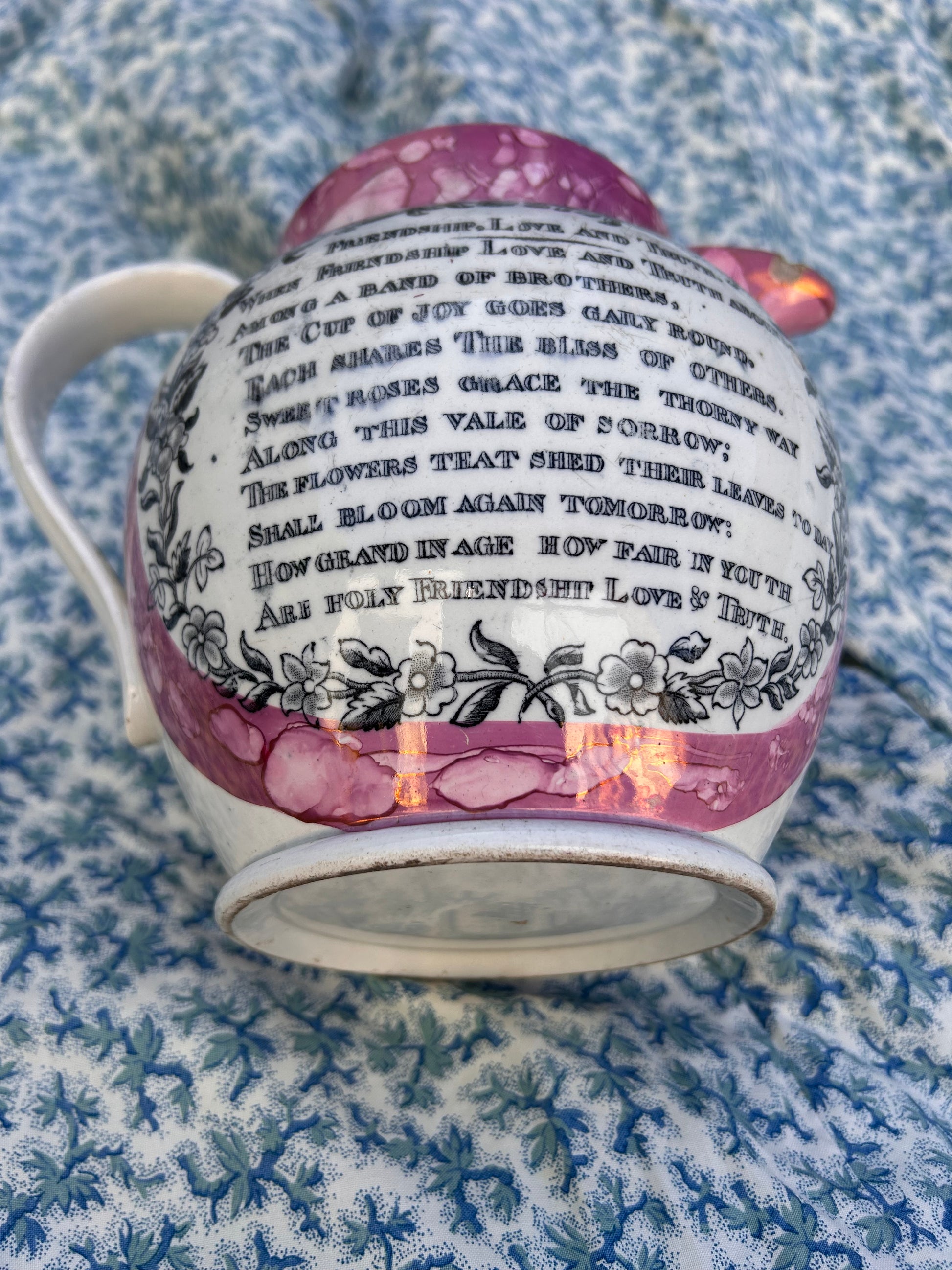 A beautiful Sunderland lustre jug. 1800’s & a poem about friendship love and truth. One chip on the spout otherwise in fabulous condition 25 cm from handle 190 to spout height is 20 cm a good big size on a kitchen dresser….