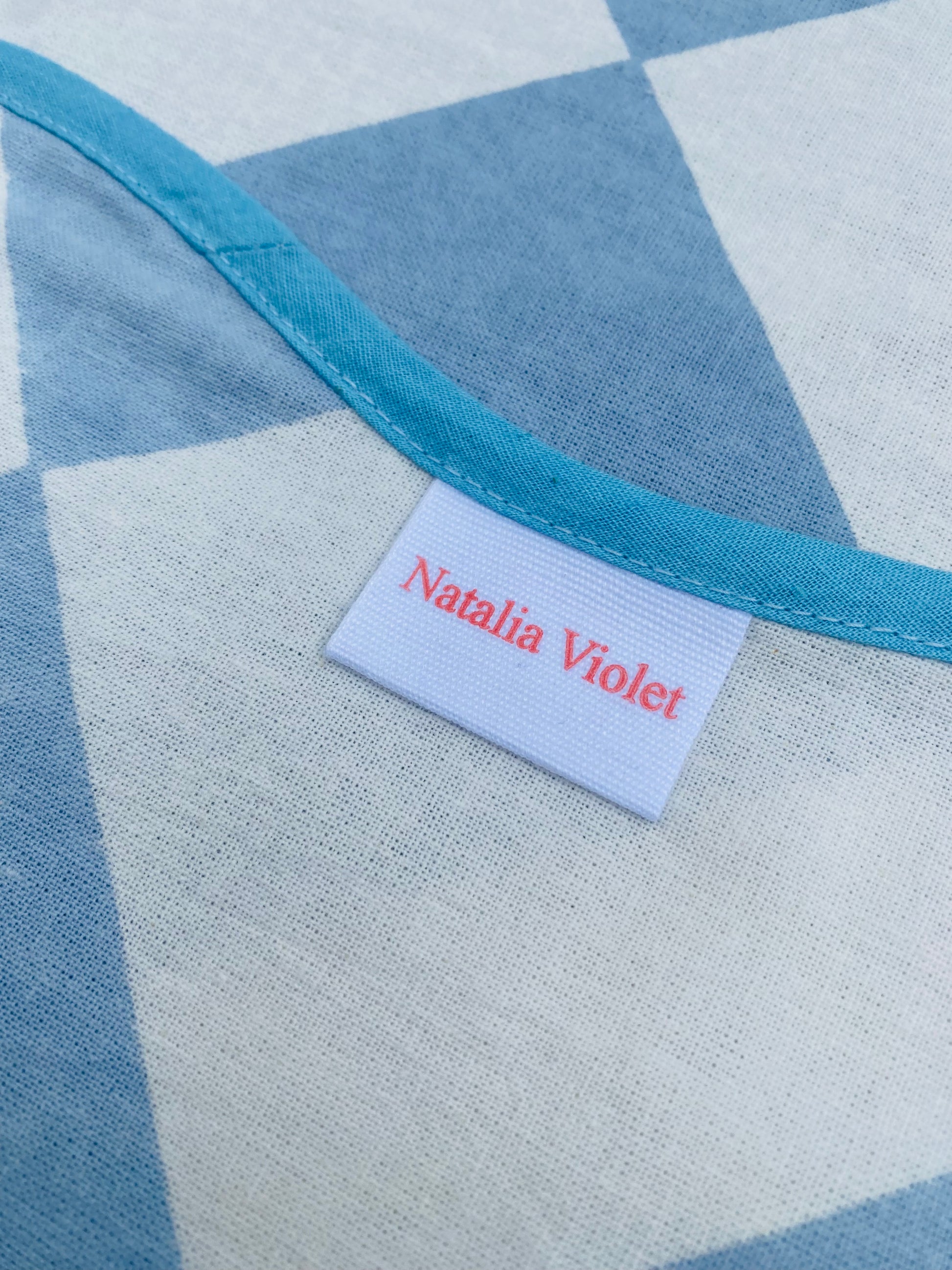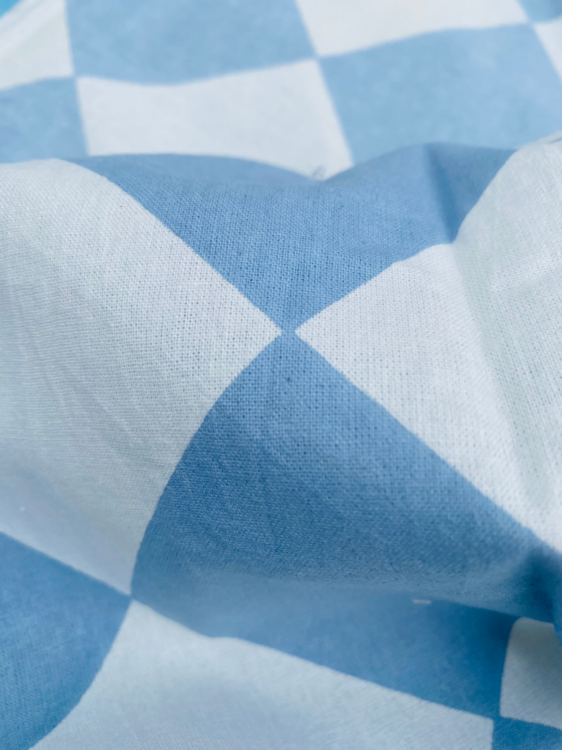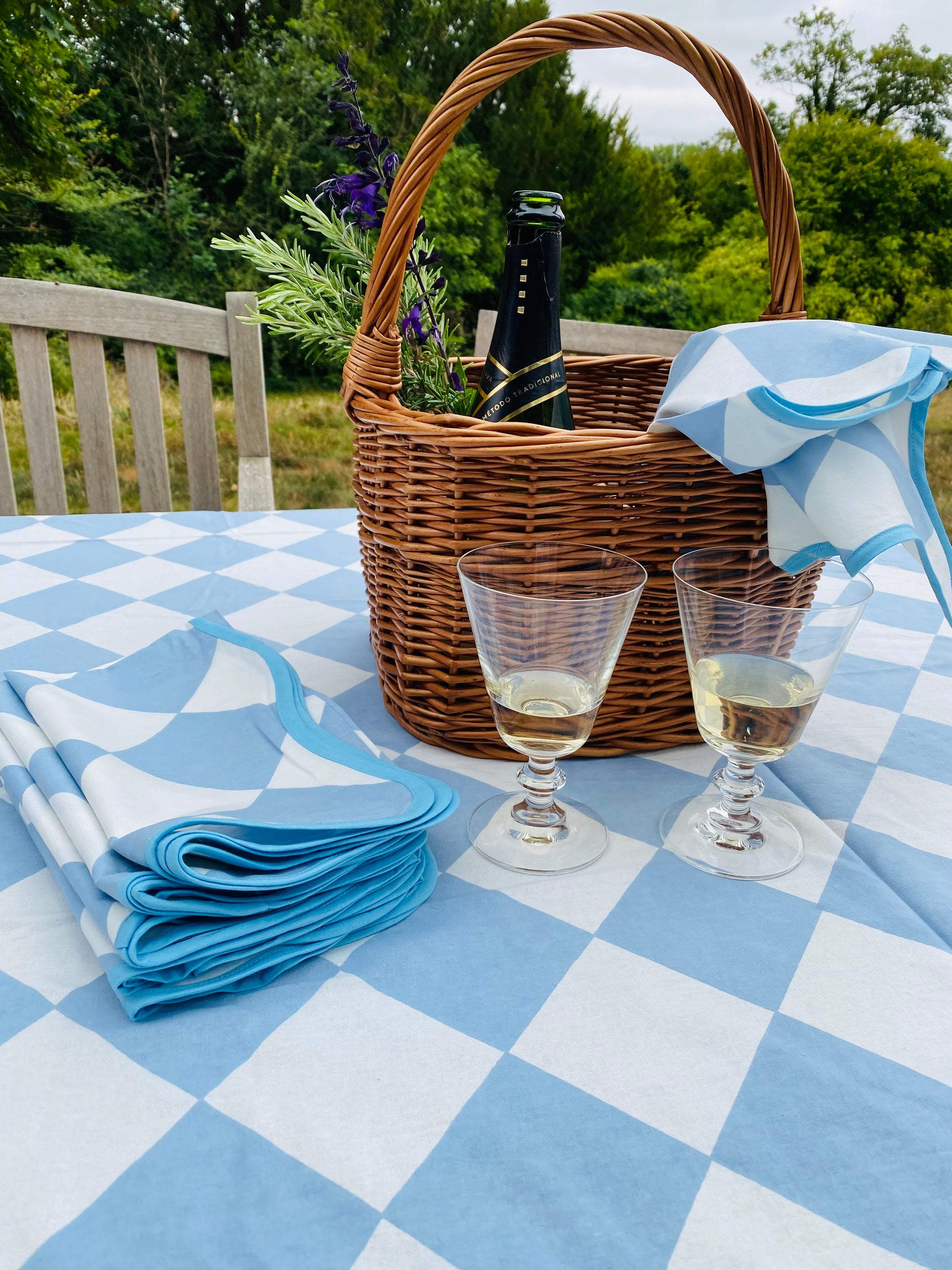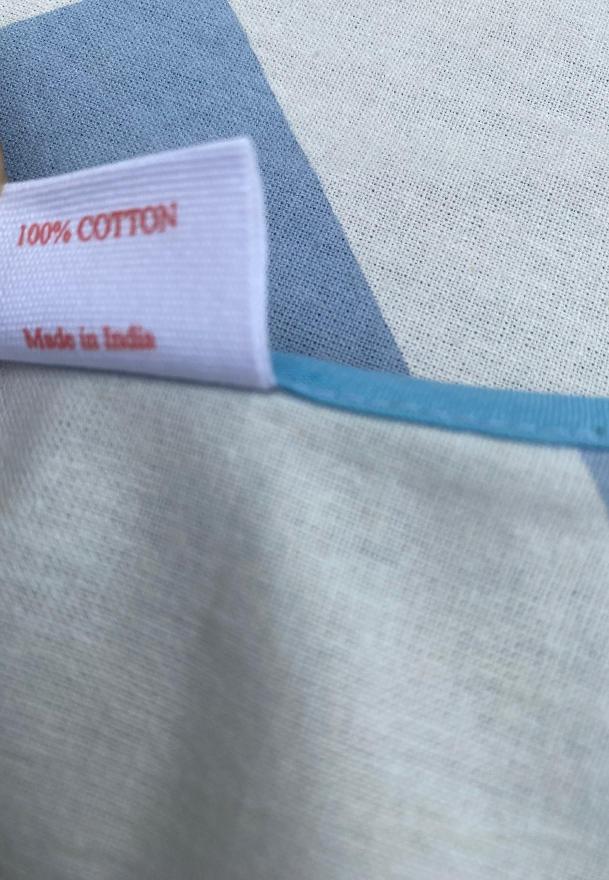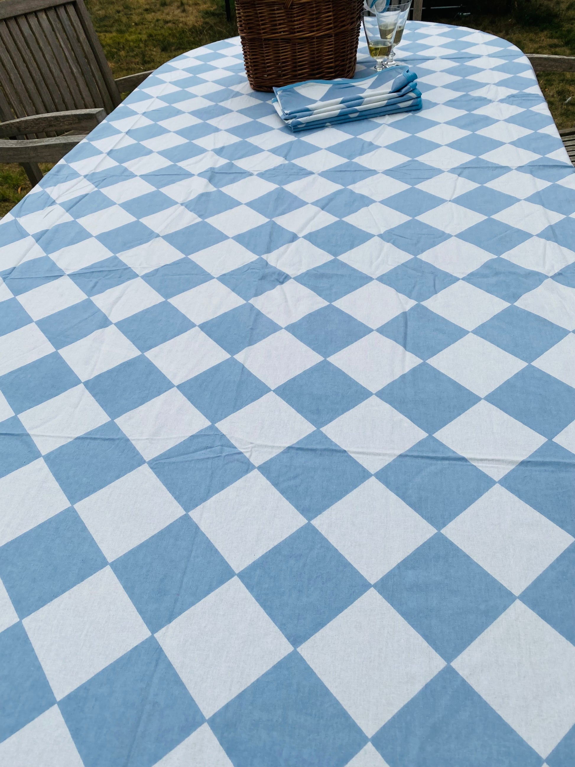 Cotton tablecloth measuring 150 cm x 300 cm with six scallop edge cotton napkins measuring 60 cm x 60 cm. These are a beautiful blue and white, 100% cotton and made in India. £80 for the set.