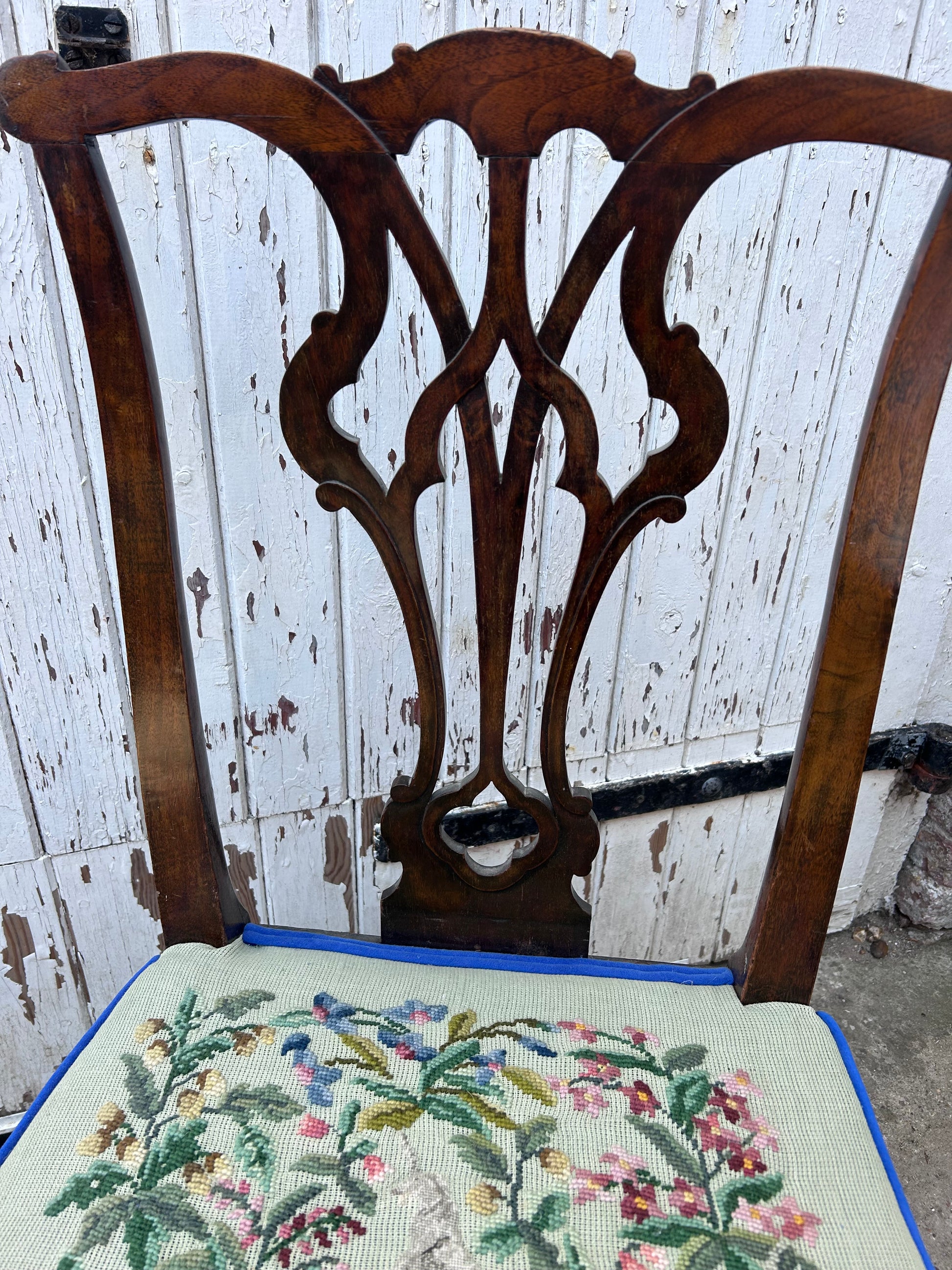 Sturdy and very large comfortable antique chair which has been upholstered in an antique tapestry. The tapestry is such a lovely one featuring all sorts of flowers and leaves as well as a unicorn at the Centre a duck and a rabbit. A good one to have in the hallway