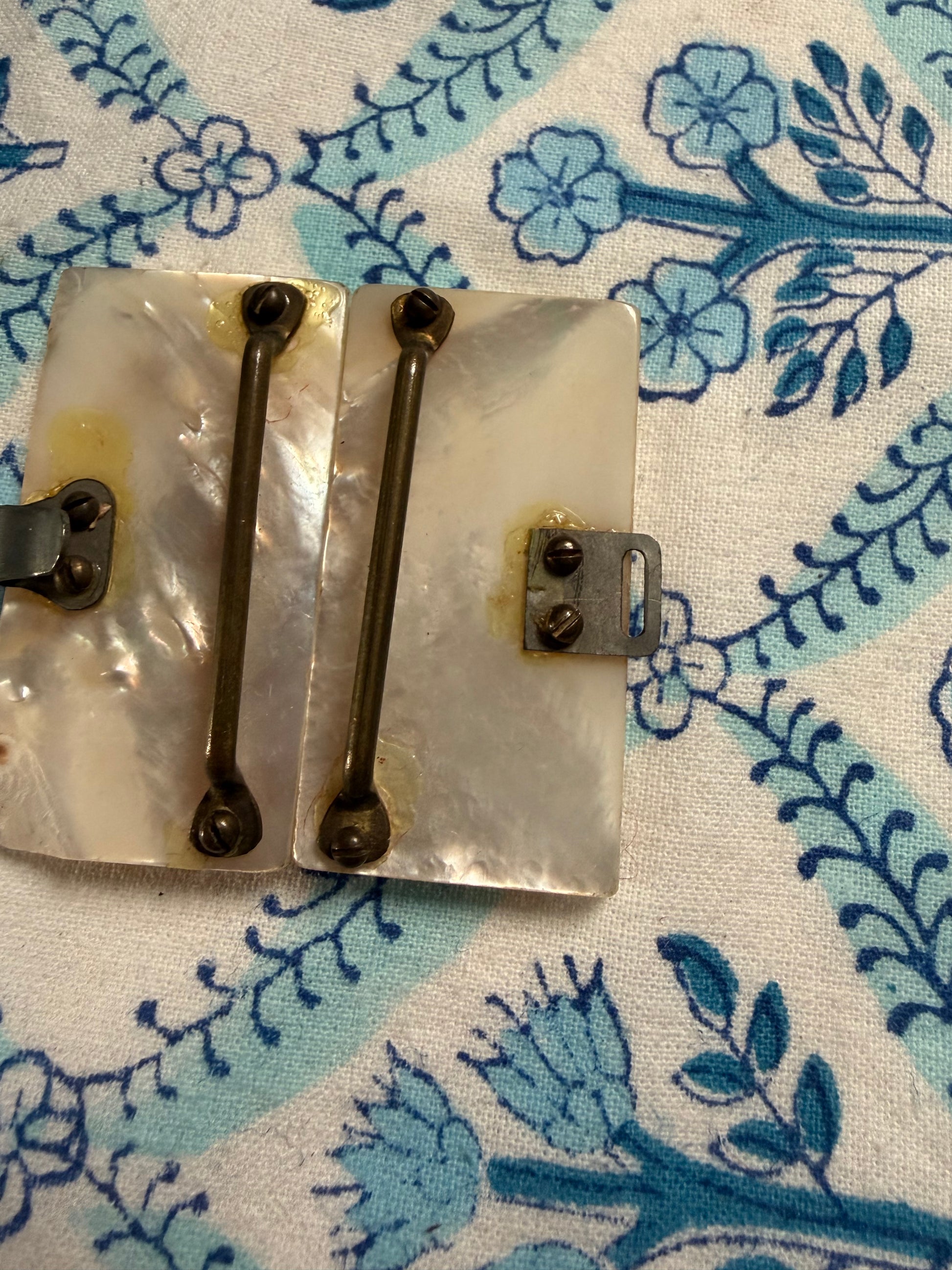 Mother-of-pearl belt buckles measuring 5 cm in length 3 cm in width. Add a pretty ribbon to make a belt.