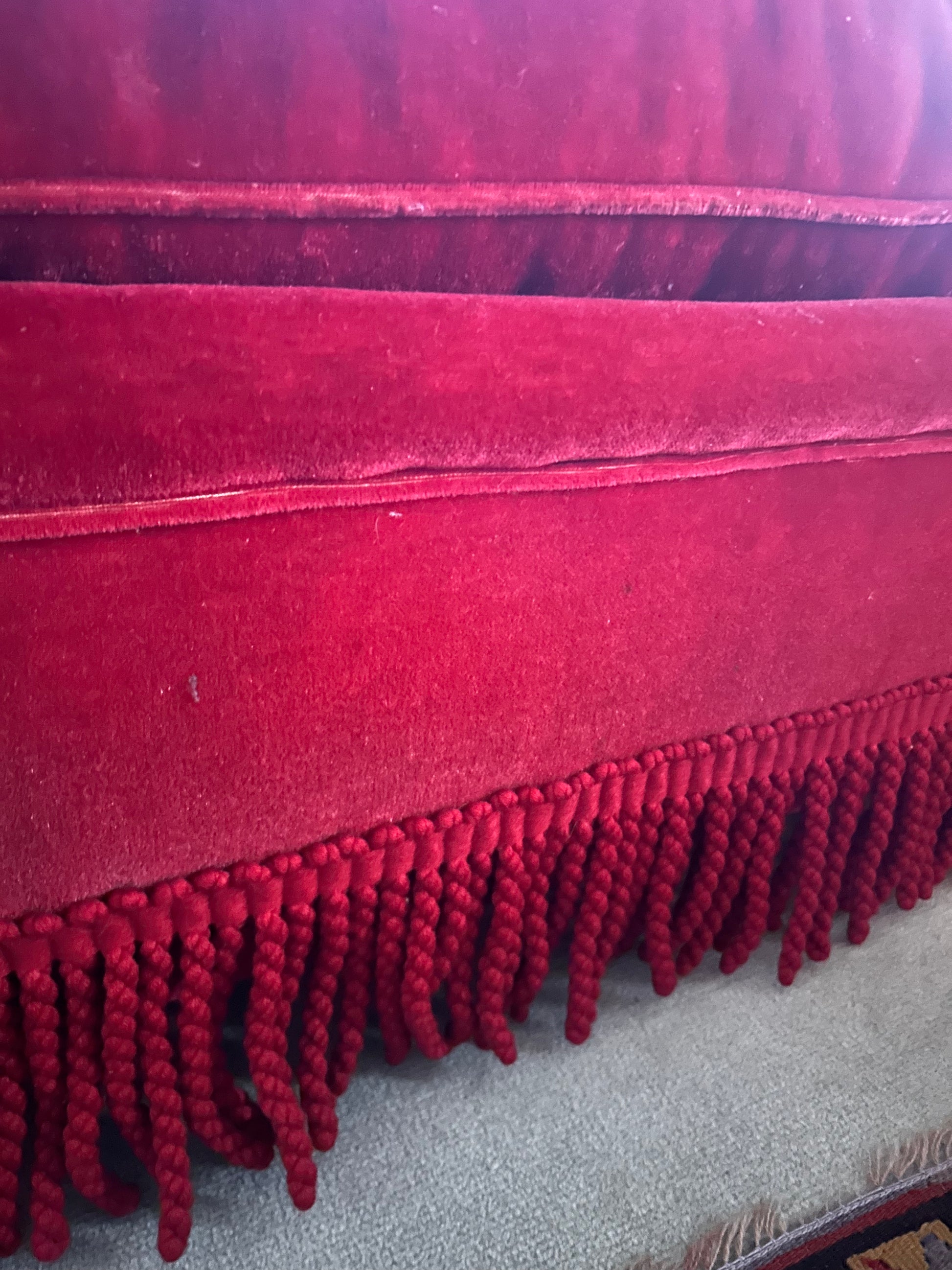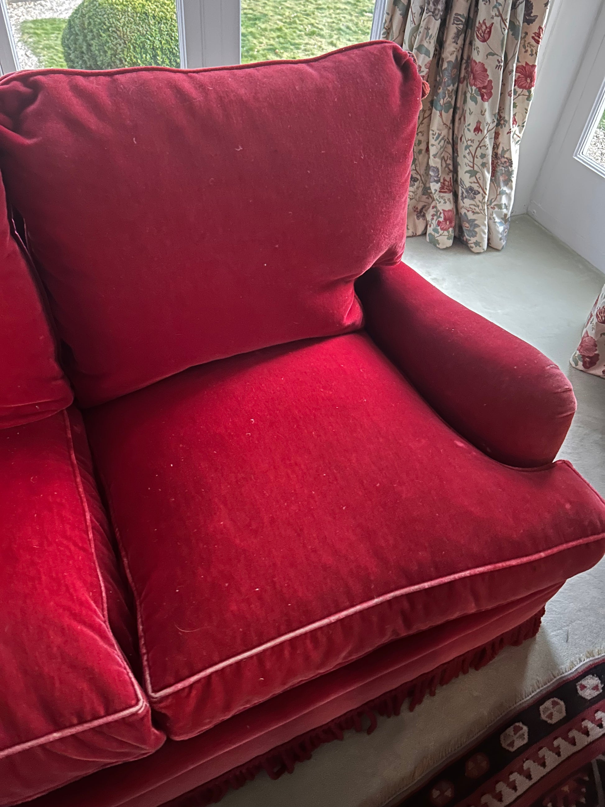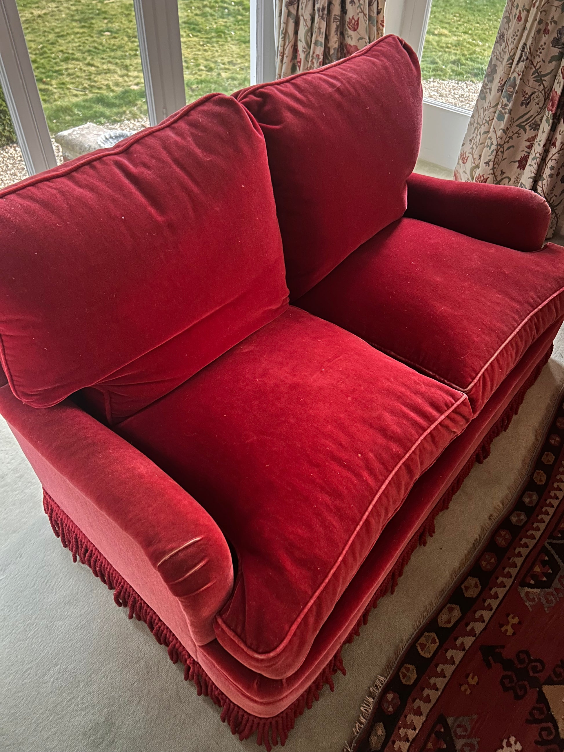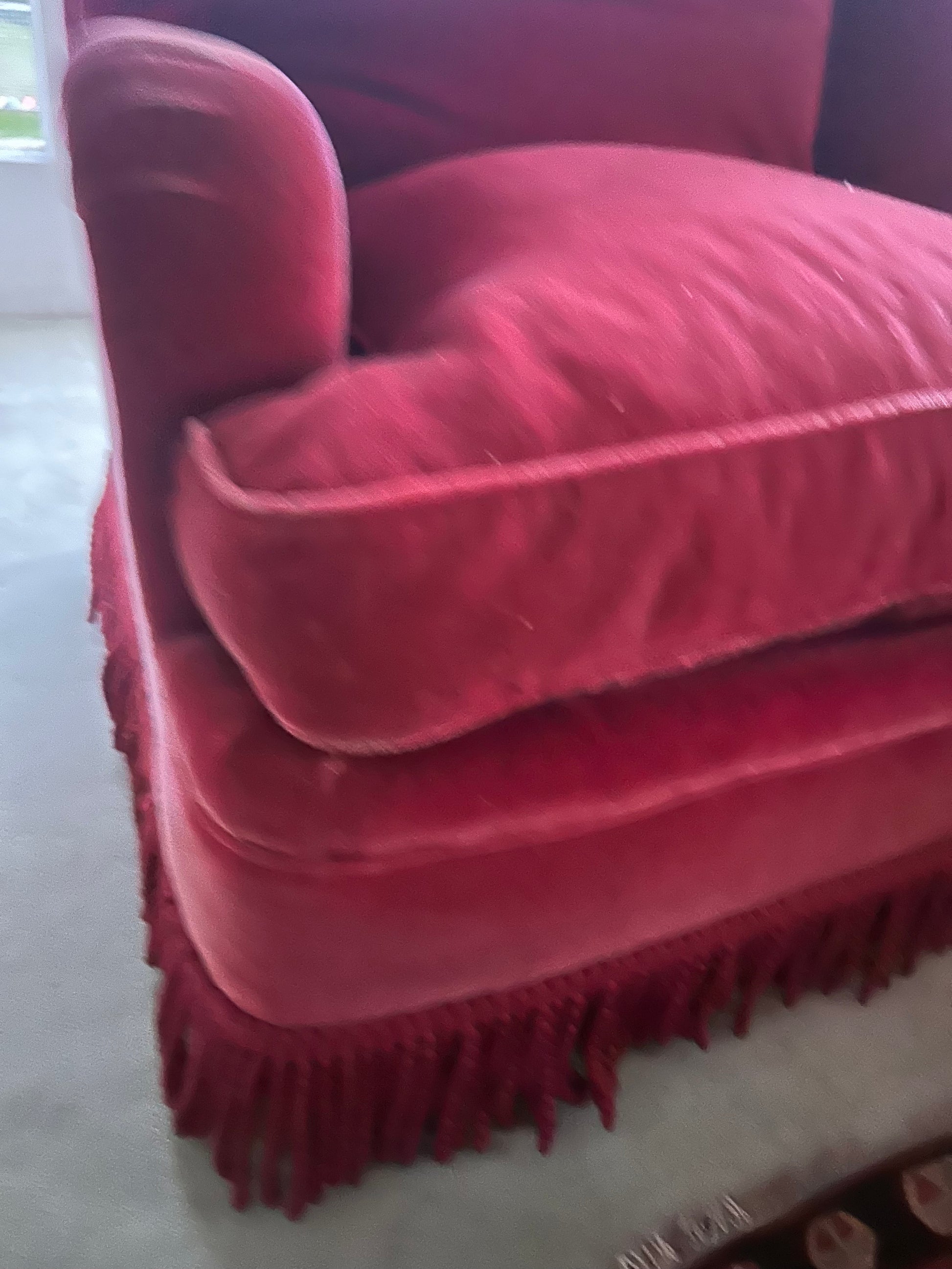 Beautiful Sofa, which Is sturdy good quality Covered in beautiful claret velvet and a lovely deep fringe around the bottom. The upholstery is not new, but an upholsterer has re-stuffed the feather cushions making it even more comfortable! Is 145 the depth is 77 cm height is 73 cm
