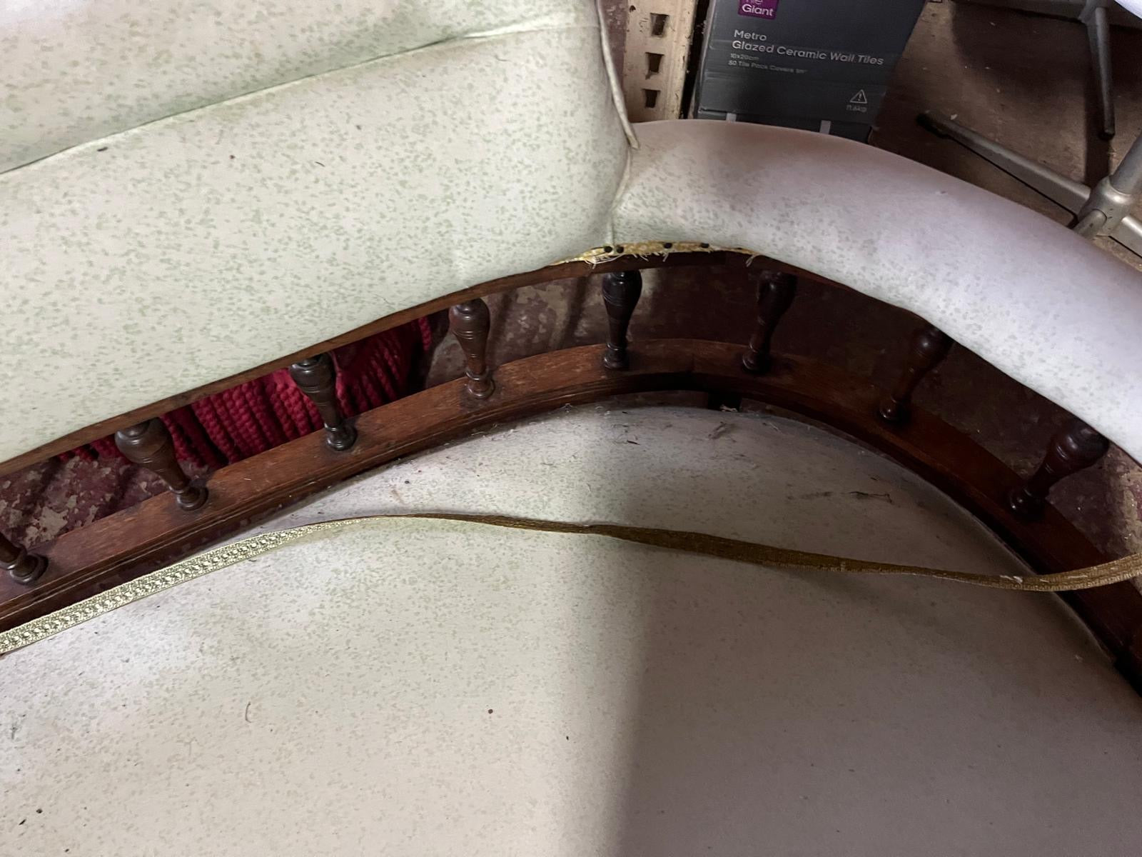 A bedroom sofa in need of upholstery - I would upholster it myself, but I’ve got a queue of about six sofas which I am having covered! This shape isso pretty semi circular. Height 65cms, Length 135cms and width 96cms